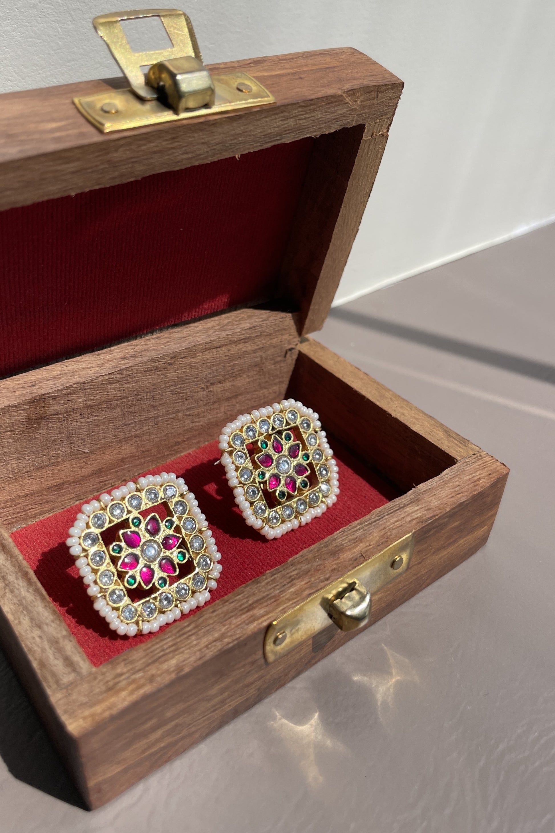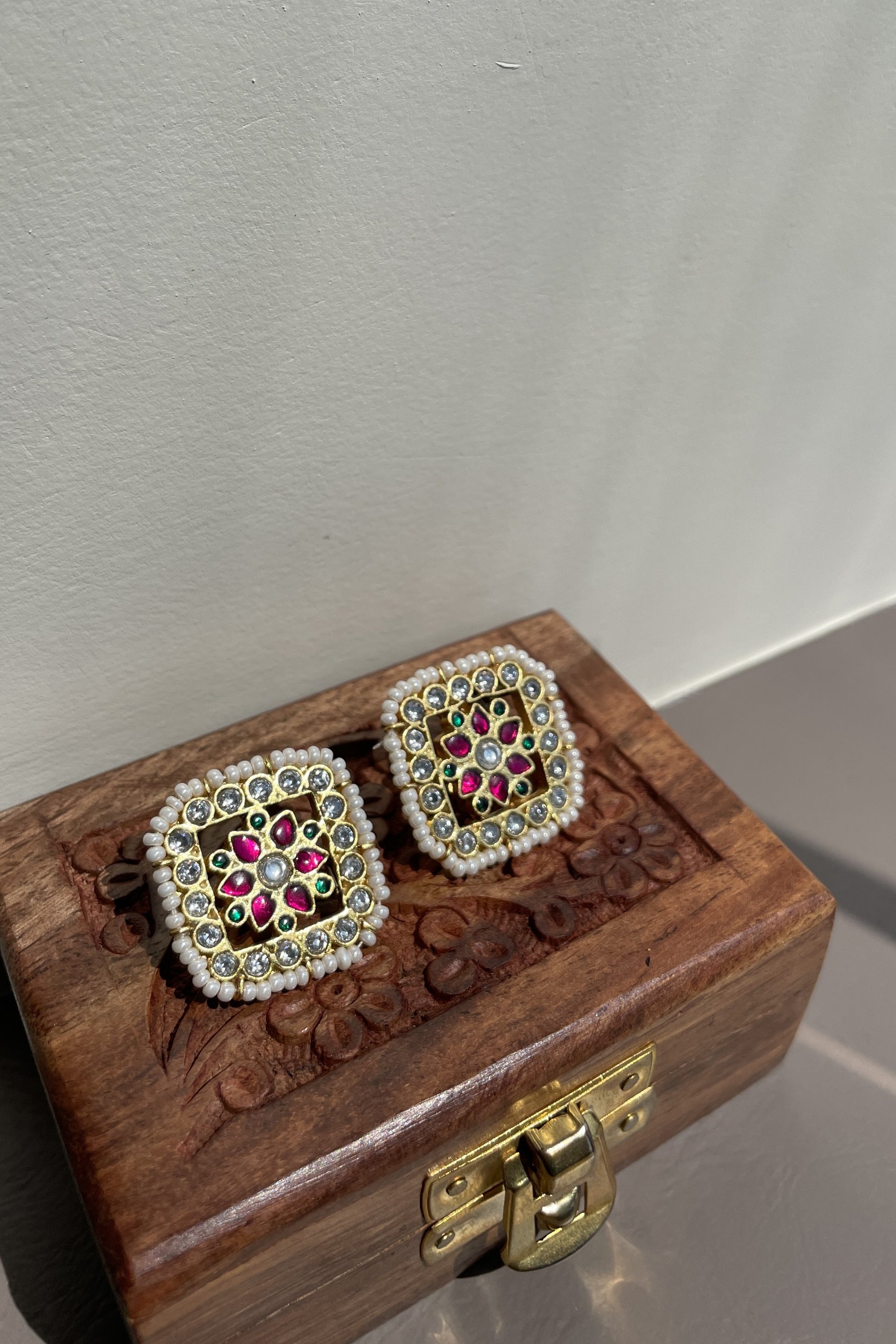 Introducing our Aayat Earstuds, crafted in 925 silver, adorned with a regal array of multicolored Jadau stones in a square shape. Accentuated by a delicate border of seed pearls, these earstuds eloquently embody Indian culture.