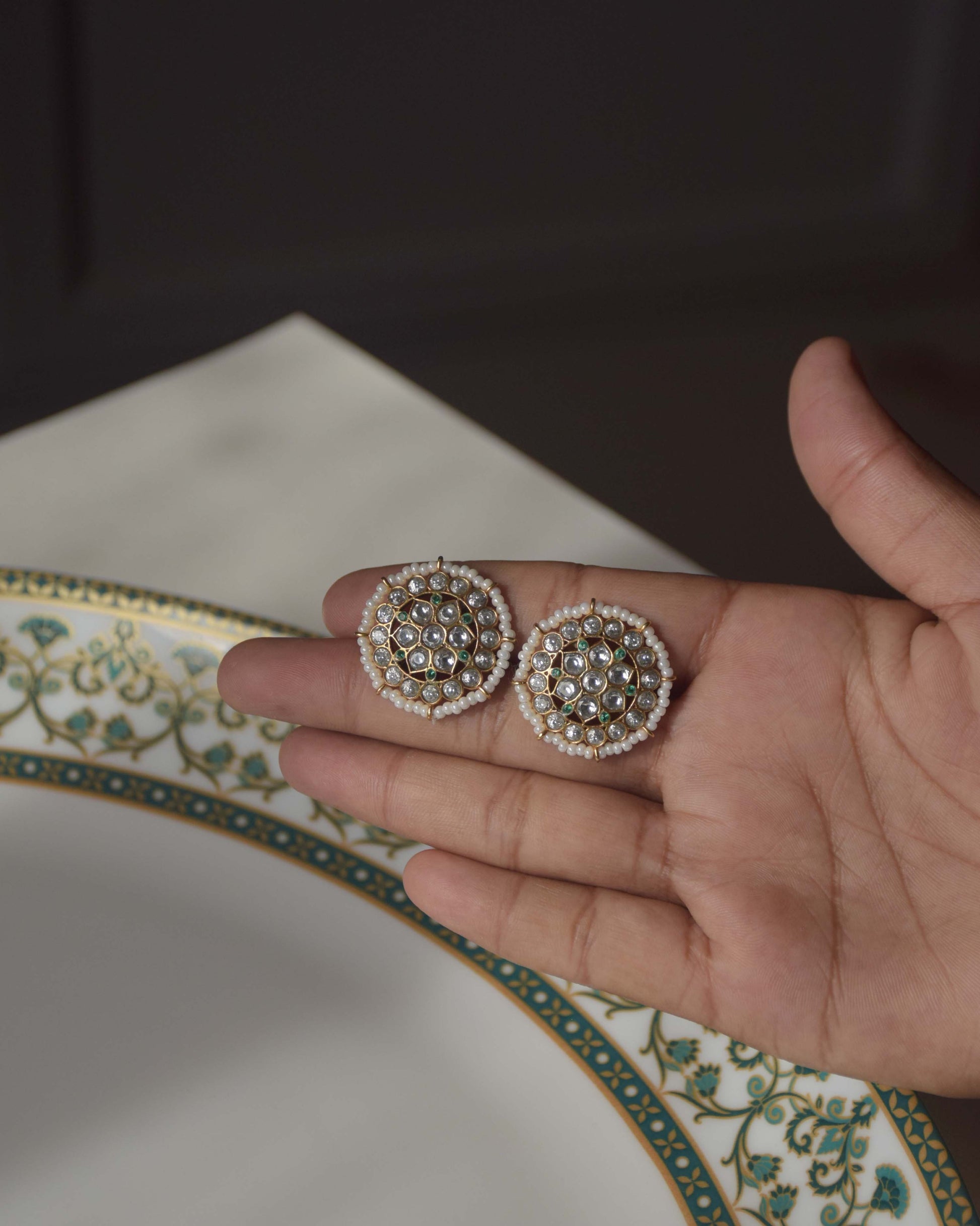 Classic 925 silver ear studs adorned with white jadau stones, showcasing intricate craftsmanship in a round floral design finished with a border of seed pearls. A timeless classic for your collection.