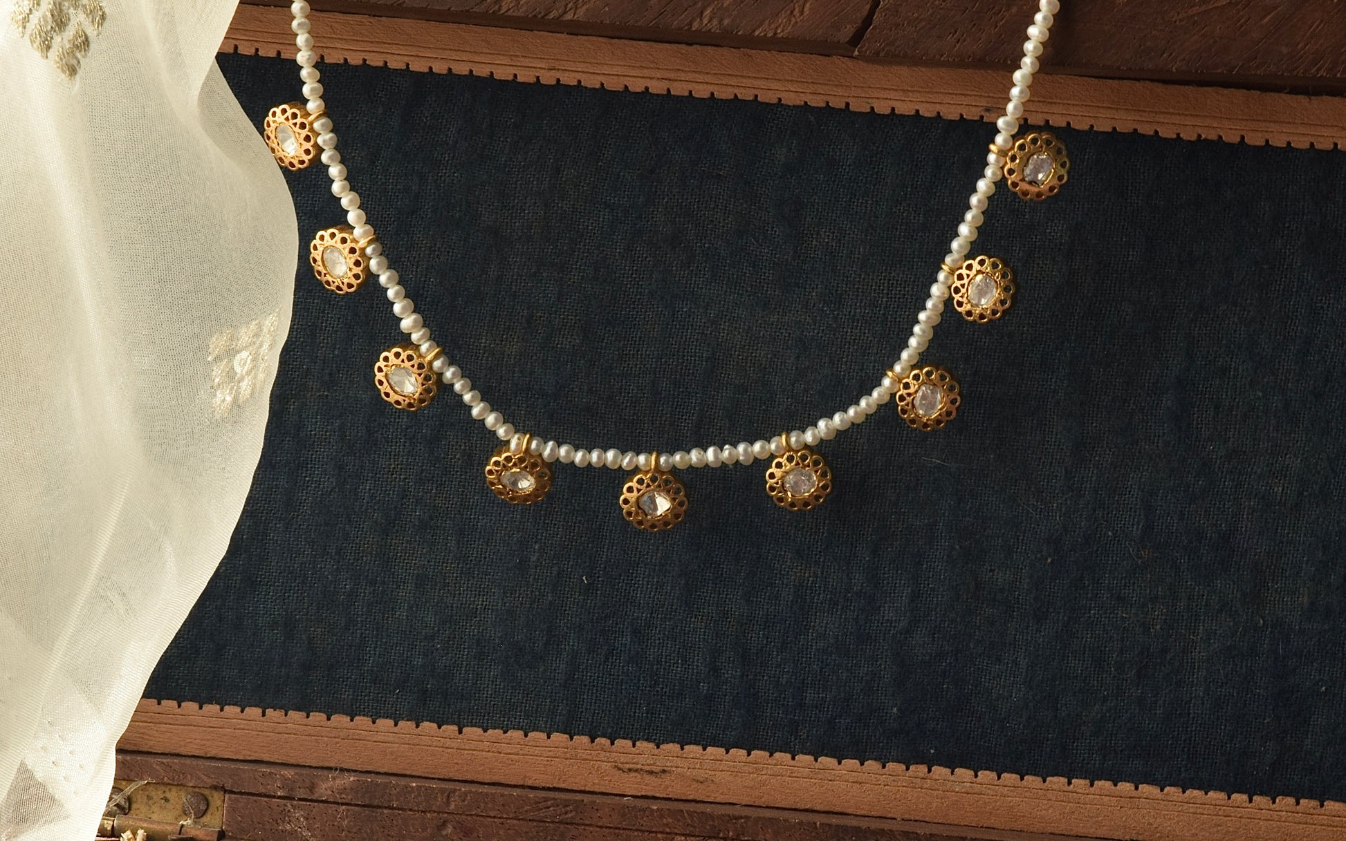 Discover the "BindiyA Necklace," an exquisite work of art in 925 silver with a lustrous gold polish. Admire the intricate craftsmanship in each of its nine units, featuring a single White Jadau stone adorned with meticulous gold wire work. Gracefully hanging from a string of delicate freshwater pearls, this necklace exudes timeless elegance.