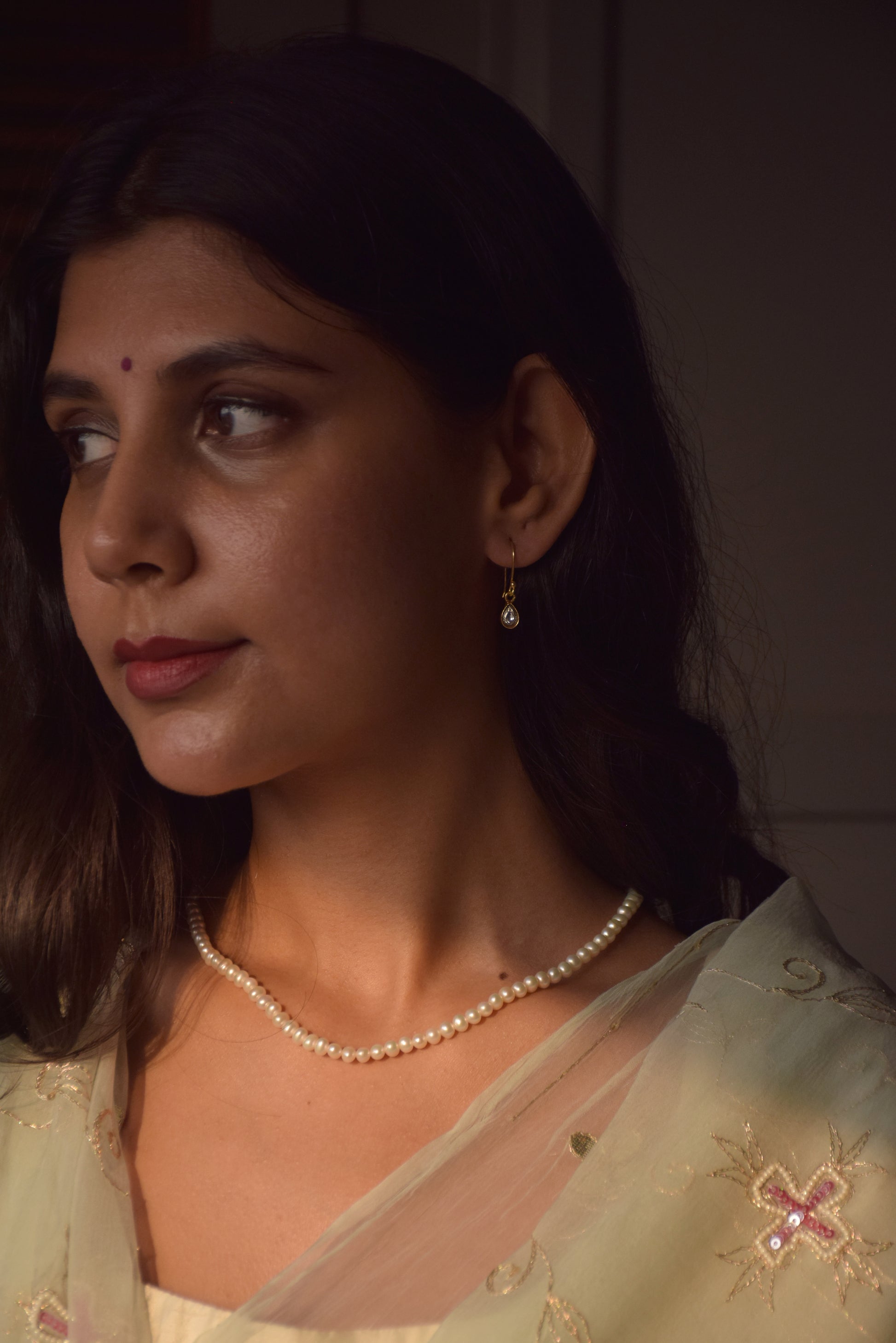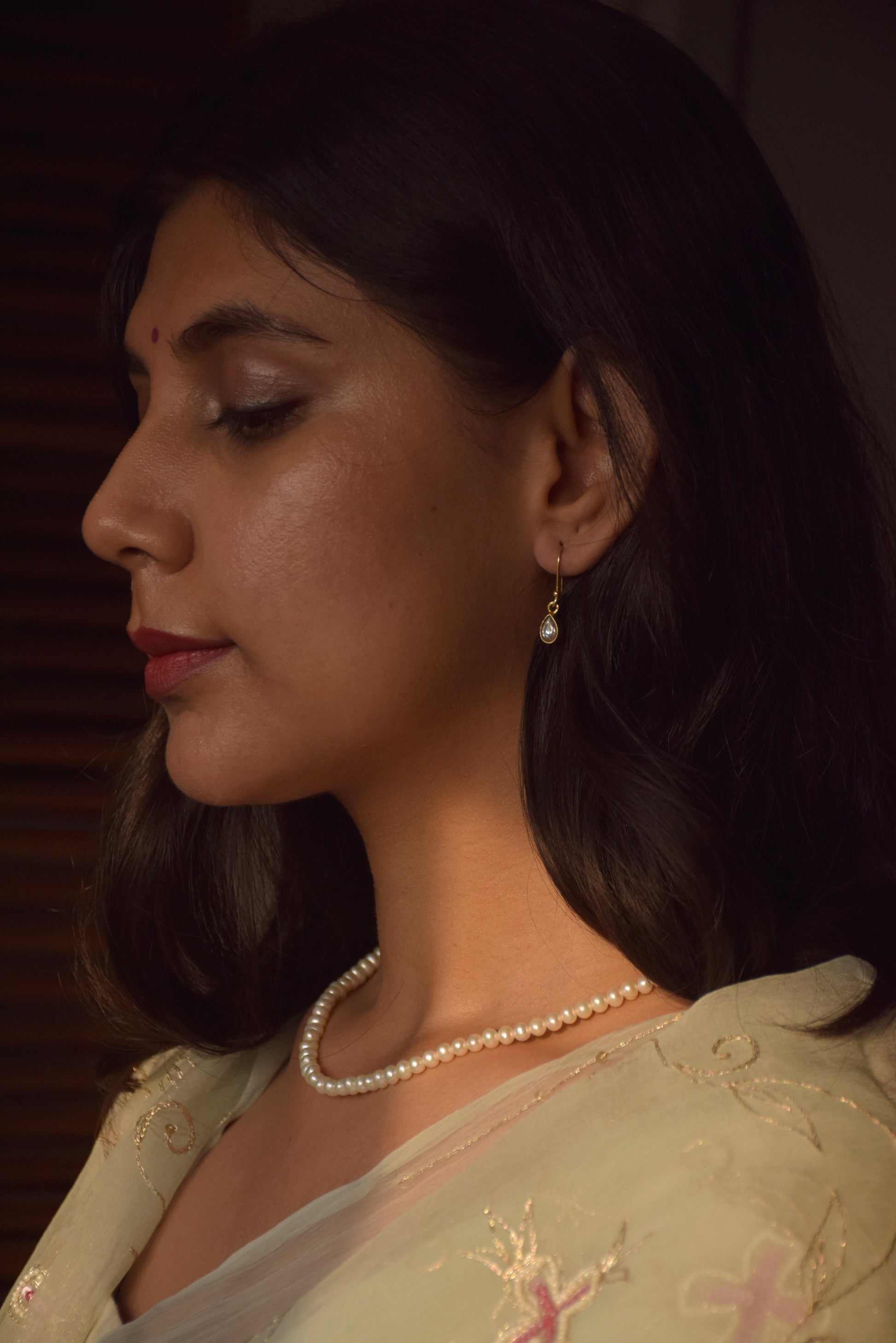 A delicate Jadau stone, cut in a graceful drop shape, dangles from a fish hoop, carefully crafted in 925 silver. This minimalistic beauty carries a touch of Indian charm, making it suitable for any occasion. It effortlessly complements both contemporary and traditional Indian outfits, making it a versatile go-to piece for any style.