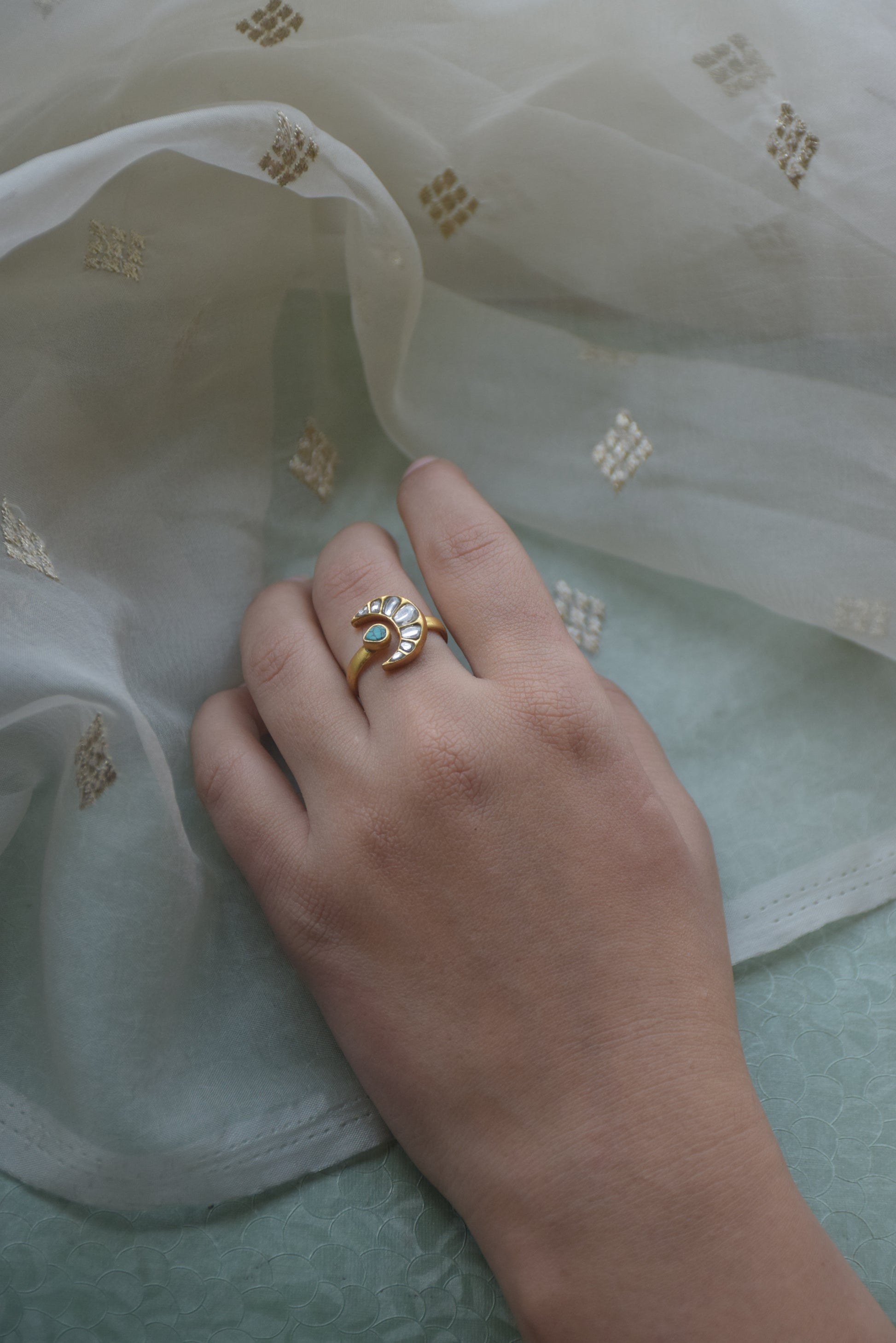 The Chand Firoza adjustable ring, a 925 silver masterpiece with 22-karat gold plating, showcase a minimalistic design featuring Jadau chand adorned with pristine white Jadau stones and a captivating Firoza stone at their center.