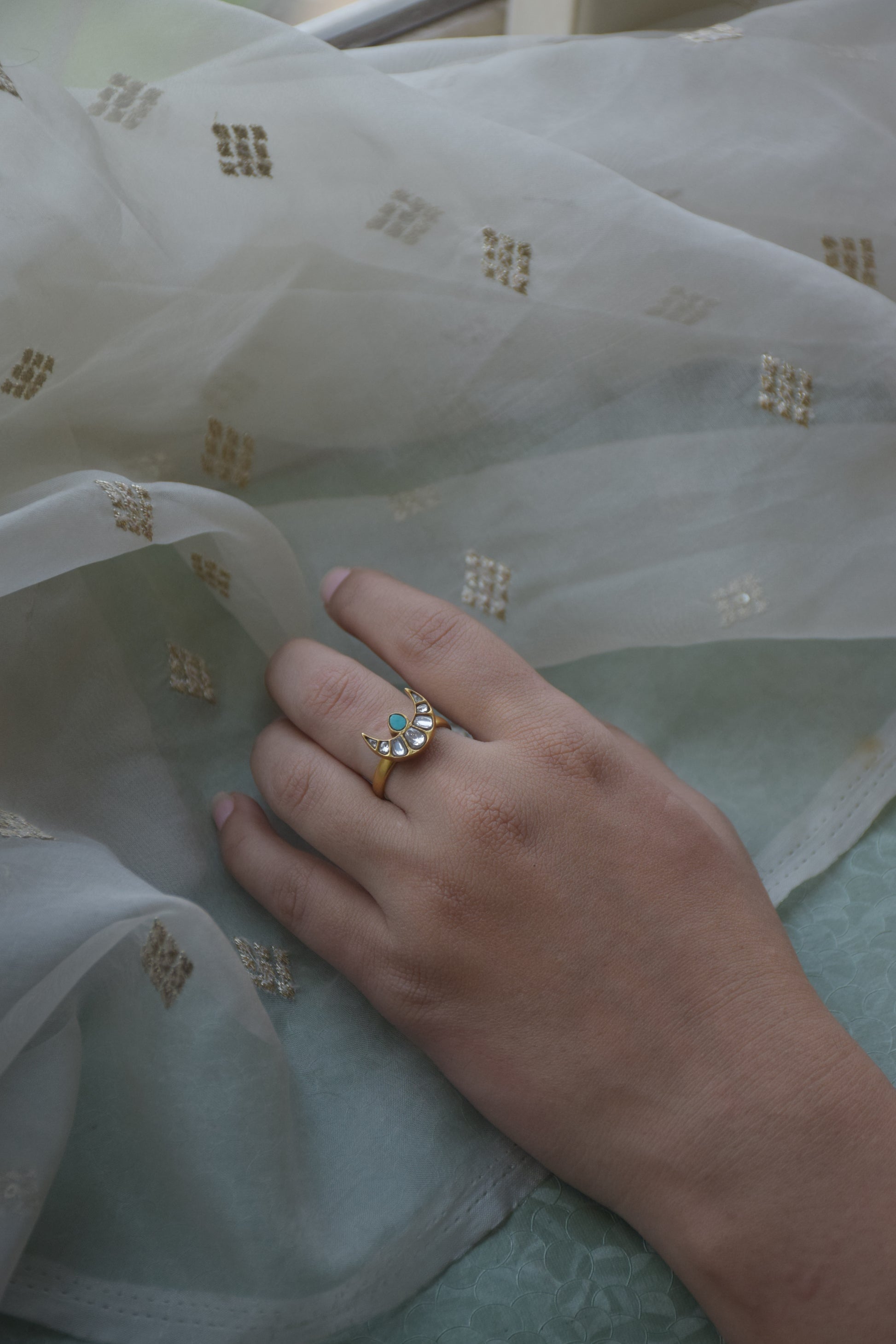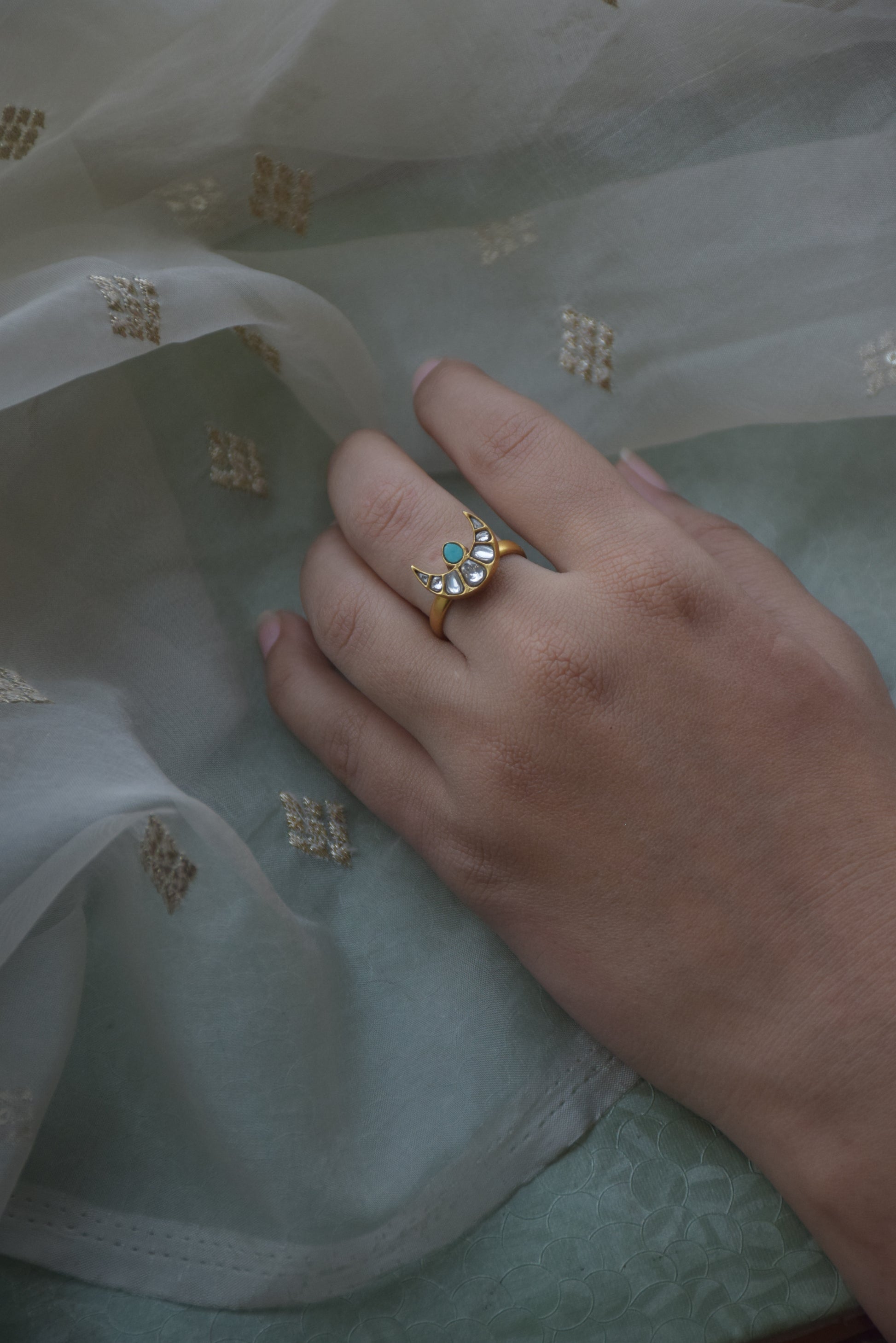 The Chand Firoza ring, a 925 silver masterpiece with 22-karat gold plating, showcase a minimalistic design featuring Jadau chand adorned with pristine white Jadau stones and a captivating Firoza stone at their center.