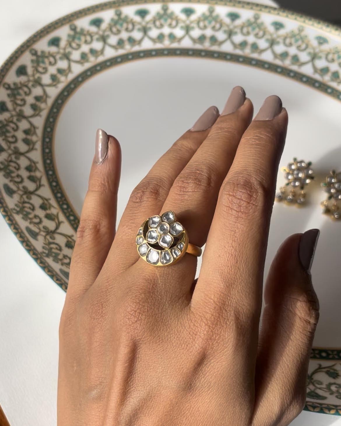 With meticulous craftsmanship in 925 silver and 22-carat gold plating, the timeless Chand motif transports us to days of old, reminiscent of cherished memories of your grandmother's jewelry. Adorned with exquisite jadau stones, the Chand Sitara Ring is the perfect accessory for your timeless look, especially when paired with a pastel chiffon saree.