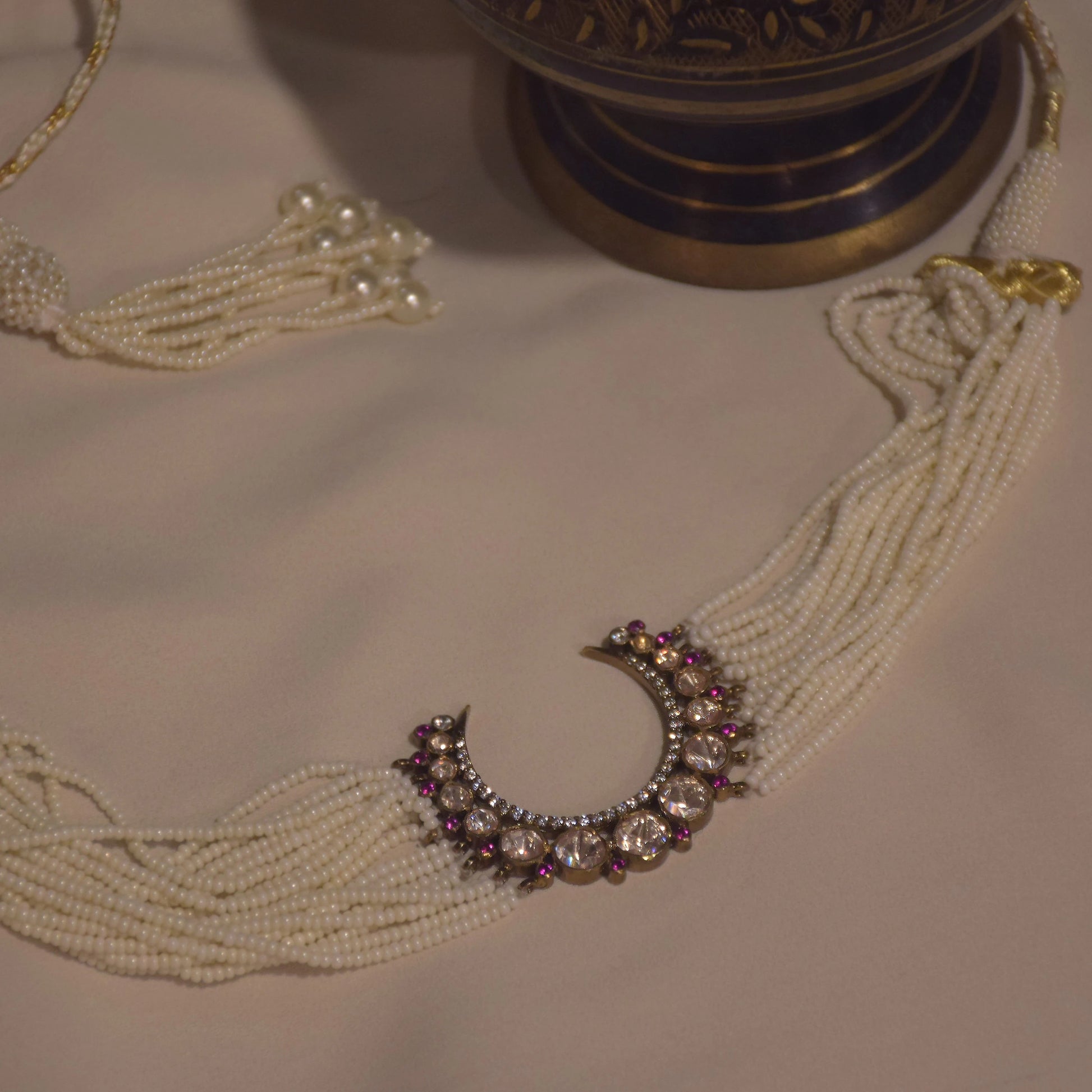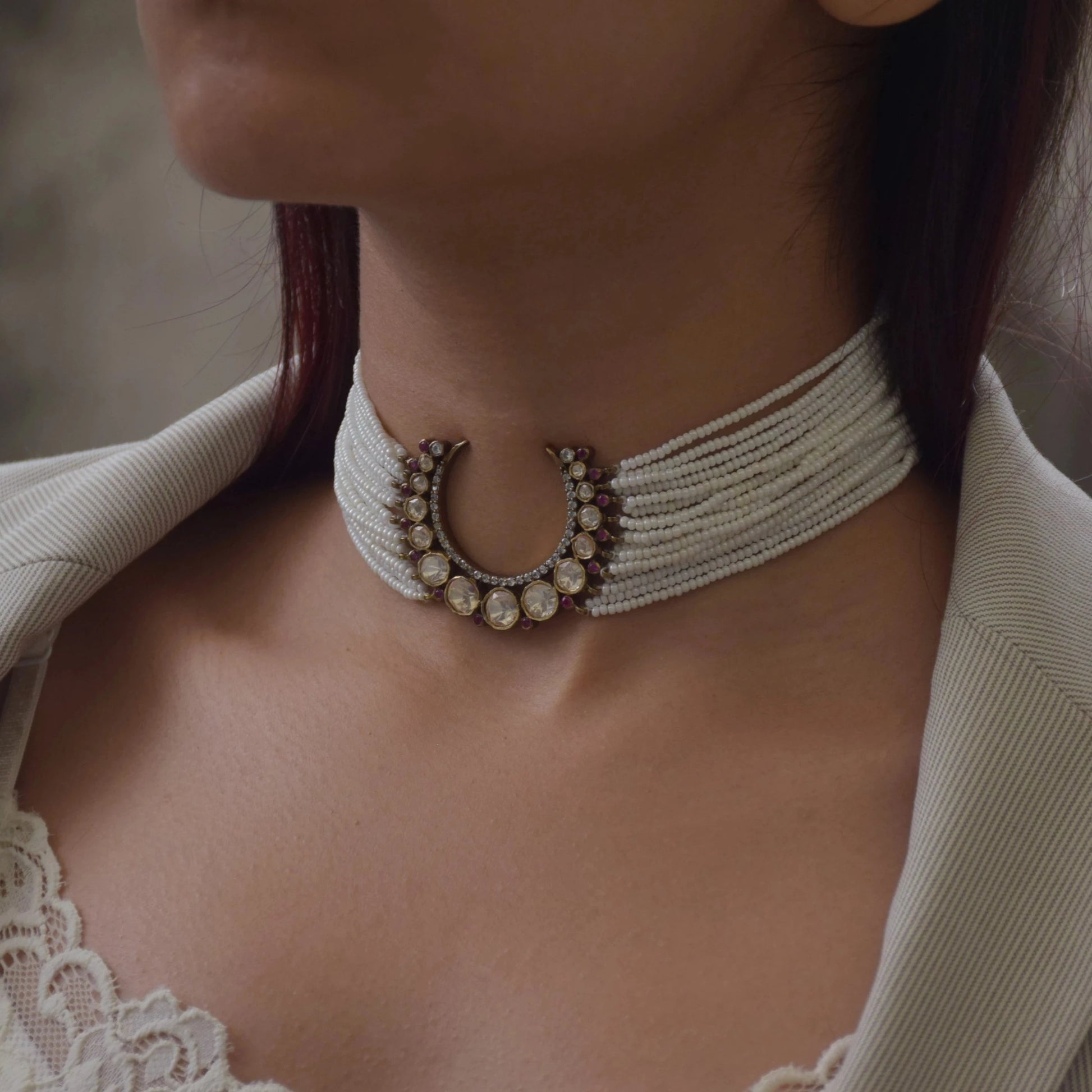 Elevate your style with the Chandramukhi Choker, an exquisite 925 silver masterpiece adorned with dazzling polki stones and a Victorian polish. Its enchanting Belur polki crescent moon design, complemented by delicate pink ad stones, makes it the ultimate statement jewel for any soirée.
