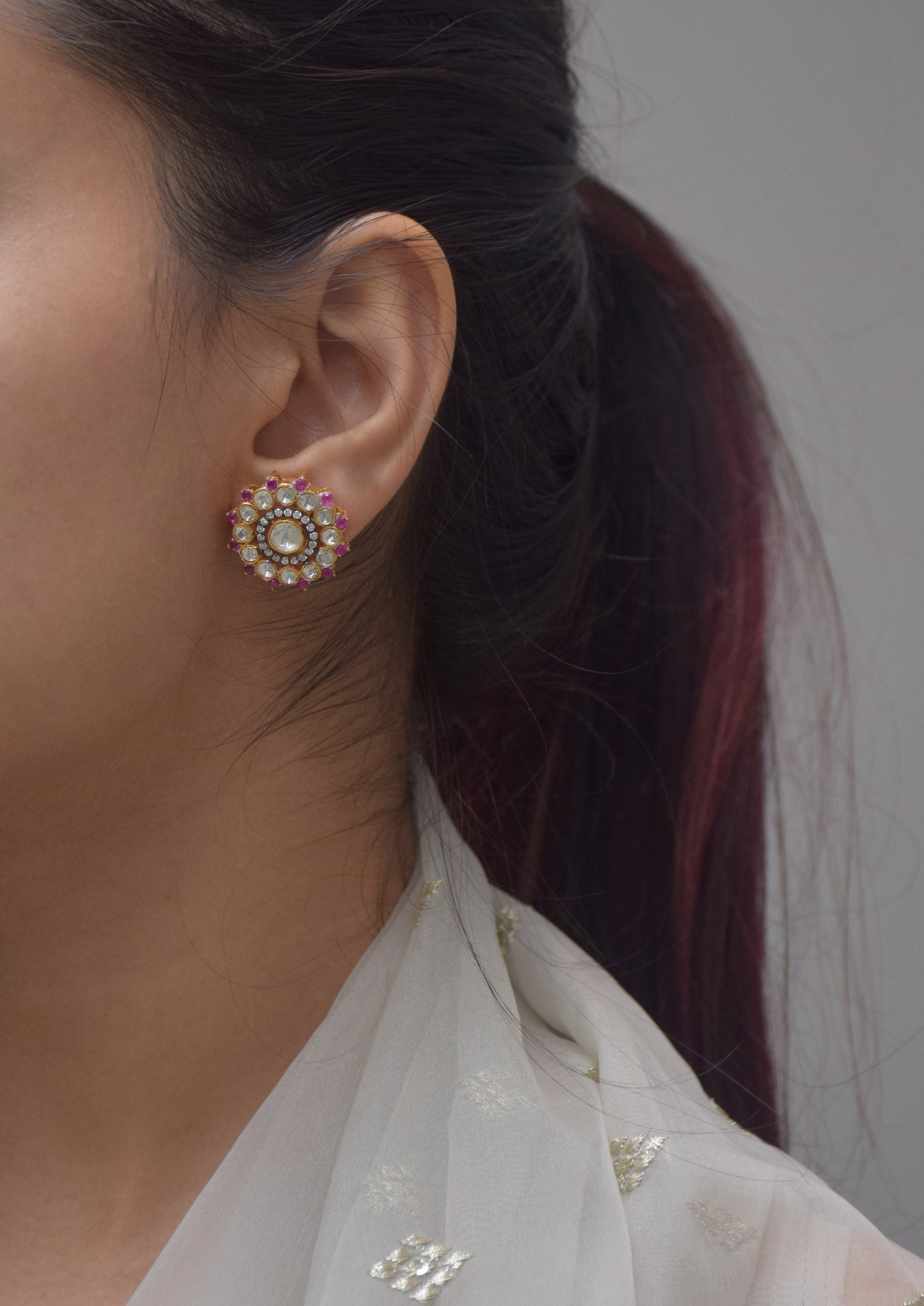 Sculpted from 925 silver, the 'Saanjh' earstuds feature stunning Polkis arranged in a floral motif, enhanced by vibrant pink ad stones. We envision these exquisite earstuds pairing harmoniously with elegant black organza sarees or chic satin shirts.