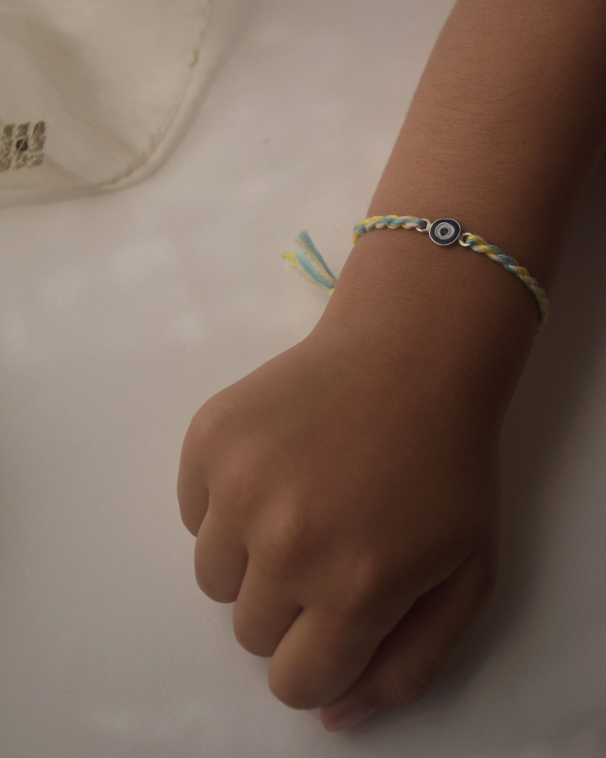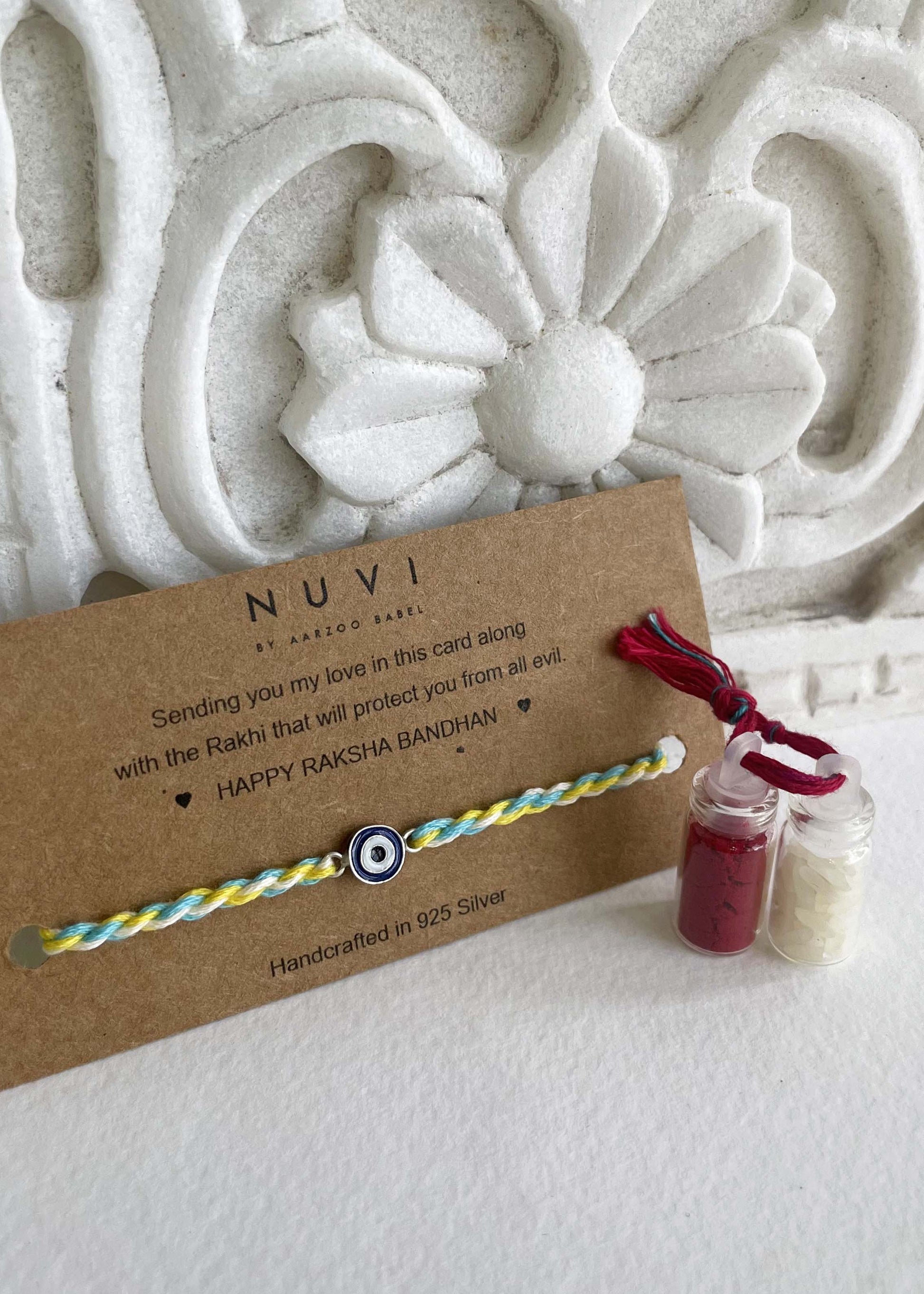 Introducing our adorable 925 silver Rakhi specially designed for kids – adorned with a tiny enamel evil eye to bring good luck to the wearer.