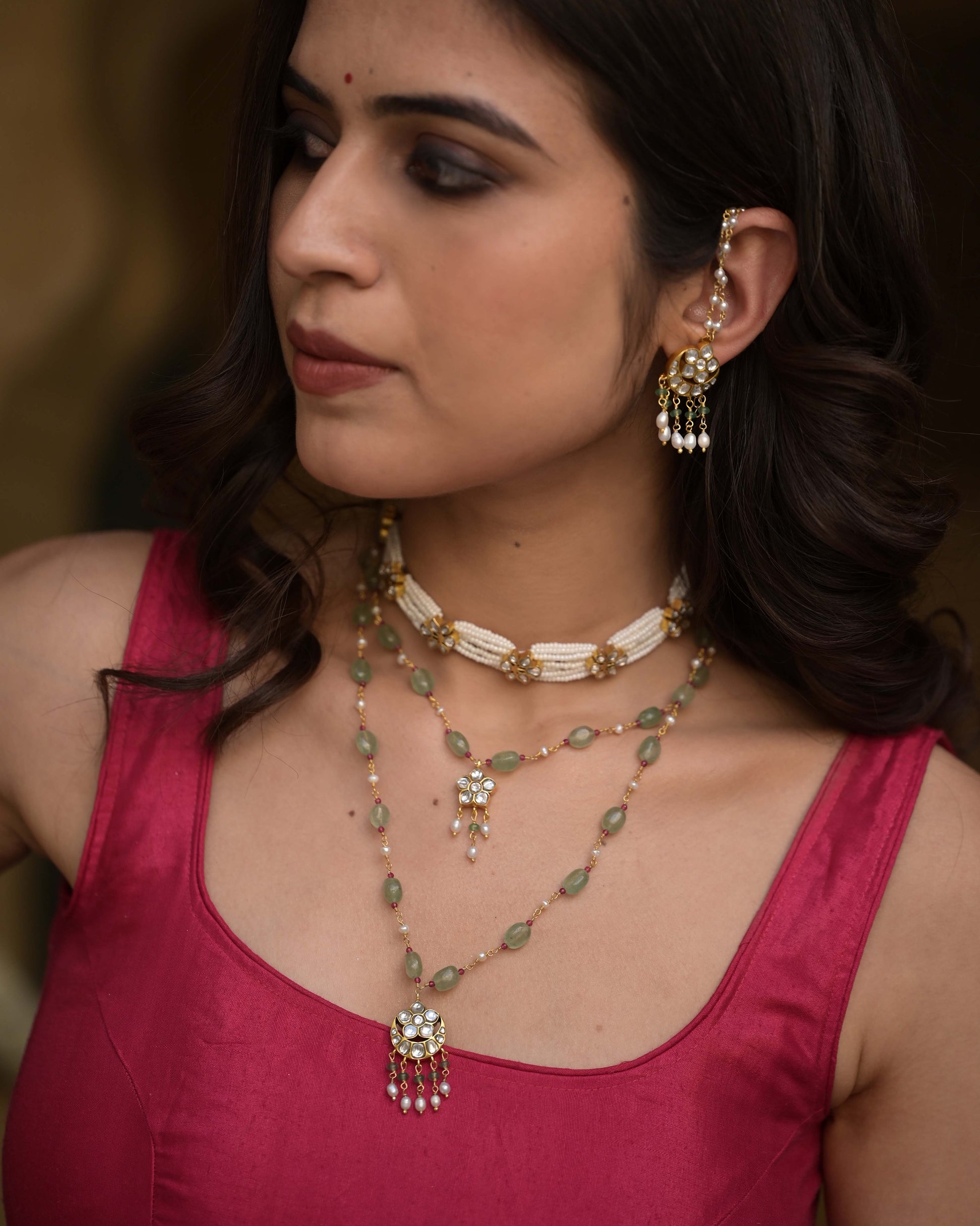 The captivating feature of this necklace lies in its two malas, combining aventurine beads, glass-filled ruby beads, and freshwater pearls. Ideal for infusing elegance into your attire, this versatile piece effortlessly complements both a crisp white shirt and a solid Banarsi kurti, ensuring a refined and sophisticated look.