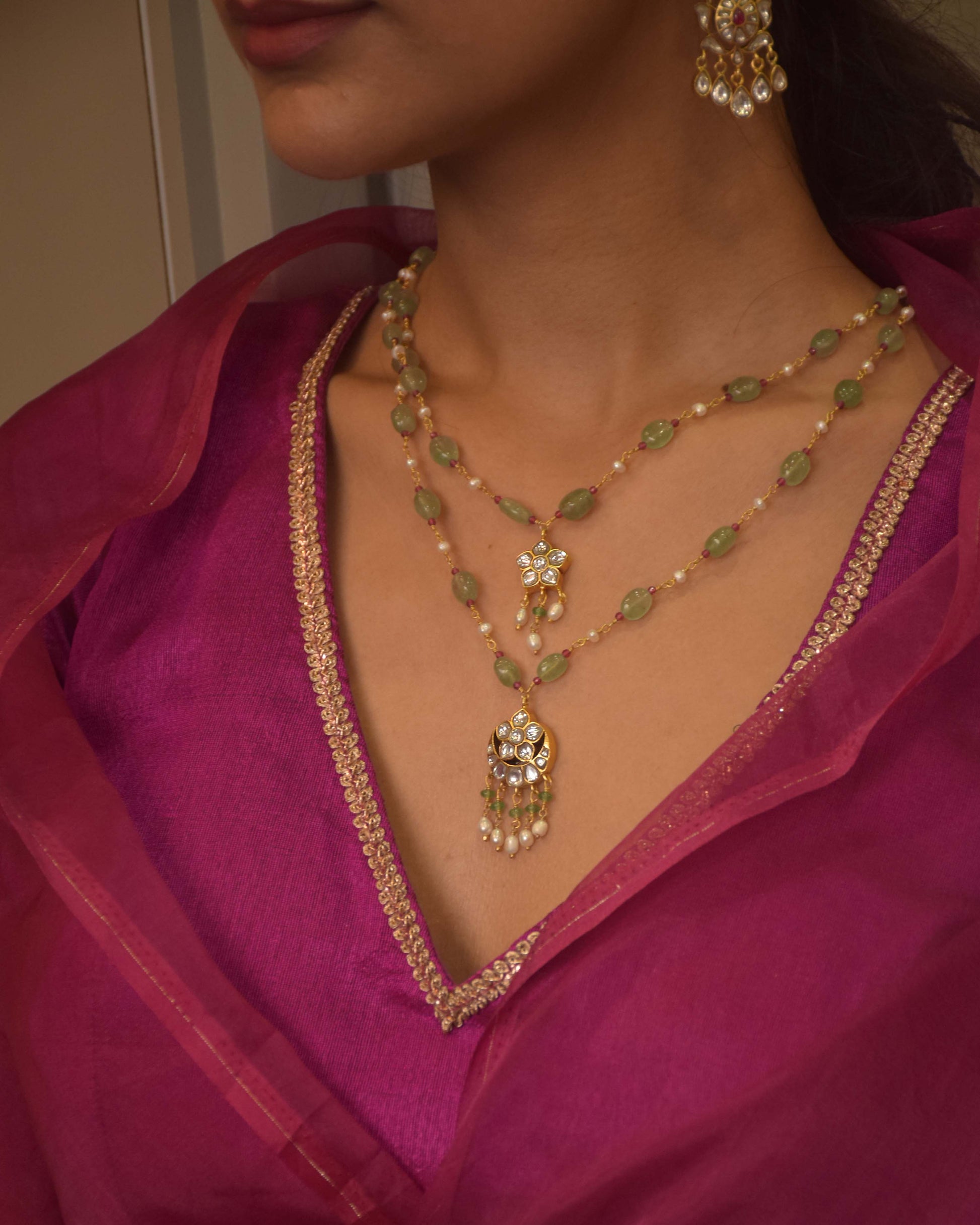 Presenting a minimalist interpretation of the two-layered necklace, each strand featuring a single pendant at its center, inspired by classic Indian motifs.