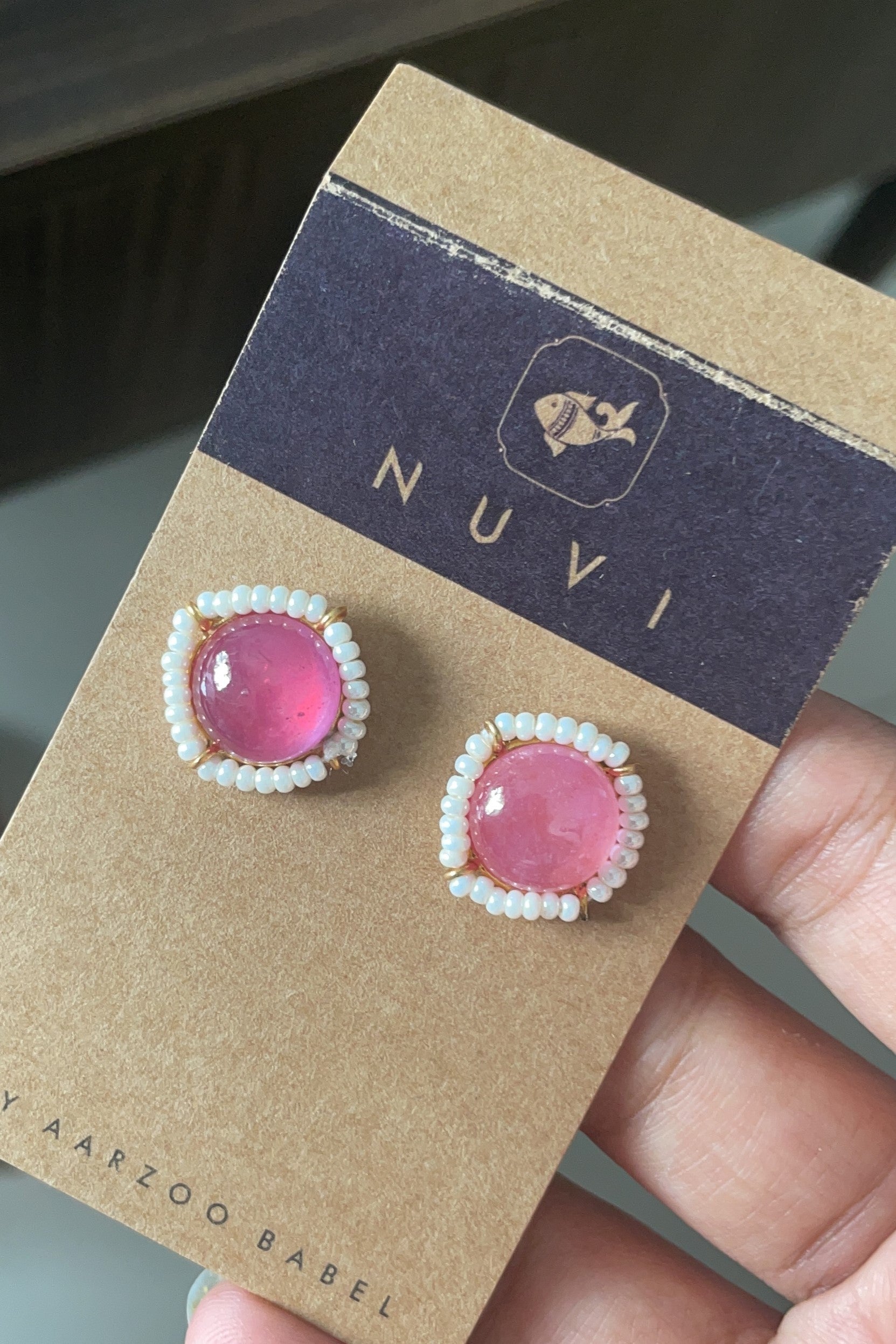 Introducing our Gulabi Earstuds, featuring a stunning strawberry quartz stone accented by a delicate line of seed pearls. These minimal studs add a touch of elegance to your casual attire.