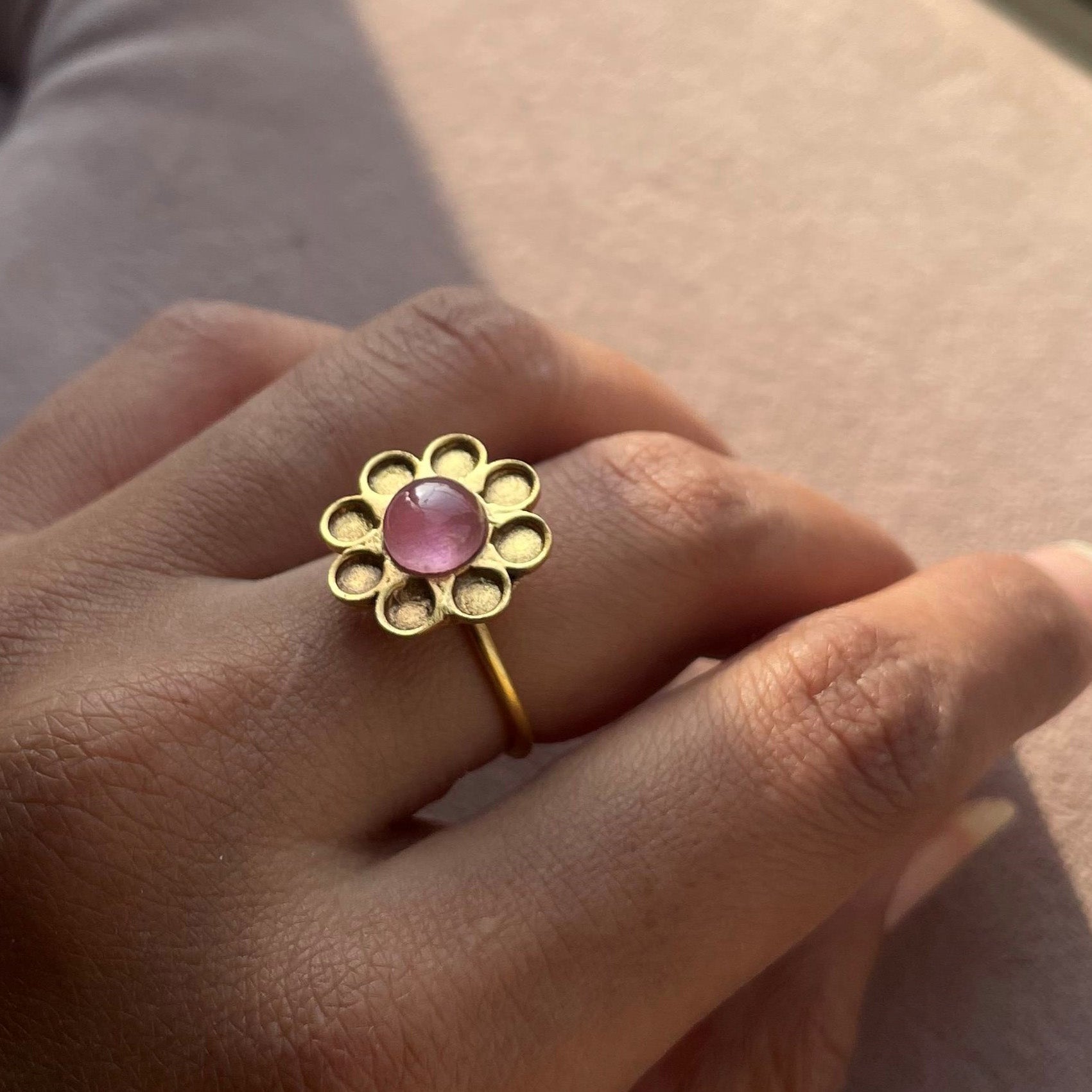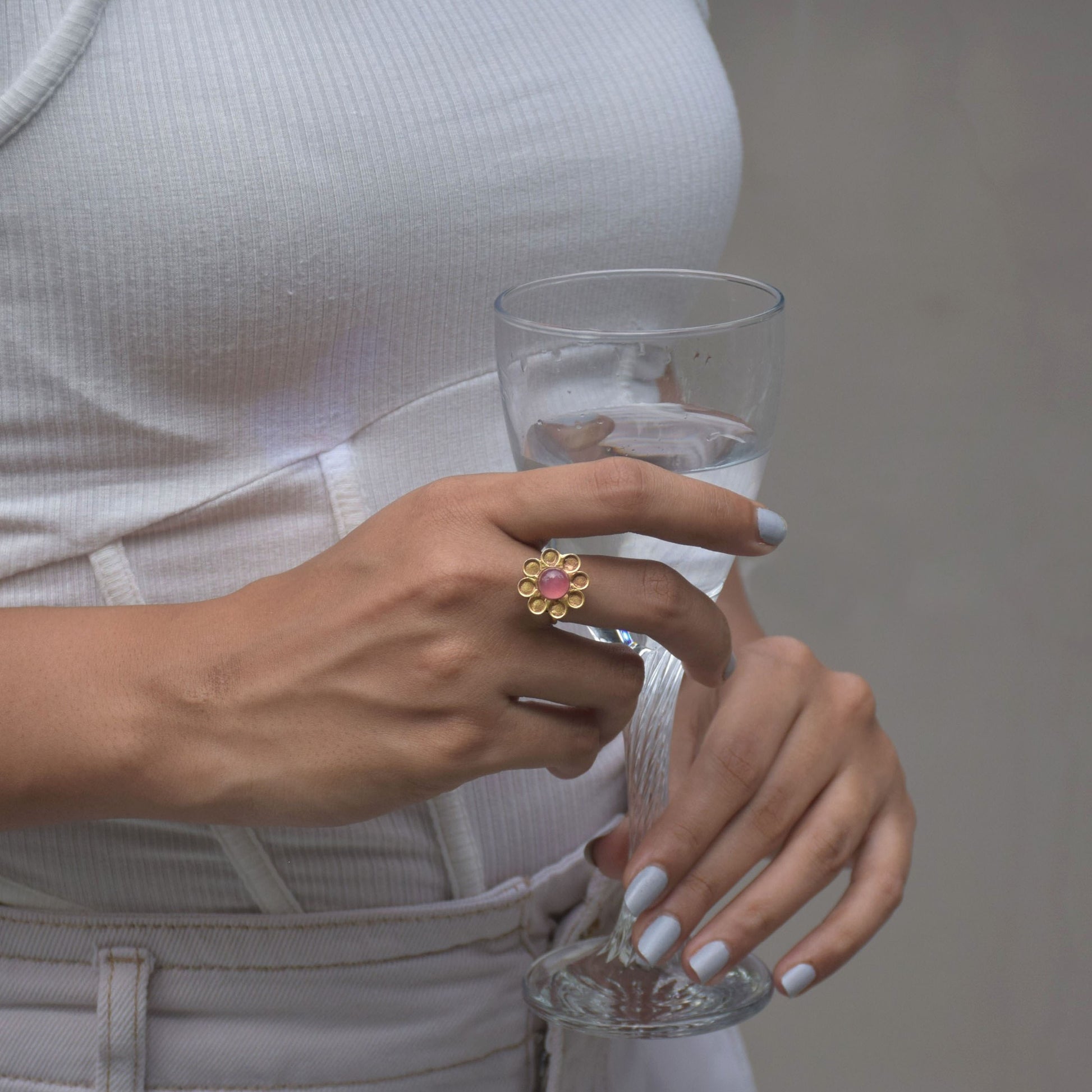The Delicate Gulabi Ring features a stunning rose quartz gracefully encased within a gold flower. This ring is the epitome of sophistication and minimalistic elegance, making it your ideal go-to accessory for a classy and smart touch of timeless beauty.