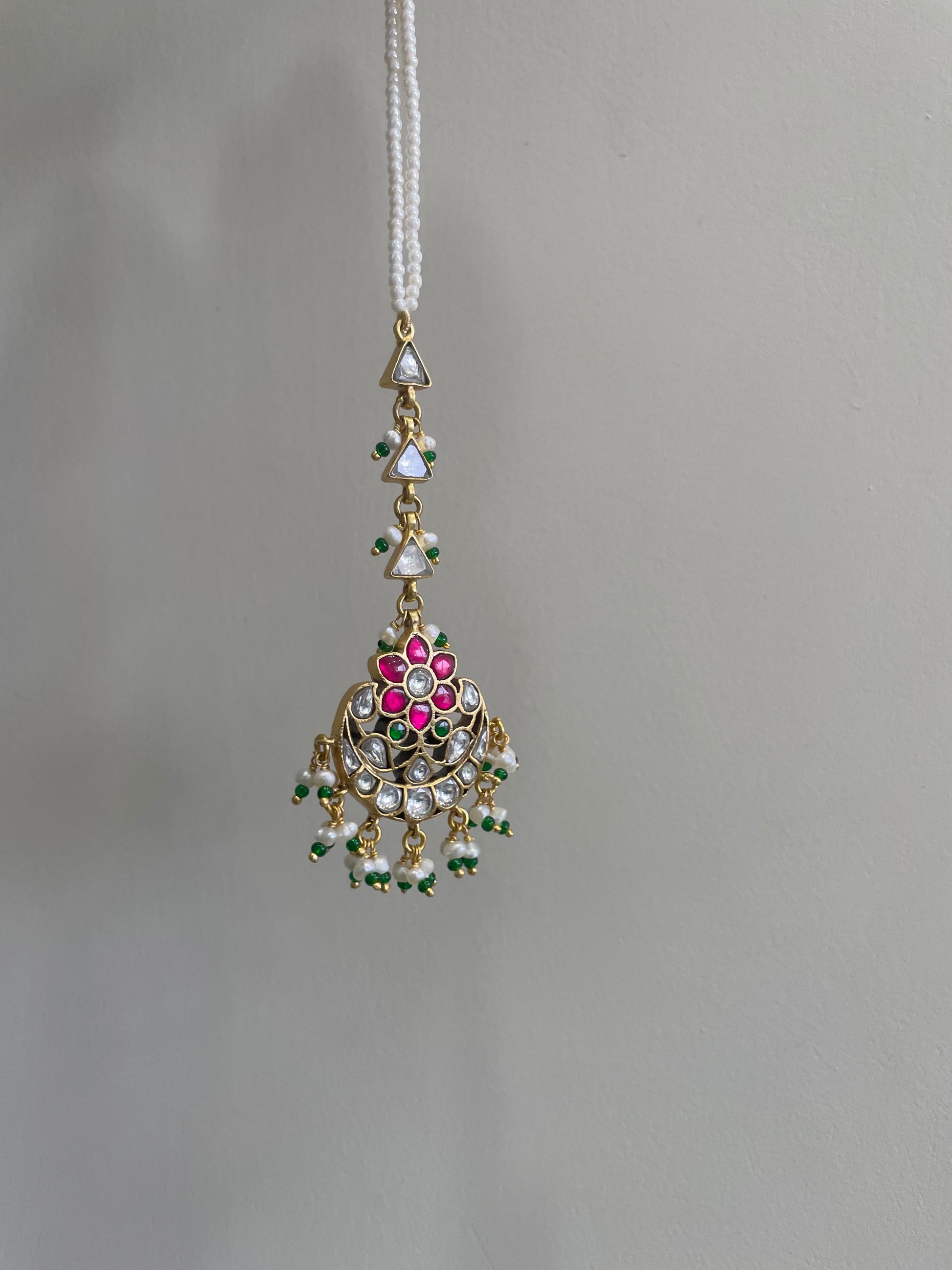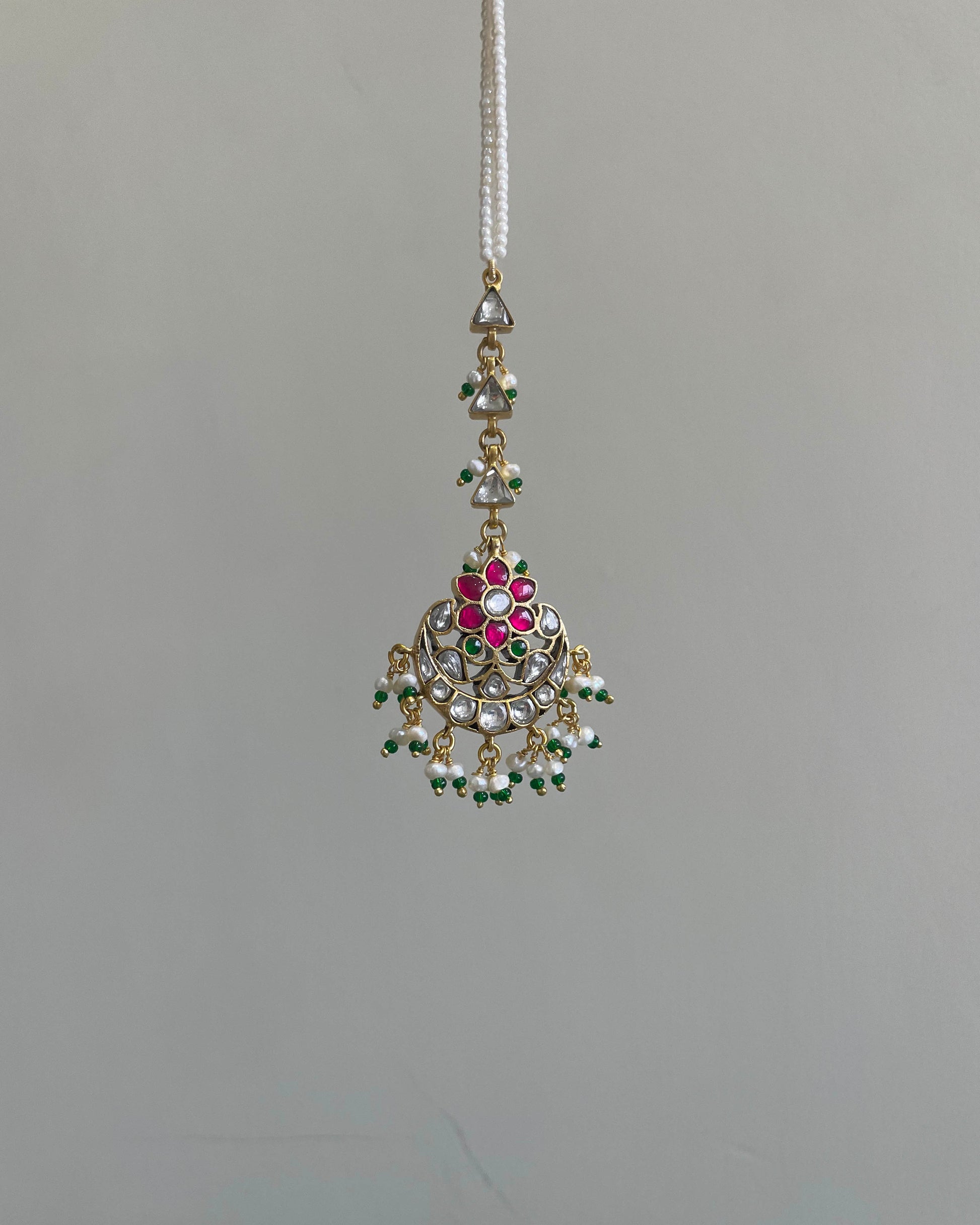 Introducing the exquisite "Rajlakshmi Maangtika," meticulously handcrafted in 925 silver. Its centerpiece boasts exquisite chand shape motif adorned with captivating green, pink, and white Jadau stones, while delicate freshwater pearls gracefully cascade, adding a touch of timeless charm to your look.