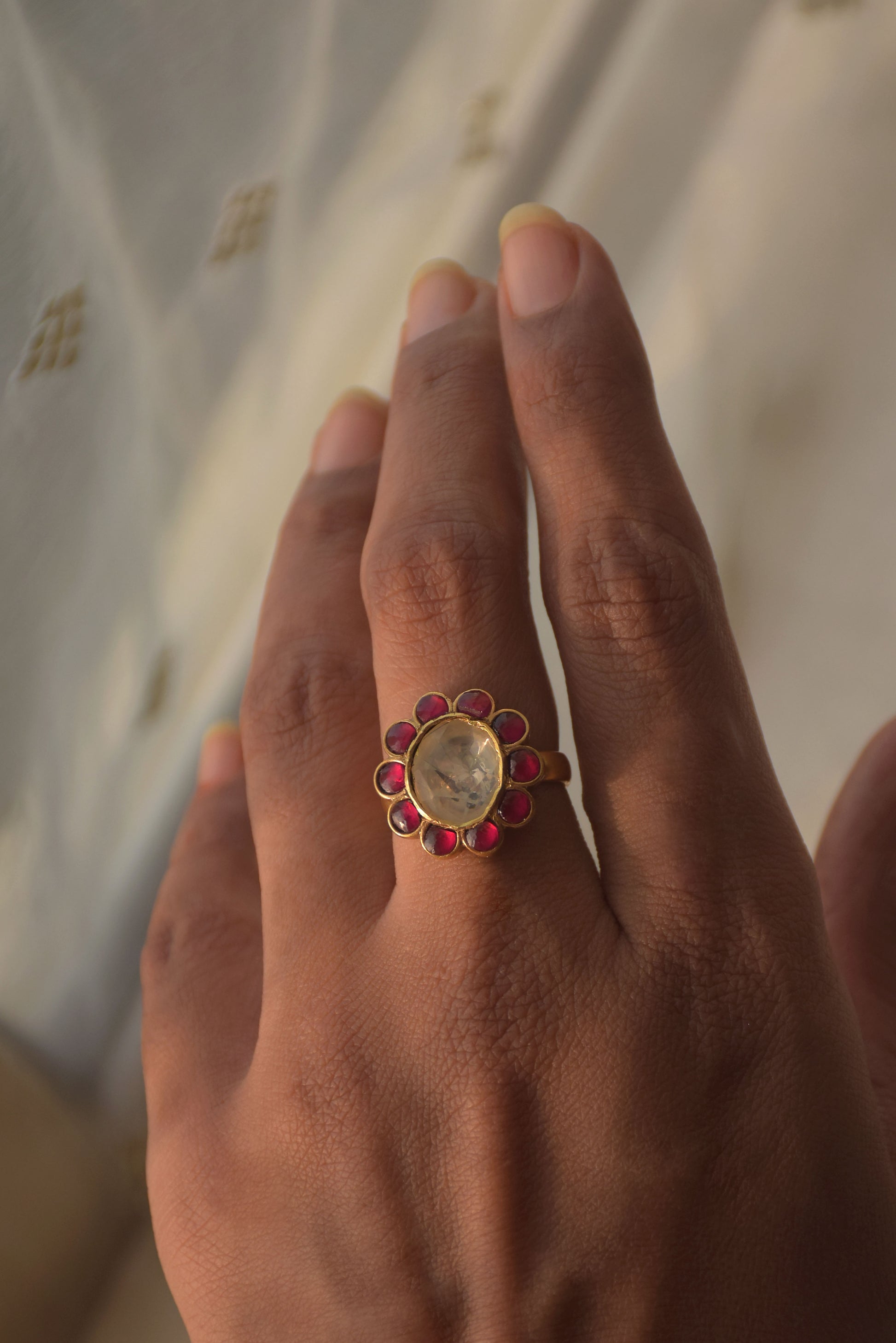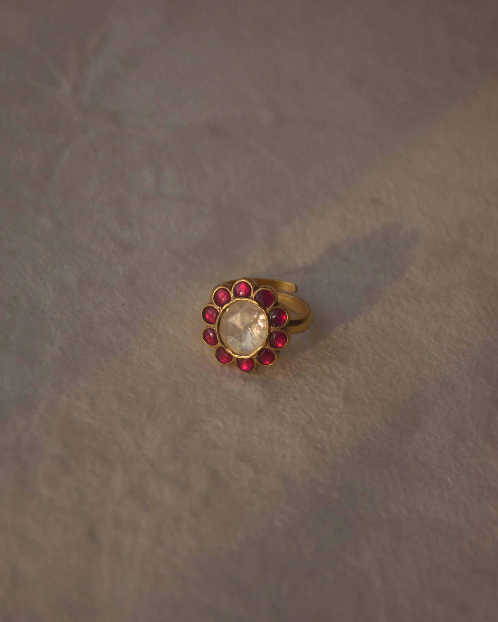 The Husna Polki Ring is a stunning statement piece, featuring a striking large polki stone at its center, radiating brilliance. Surrounding the central stone are delicate petals in a vibrant shade of pink, adding an enchanting pop of color. This exquisite ring is the perfect accessory to elevate any soirée.