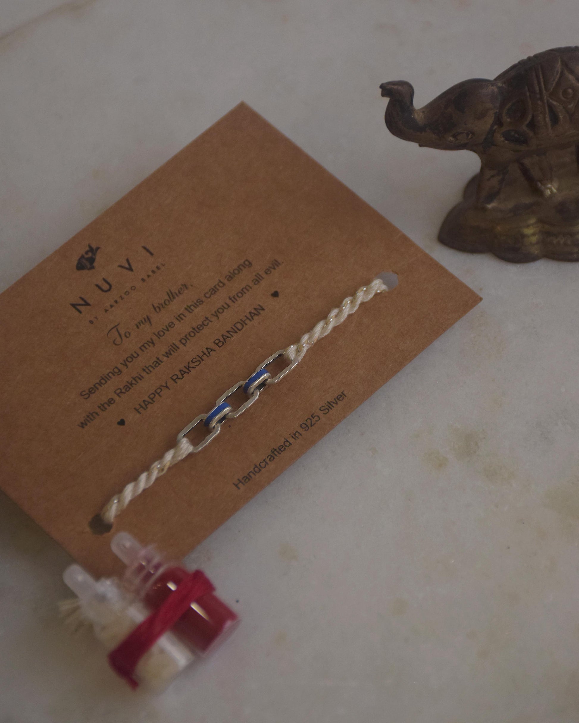 Each Rakhi comes in beautifully crafted Nuvi Packaging, complete with a heartfelt message for your dear brother. It also includes Roli and Akshat (Kumkum chawal).