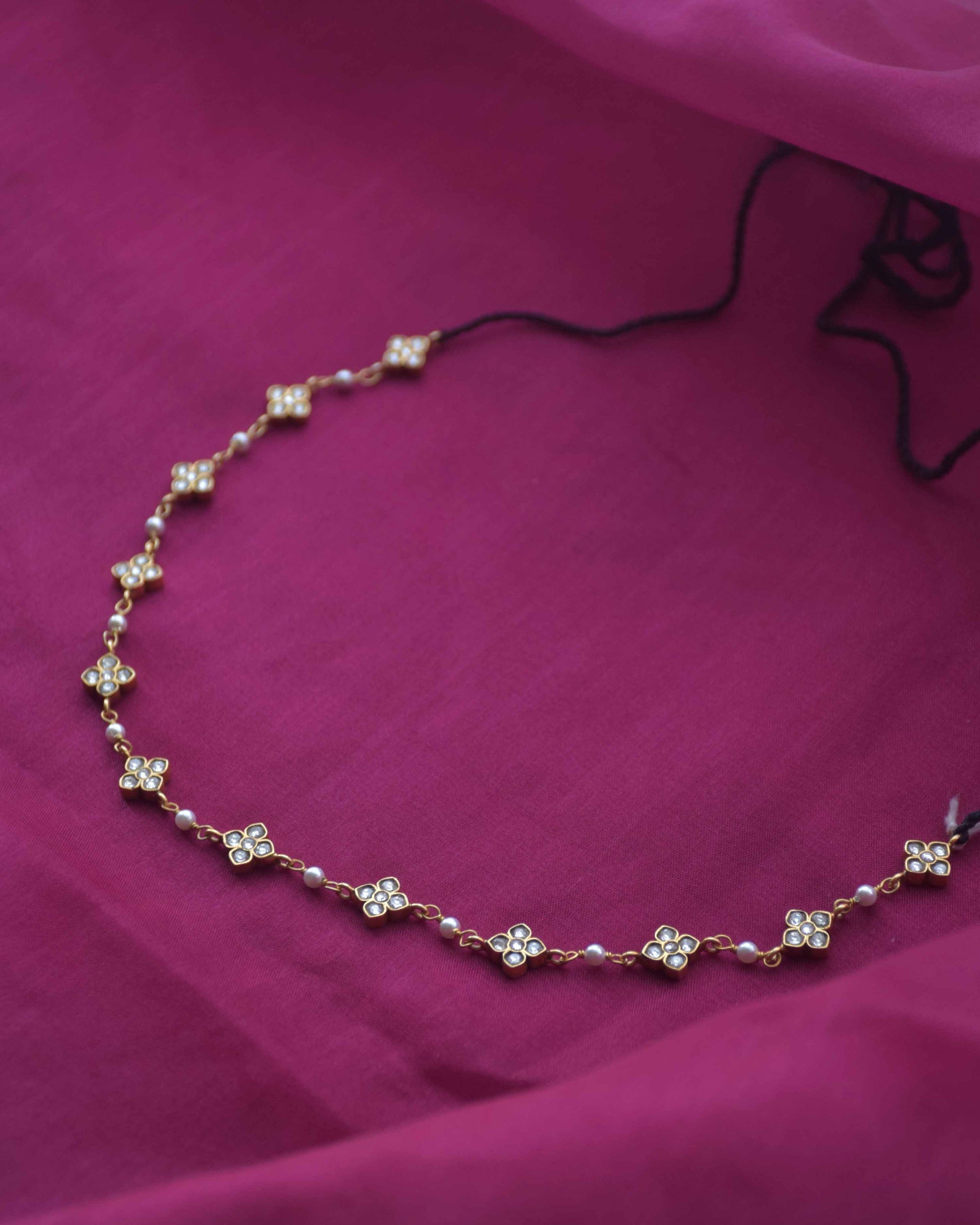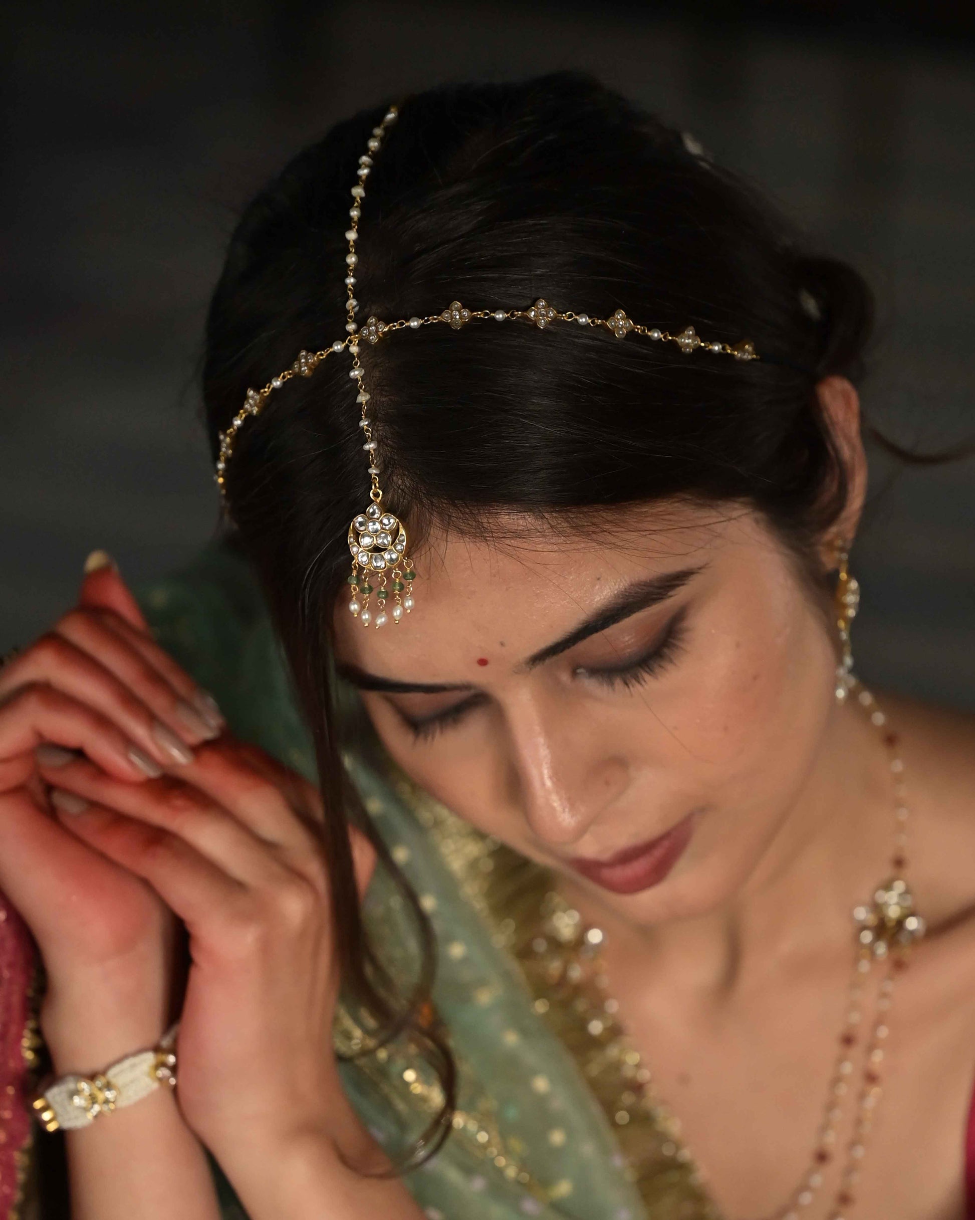 Our Najariya Mattha Patti is a captivating blend of tradition and contemporary style, meticulously crafted from 925 silver with gold polish. Adorned with intricate 4-petal flower motifs delicately accented by freshwater pearls, this headpiece exudes elegance, making it the perfect accessory for bridesmaids.