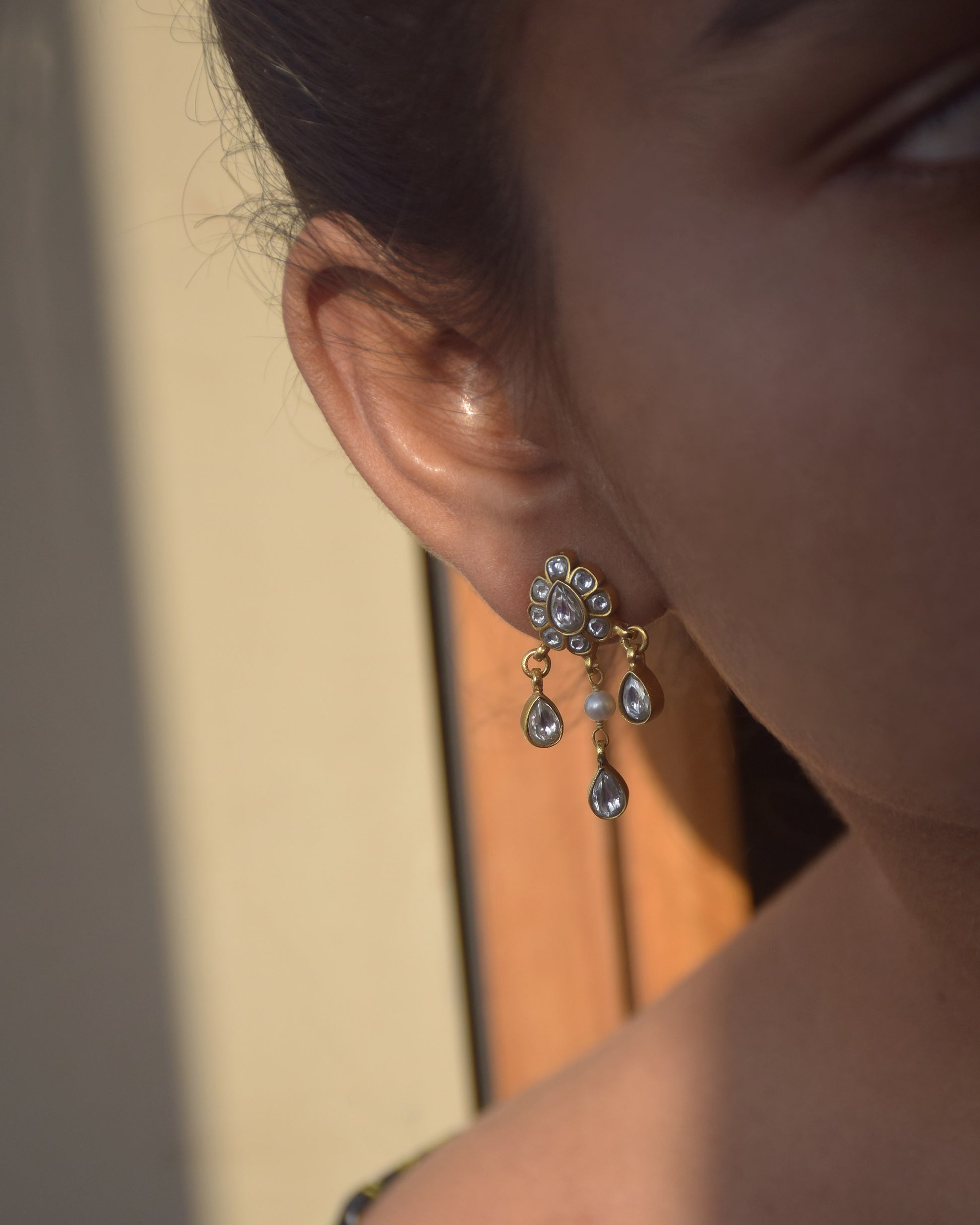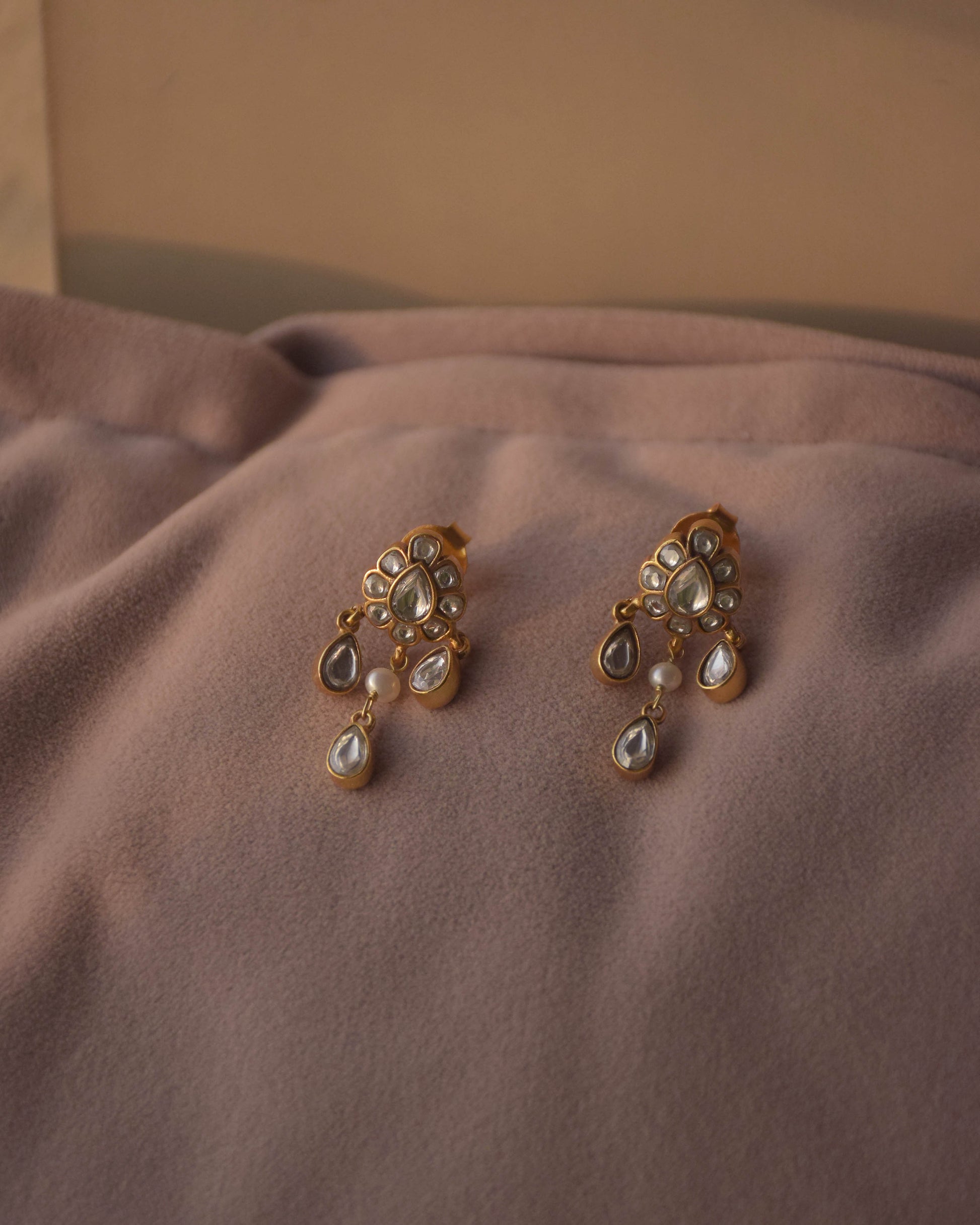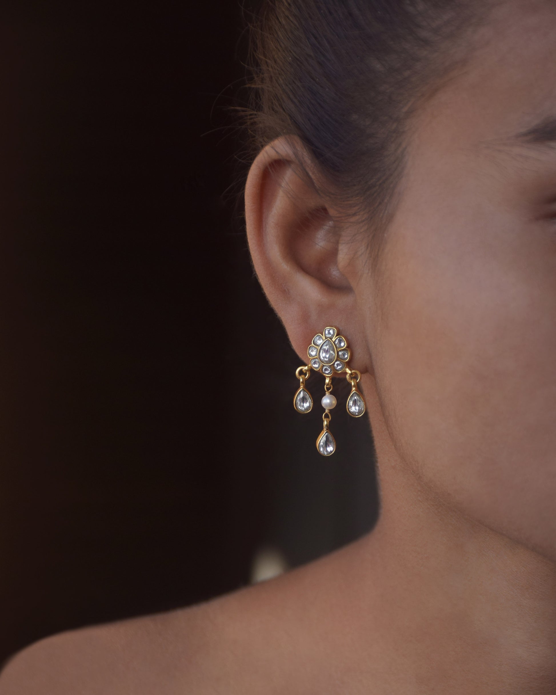 The Madhuri earrings are a delicate pair crafted in 92.5 silver, featuring stunning jadau stones.