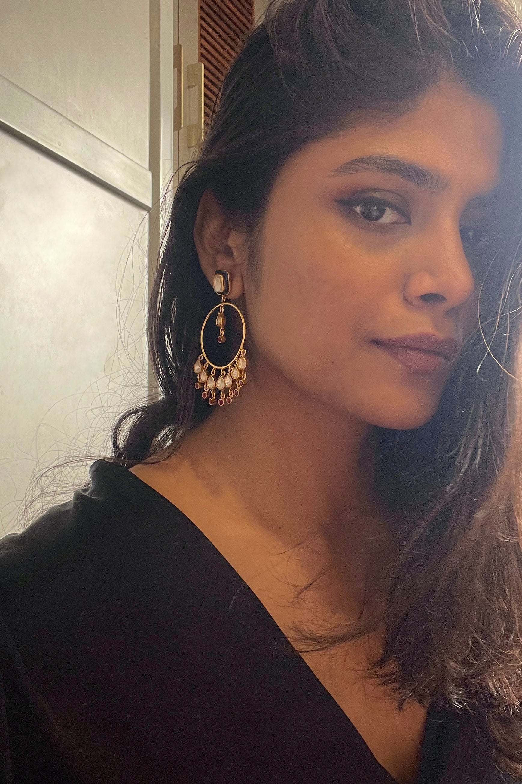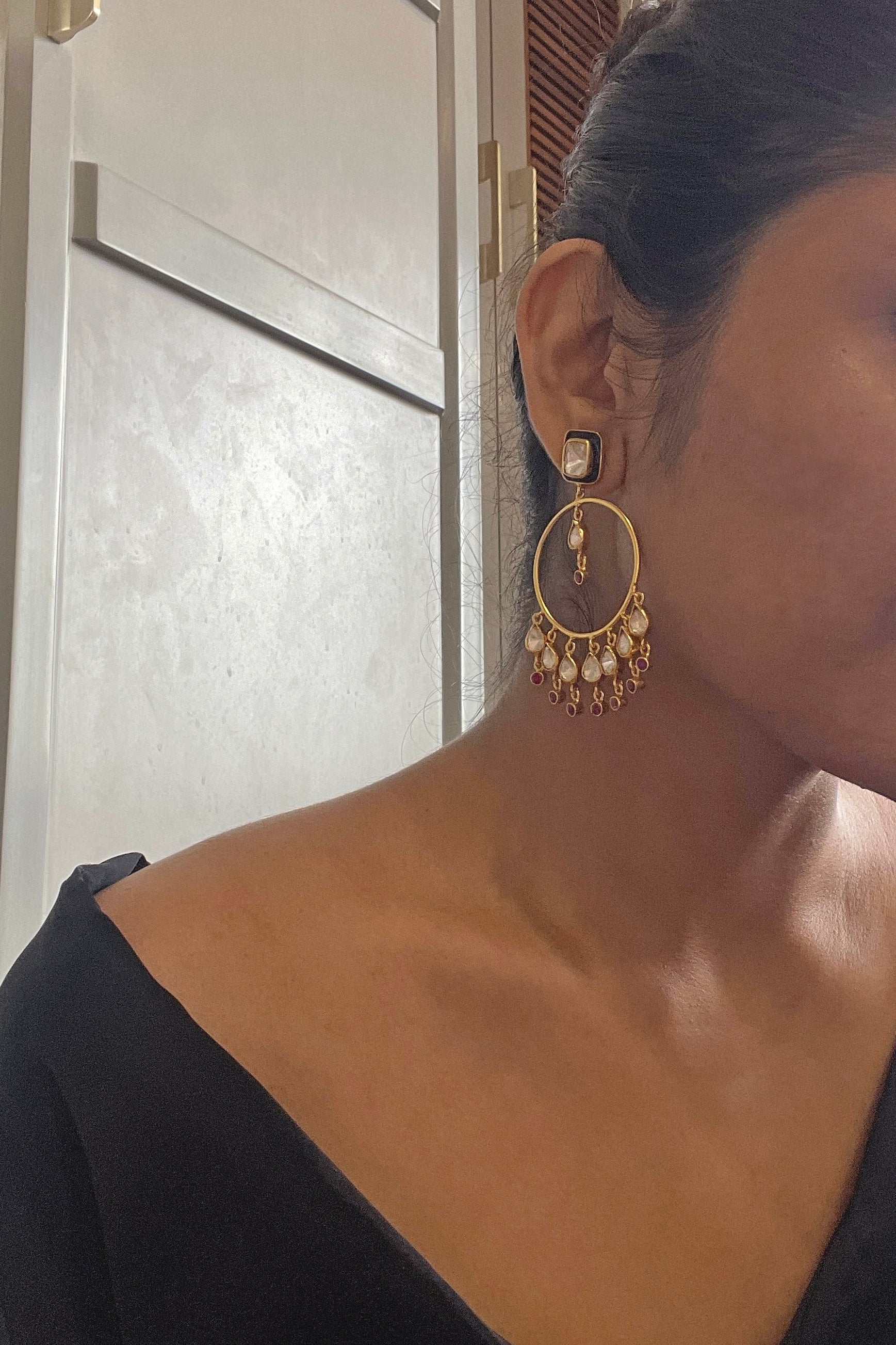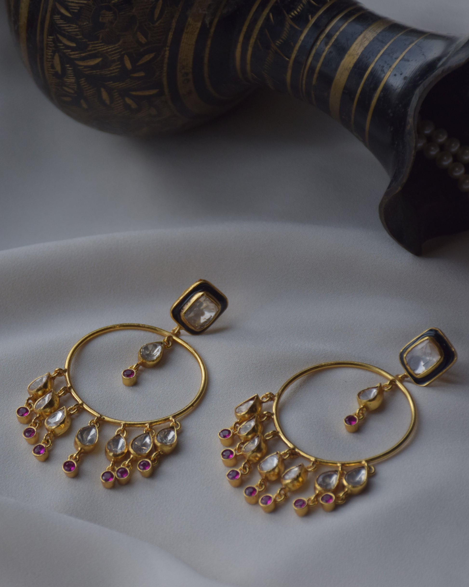 The Manmohini earrings are a timeless treasure, handcrafted with 925 silver and adorned with Polki stones. Combining black meena and pink ad stones in a contemporary Indian chaandbali style, they offer a striking contrast to the radiant white polkis. Delicate yet making a statement, these earrings exude opulence with their richly dangling drops.