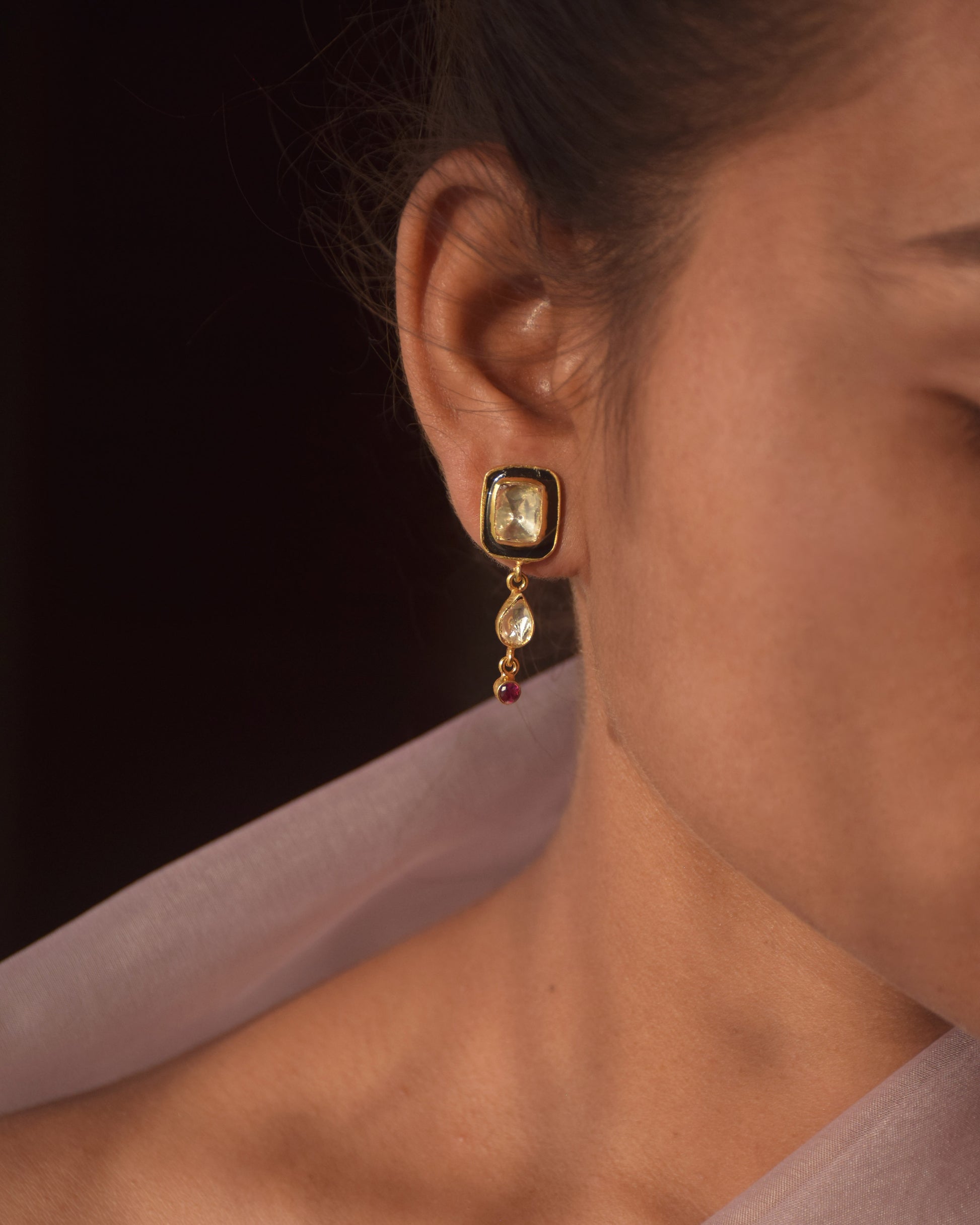 A striking Polki stone, adorned with deep black meena, with a dangling drop shape polki. These earrings are the perfect addition to your chic and smart look, balancing minimalism with statement-making elegance. Meticulously crafted in 92.5 Silver.