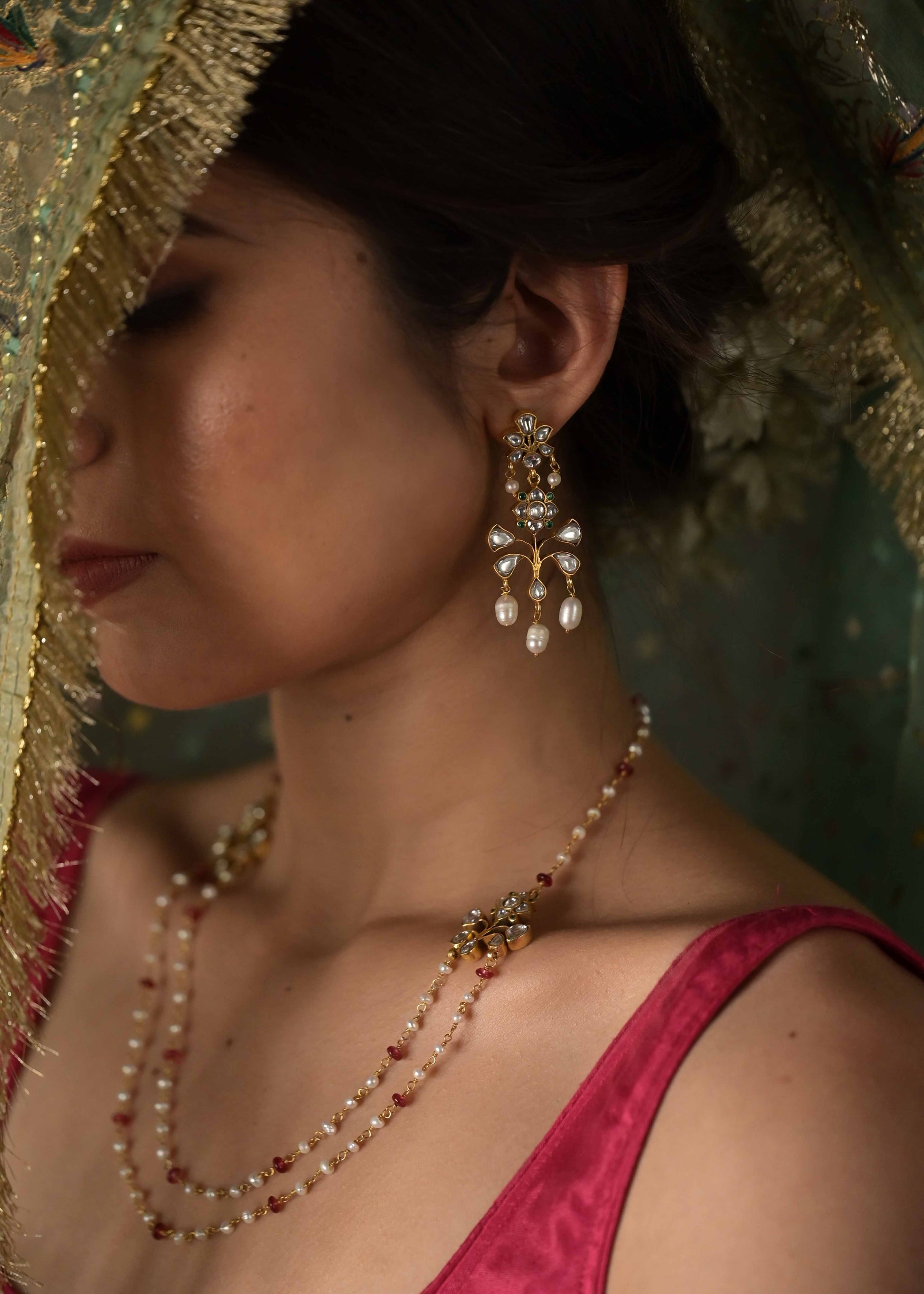 Introducing our Matwaari Earrings: a fusion of Indian elegance and modern charm. Crafted in 925 silver with a gold polish, these earrings feature a chandelier motif with a stud adorned in white Jadau polkis. Delicate rice pearls cascade, adding movement to your look.