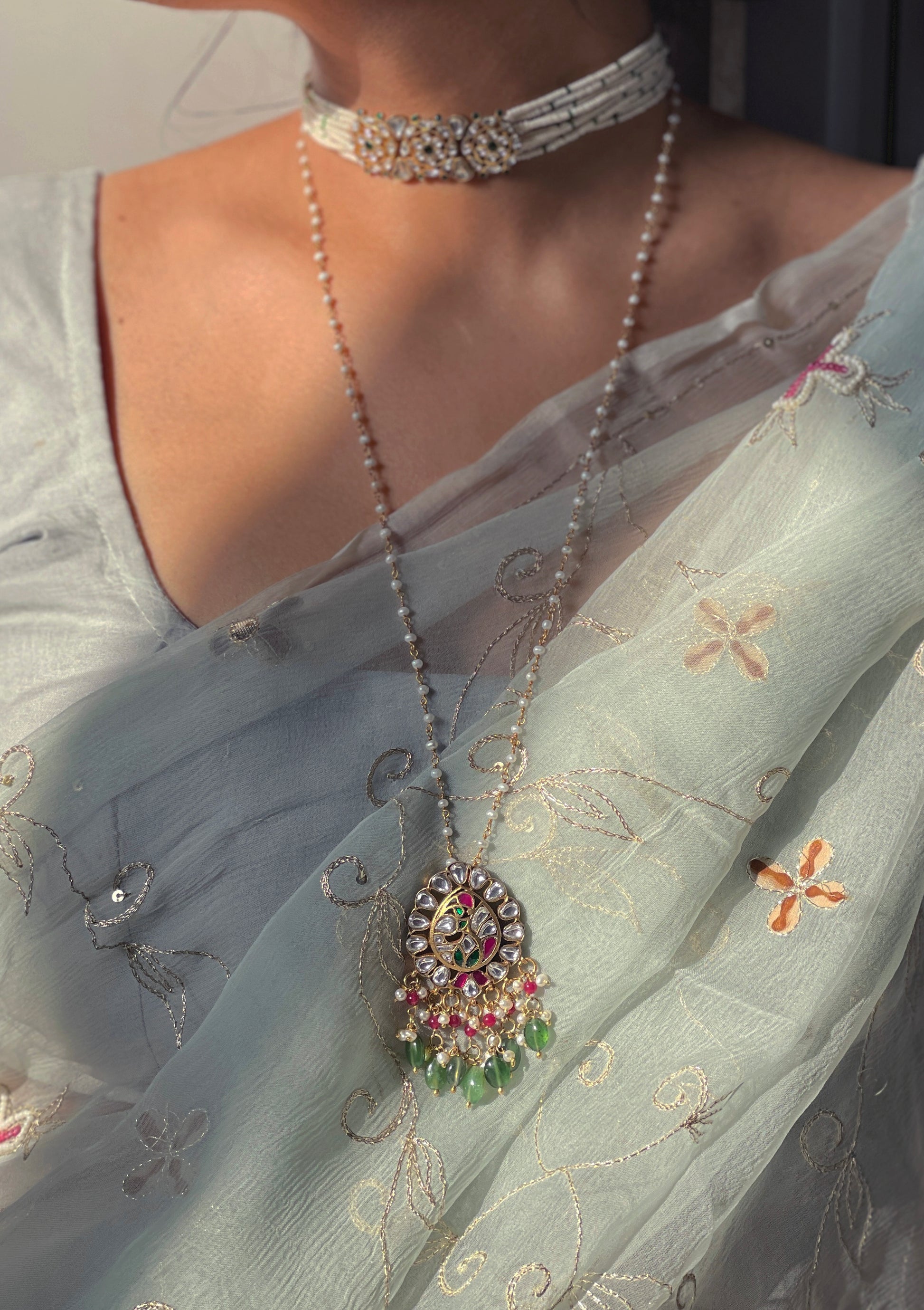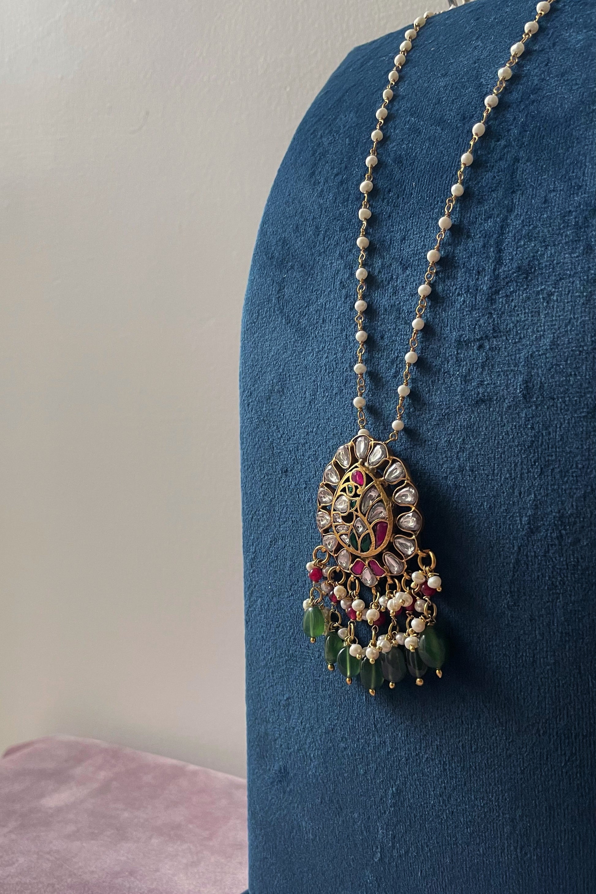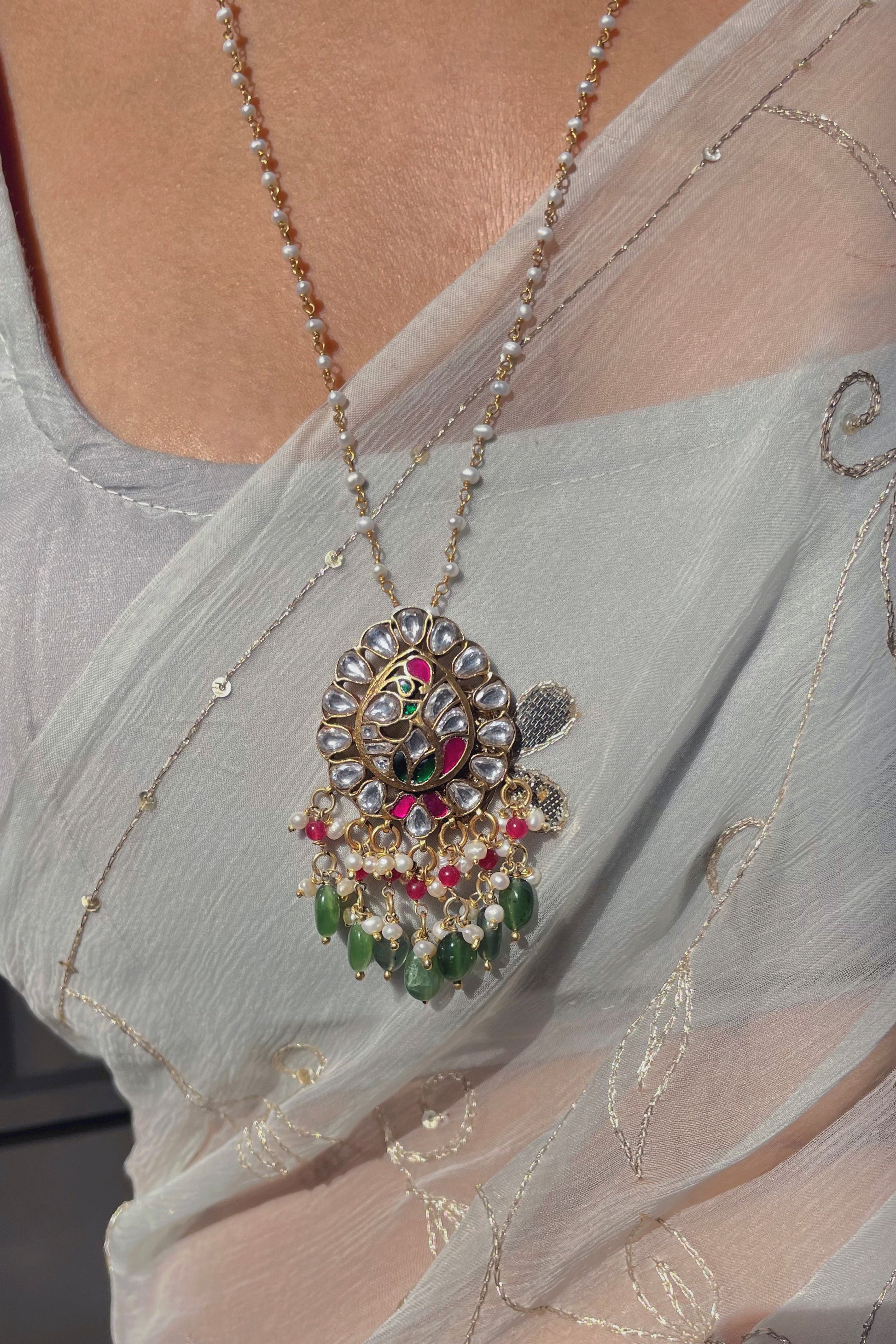 Elevate your style with our Mayuri Pendant, meticulously crafted in 925 silver with a stunning gold polish. Featuring a mesmerizing peacock in the centerpiece adorned with intricate Jadau stone work, the pendant's focal point is the delightful cascade of green strawberry quartz beads, pearls, and pink beads. Complete with a graceful pearl chain, it's a masterpiece of elegance.
