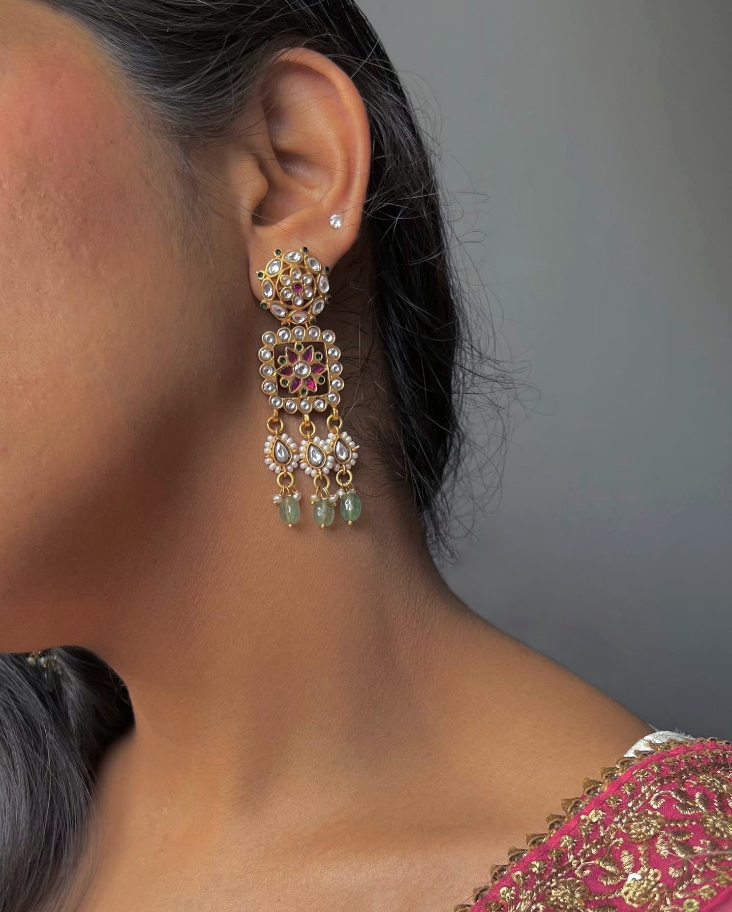 These exquisite earrings showcase a Jadau-set top, delicately suspended with a majestic flower motif, enclosed by a frame of intricate petal work. To enhance their allure, they've been adorned with beautiful aventurine tumbles and pearl accents.
