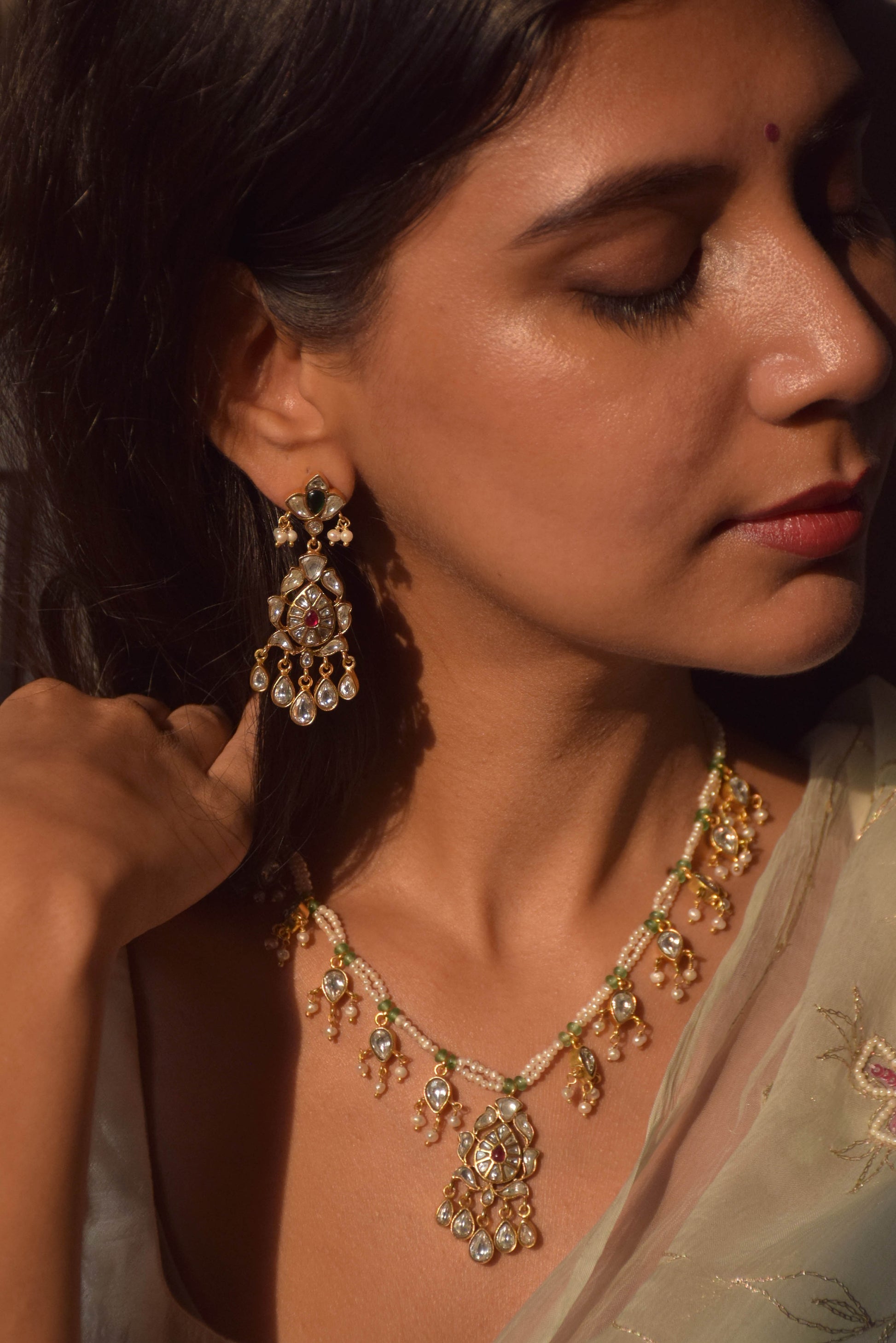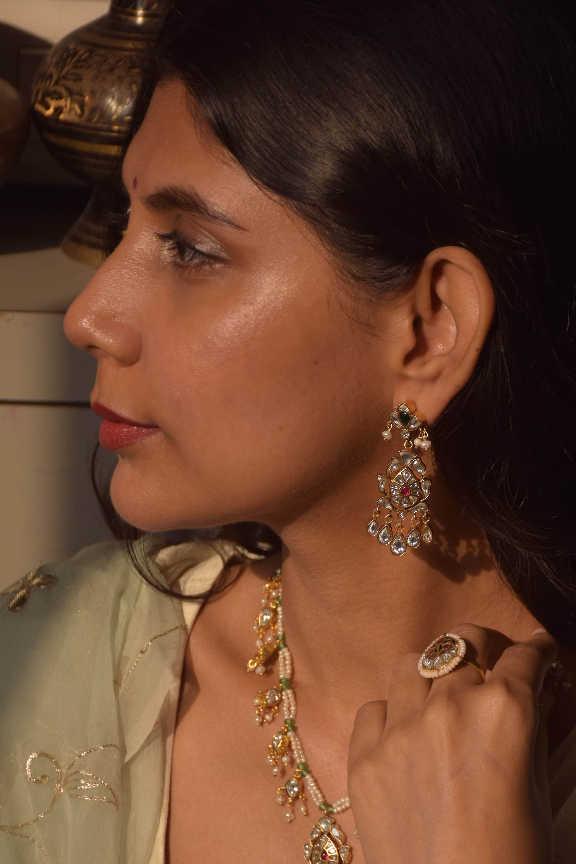 The Lalita 925 silver bridal earrings exude timeless royalty with their handcrafted, intricate design featuring Jadau cut stones in a graceful petal motif. Drops of petal shape jadau stones finish the earrings with a graceful touch.