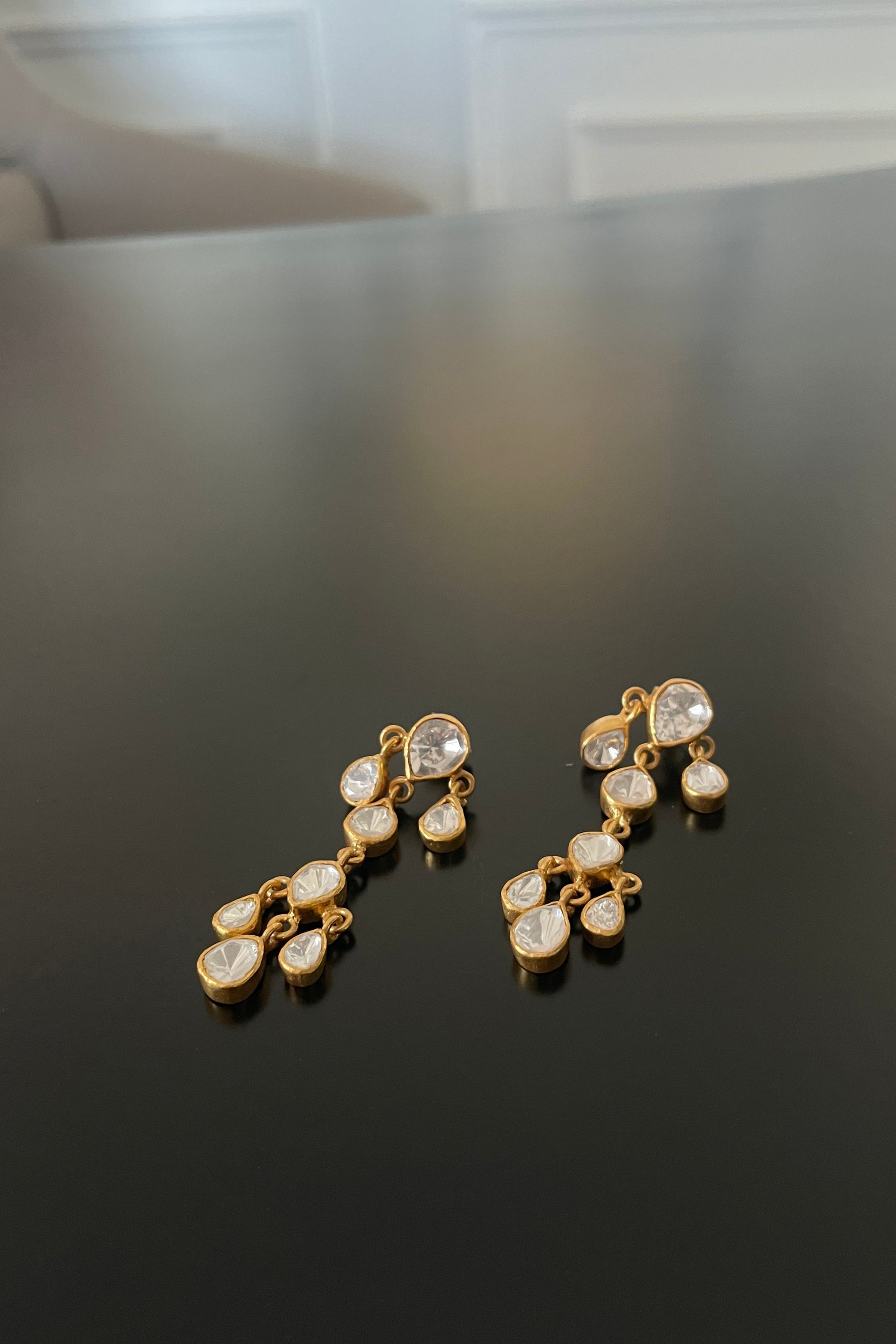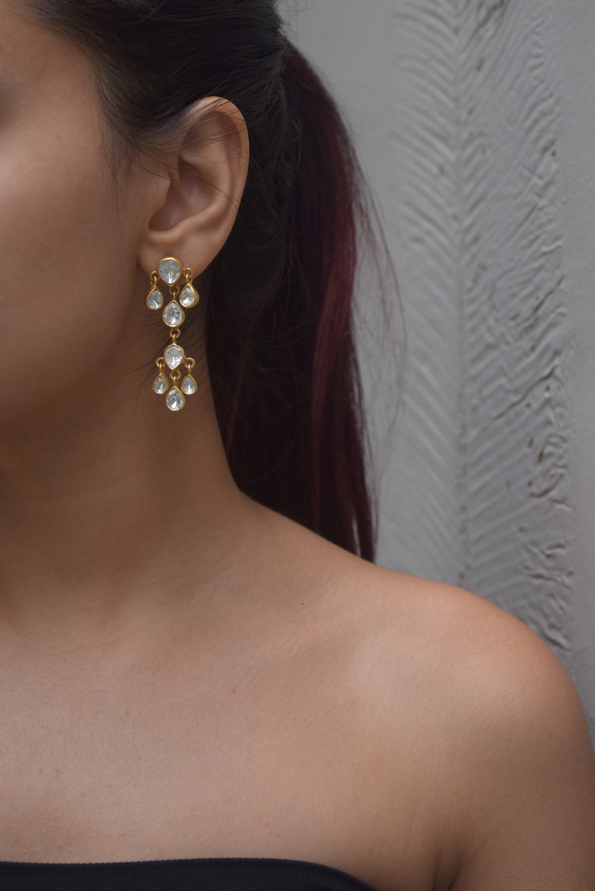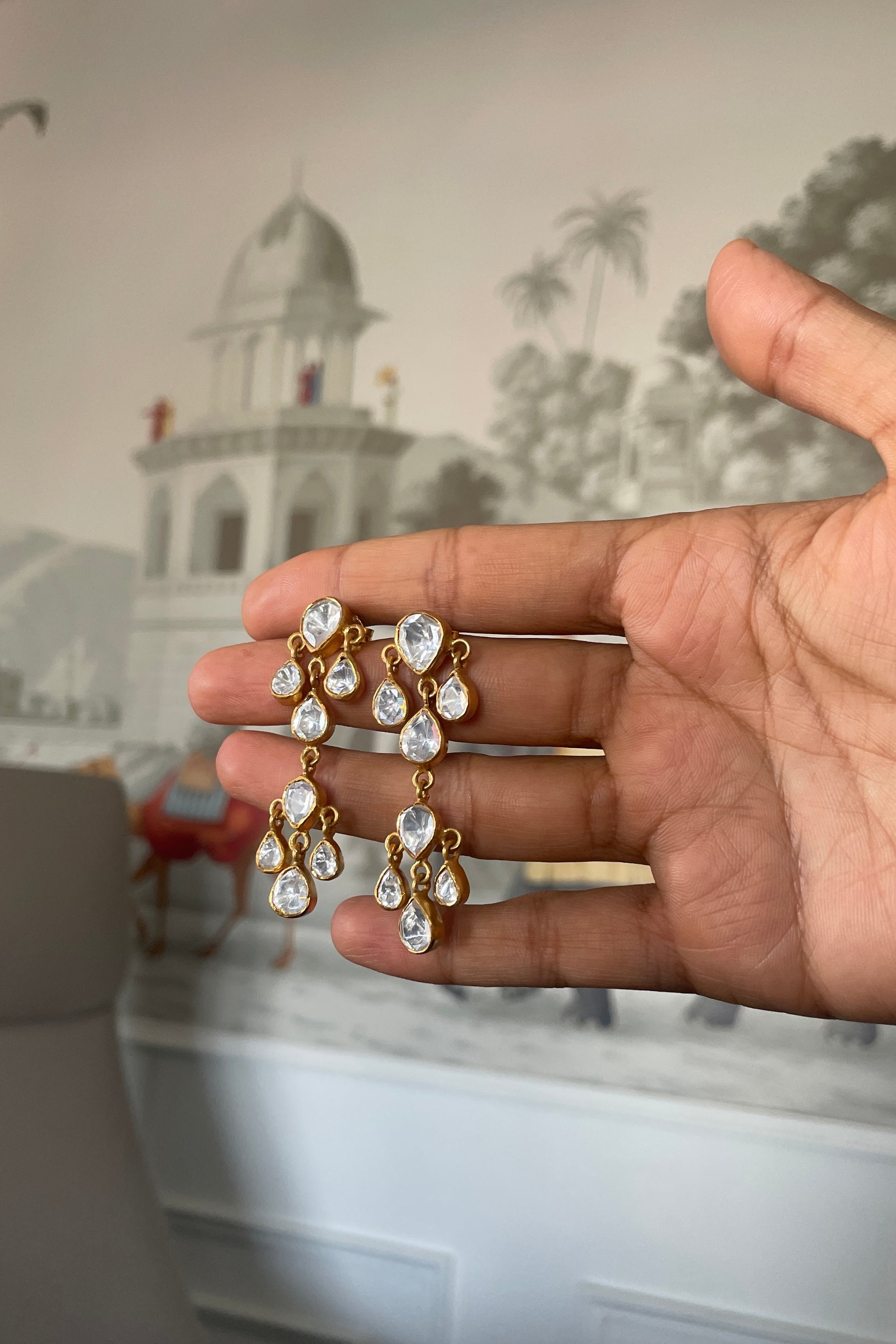 The stunning Polki stone drops form an exquisite chandelier in the design of the Nargis Earring. These delicate earrings are perfect for an evening soiree, allowing the stones to shimmer and shine. They are meticulously crafted from 925 silver.