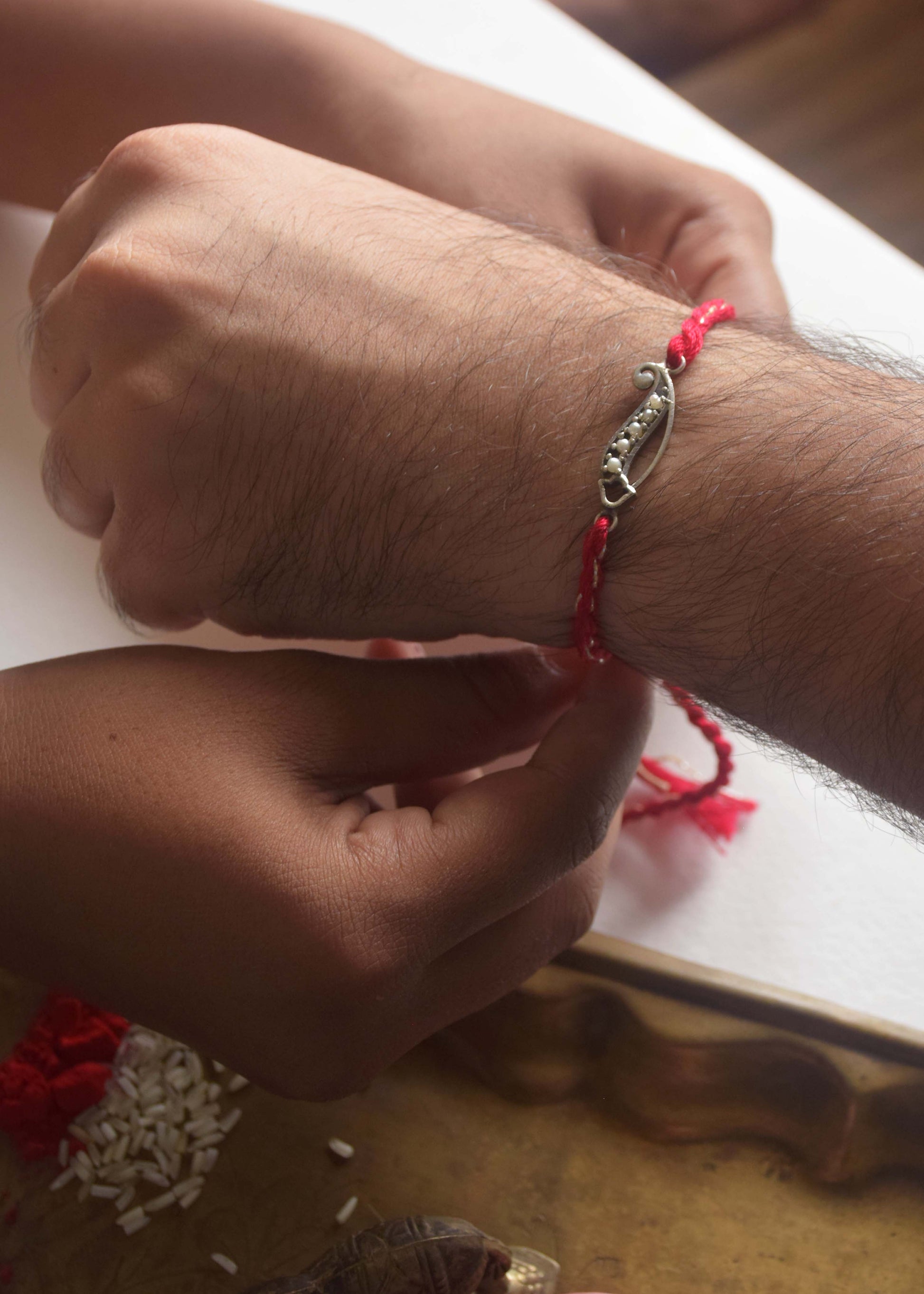 Celebrate the enduring bond of Raksha Bandhan with our stunning 92.5 silver Rakhi designs, meticulously crafted with sterling silver, real freshwater pearls and cotton thread.