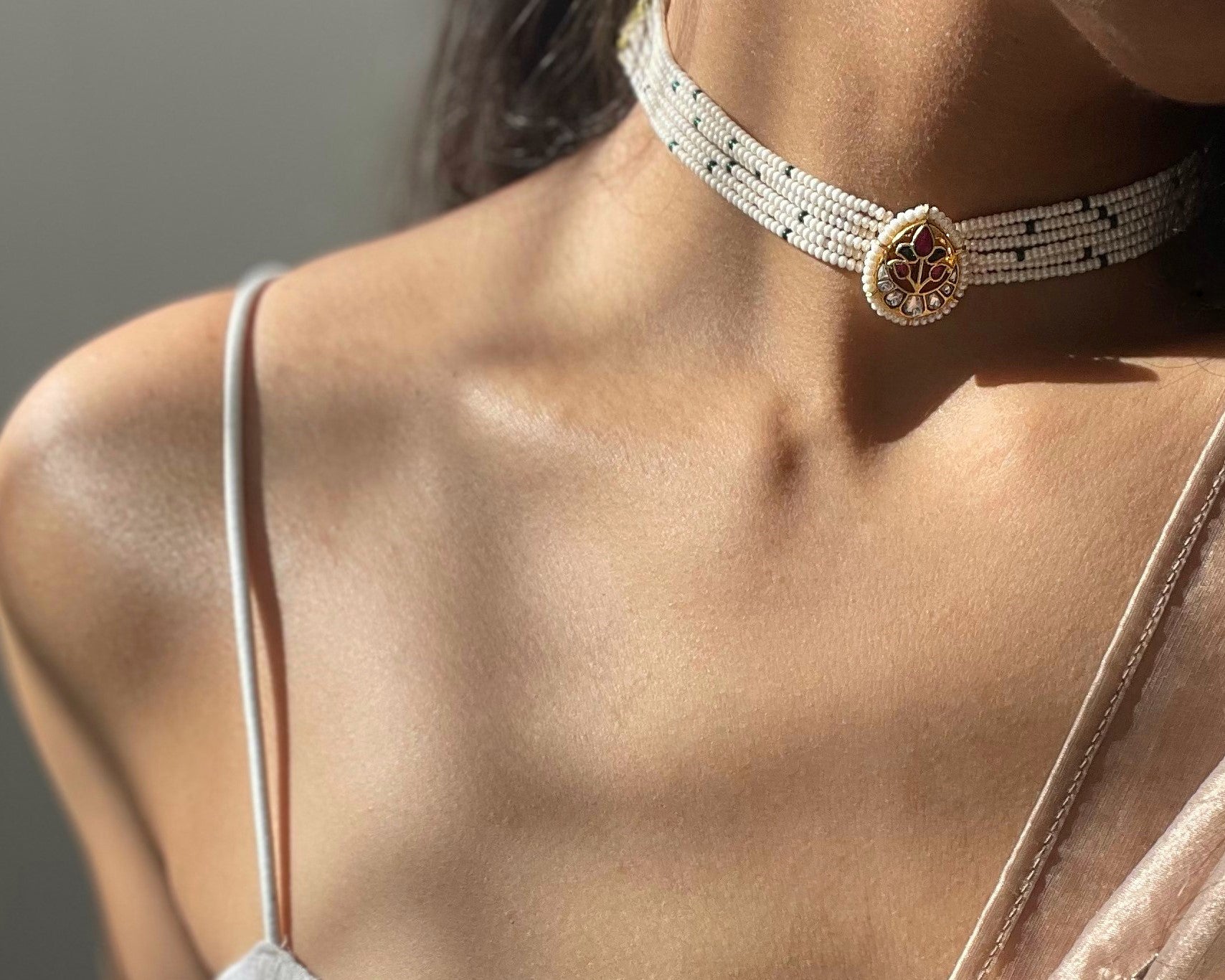 Experience timeless beauty with our Pankhudi Choker, meticulously handcrafted in 925 silver and gold polish. Its central petal unit adorned with multicolored jadau stones and delicate pearl accents exudes minimalistic elegance, perfect for women embracing their Indian heritage with a modern touch.