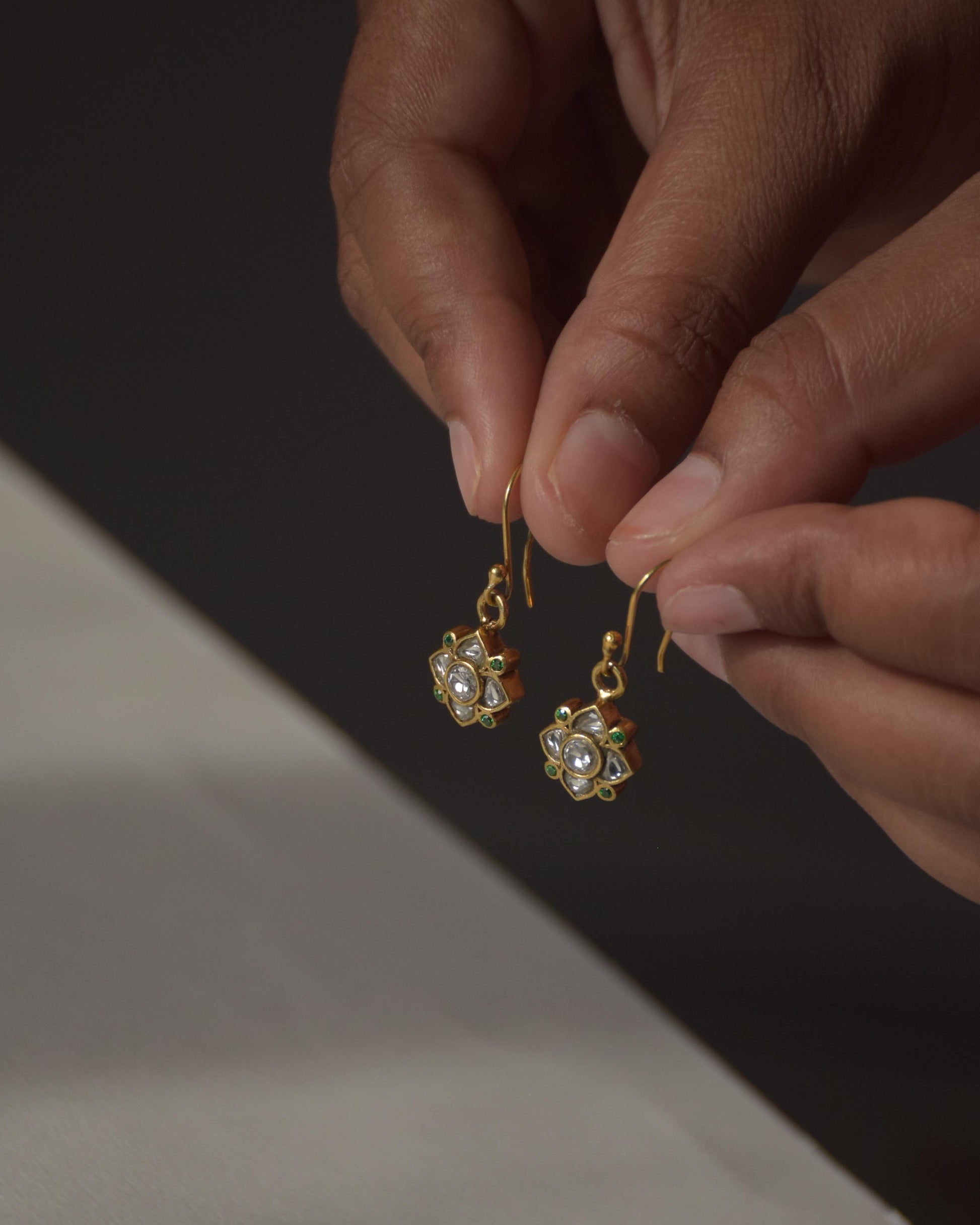 These exquisite earrings feature a 4-petal Jadau stone-studded flower motif suspended from a fish hoop. The Jadau flower is elegantly adorned with small green ad stones, making it a perfect match for your silk kurtis.