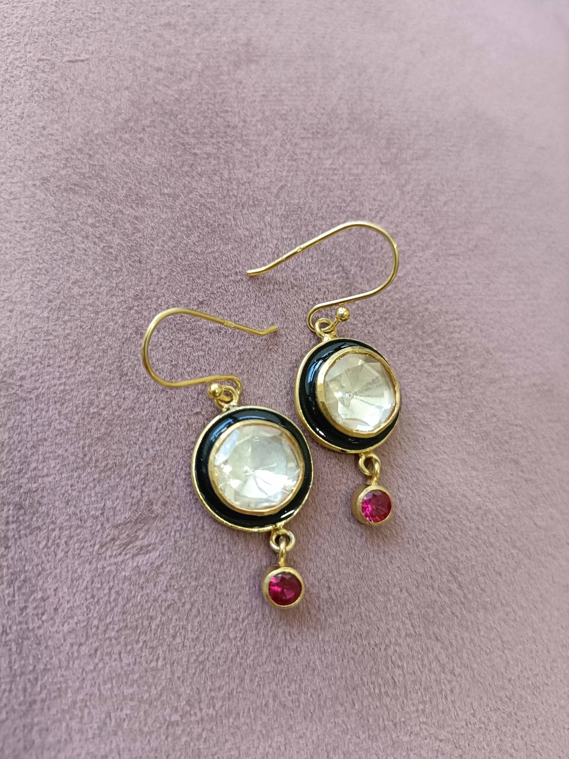 Gold plated fish hoops with stone Polki accentuated with black enamel.