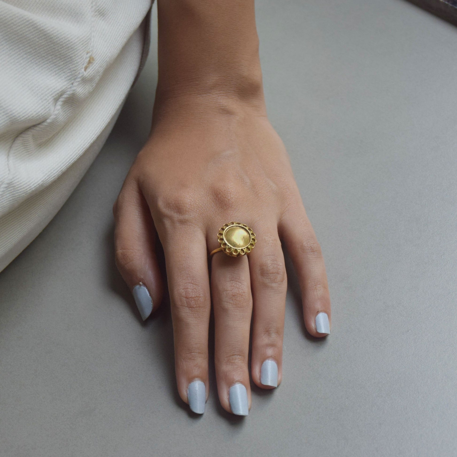 The Preet Ring is a delicate and captivating piece of jewelry, crafted in shimmering golden hues, it features a subtle yet intricate flower motif that adds a touch of elegance to your casual attire, making it the perfect accessory to elevate your everyday style.