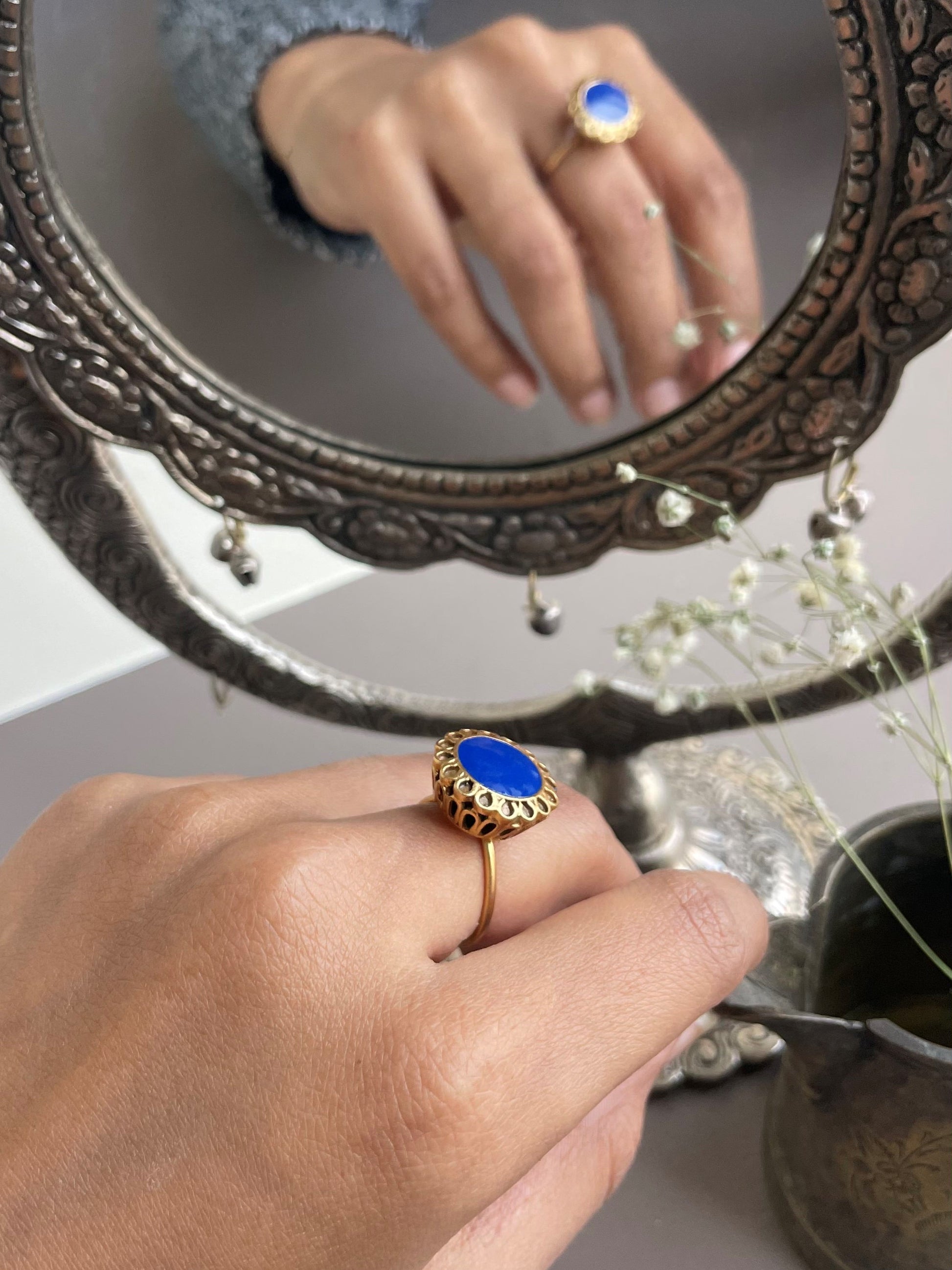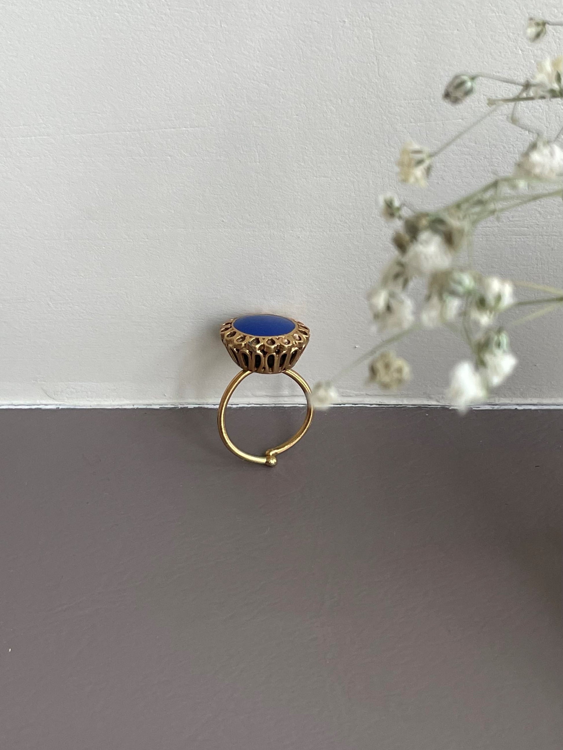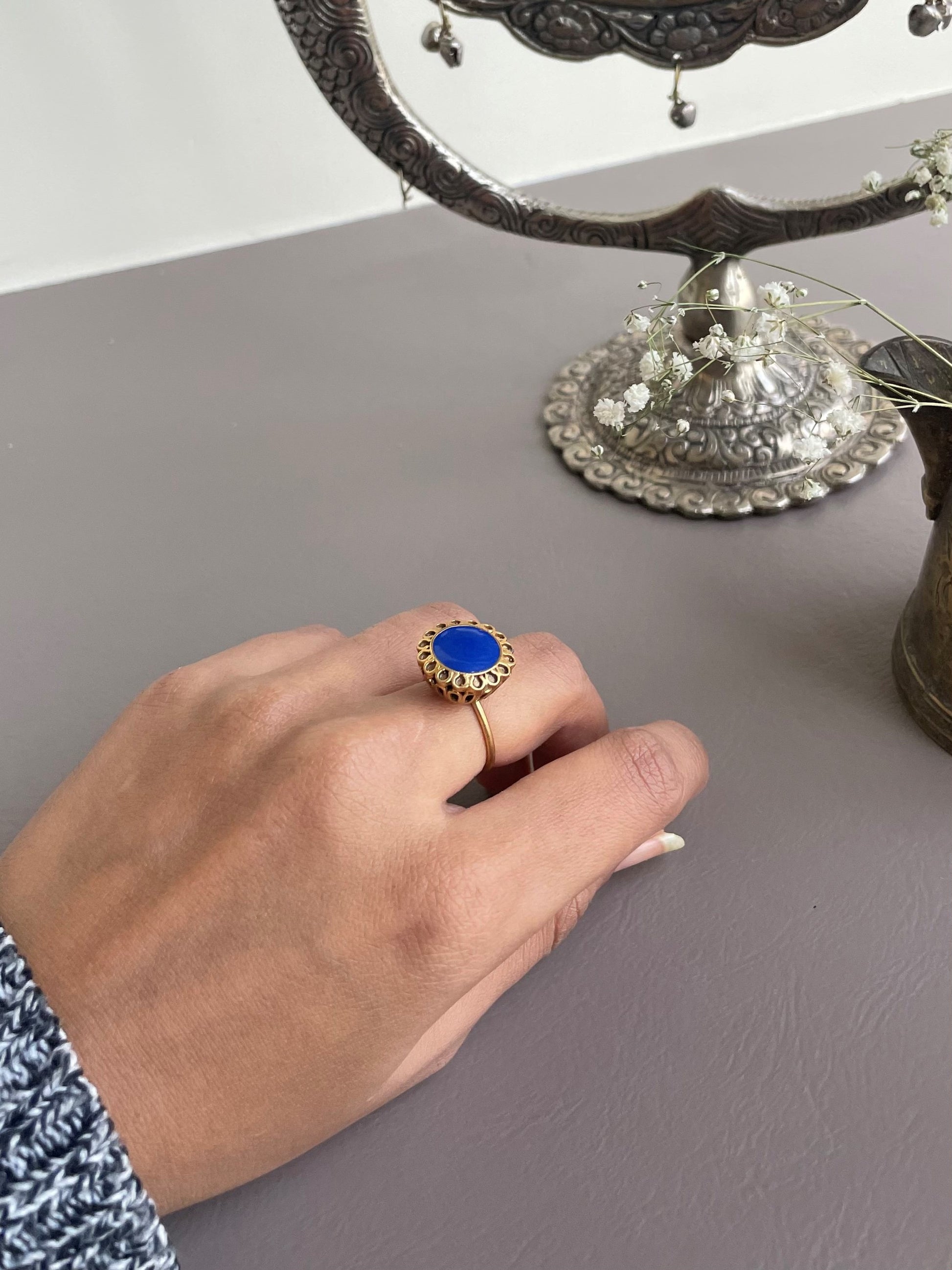 Discover the Preet Ring: A Stunning Fusion of Simplicity and Elegance. With a central blue meena embraced by a golden flower motif and intricate jali work on the sides, this ring is a true masterpiece, effortlessly blending traditional charm with modern chic.