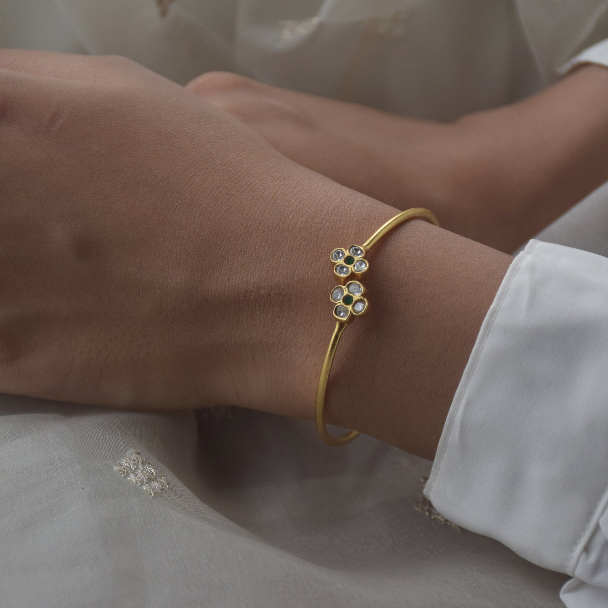 Enhance your look with our gold-plated 92.5 silver adjustable bangle, adorned with two dainty flower motifs for a touch of enduring charm.