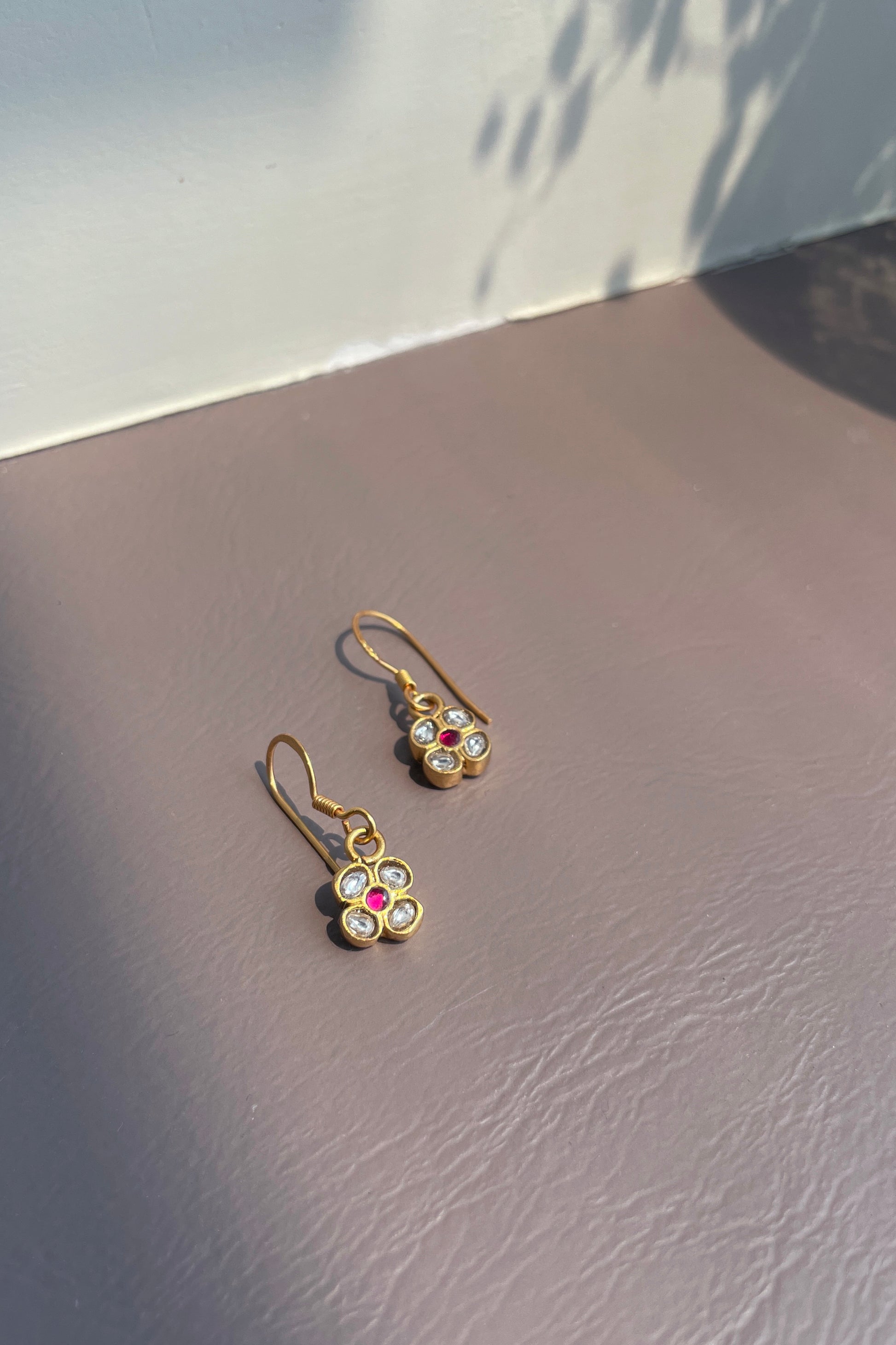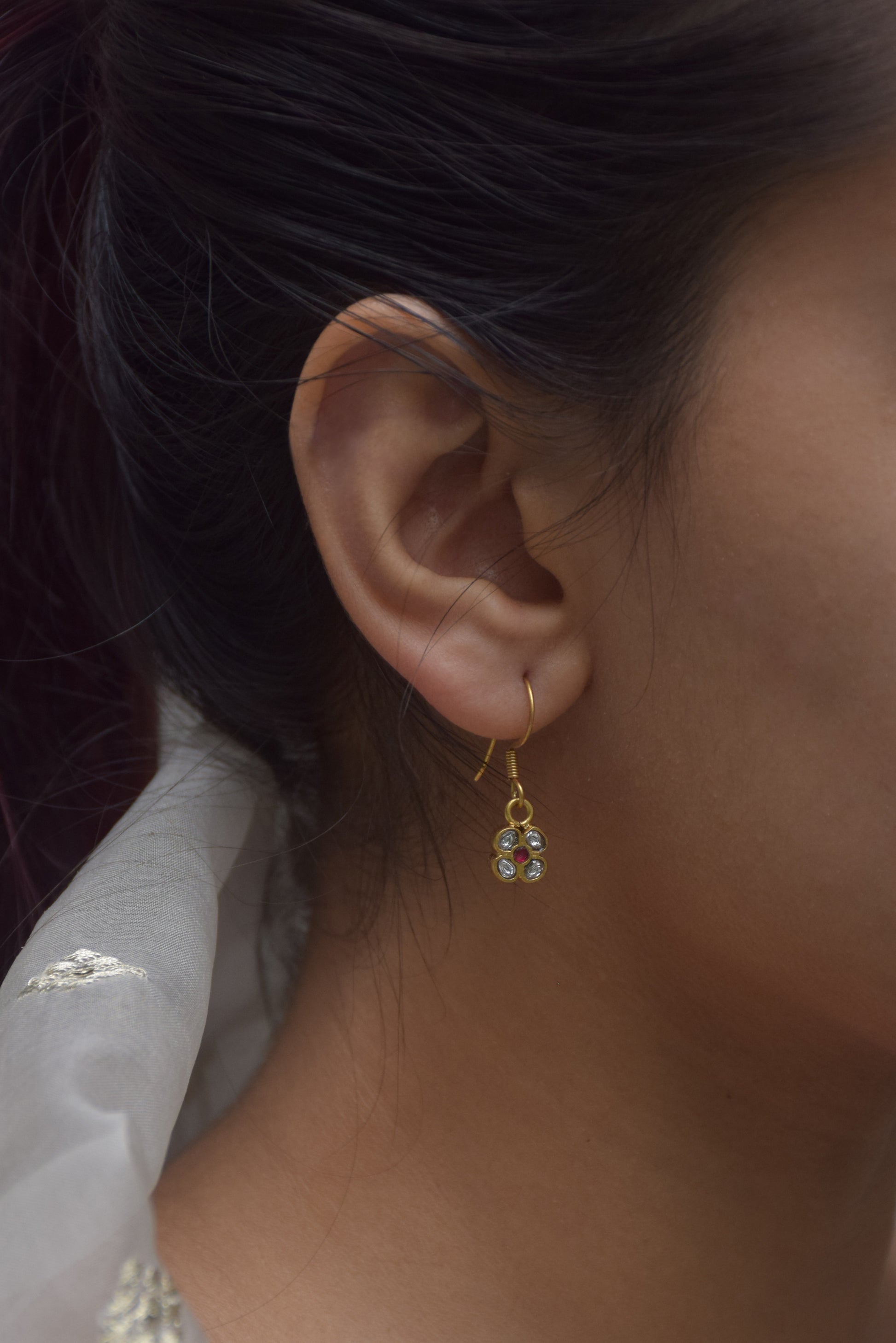 For those who prefer a minimalist style with an Indian flair, the Raatrani Fish Hoops are an ideal choice. Crafted in 925 silver with 22 carat gold plating, these earrings feature a delicate Jadau stone-studded flower motif that dangles gracefully, adding the perfect touch to any look.