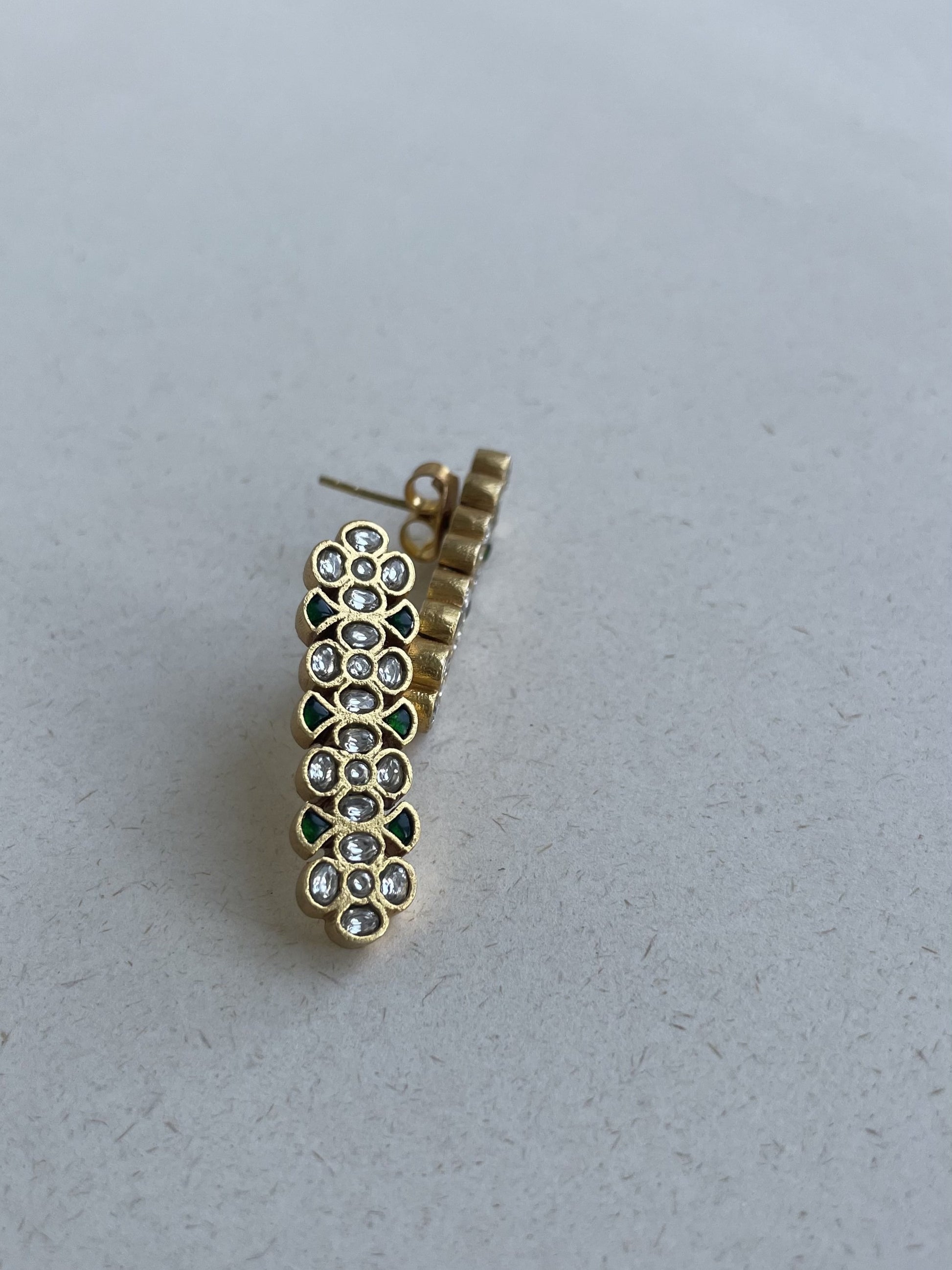 Elevate your evening ensemble with our Raatrani Earrings, a stunning jewelry piece meticulously crafted in 925 silver. These exquisite earrings feature five vertical units adorned with Jadau stone-studded flower motifs, showcasing a clean and classy design.