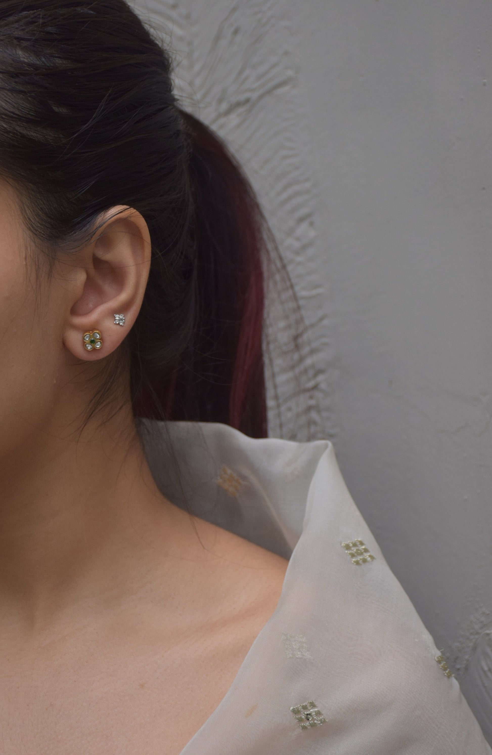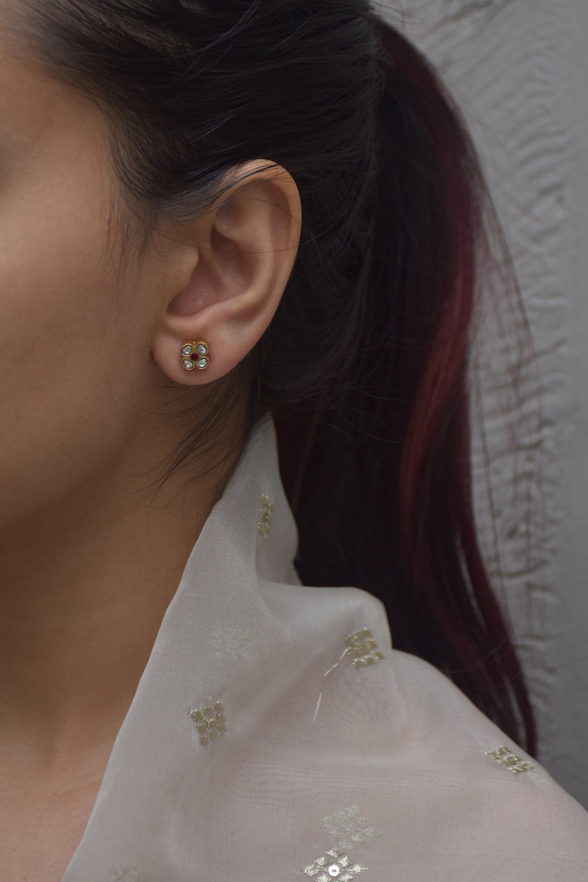 For those who prefer a minimalist style with an Indian flair, the Raatrani Earstuds are an ideal choice. Crafted in 925 silver with 22 carat gold plating, these earrings feature a delicate Jadau stone-studded flower motif as the stud, adding the perfect touch to any look.