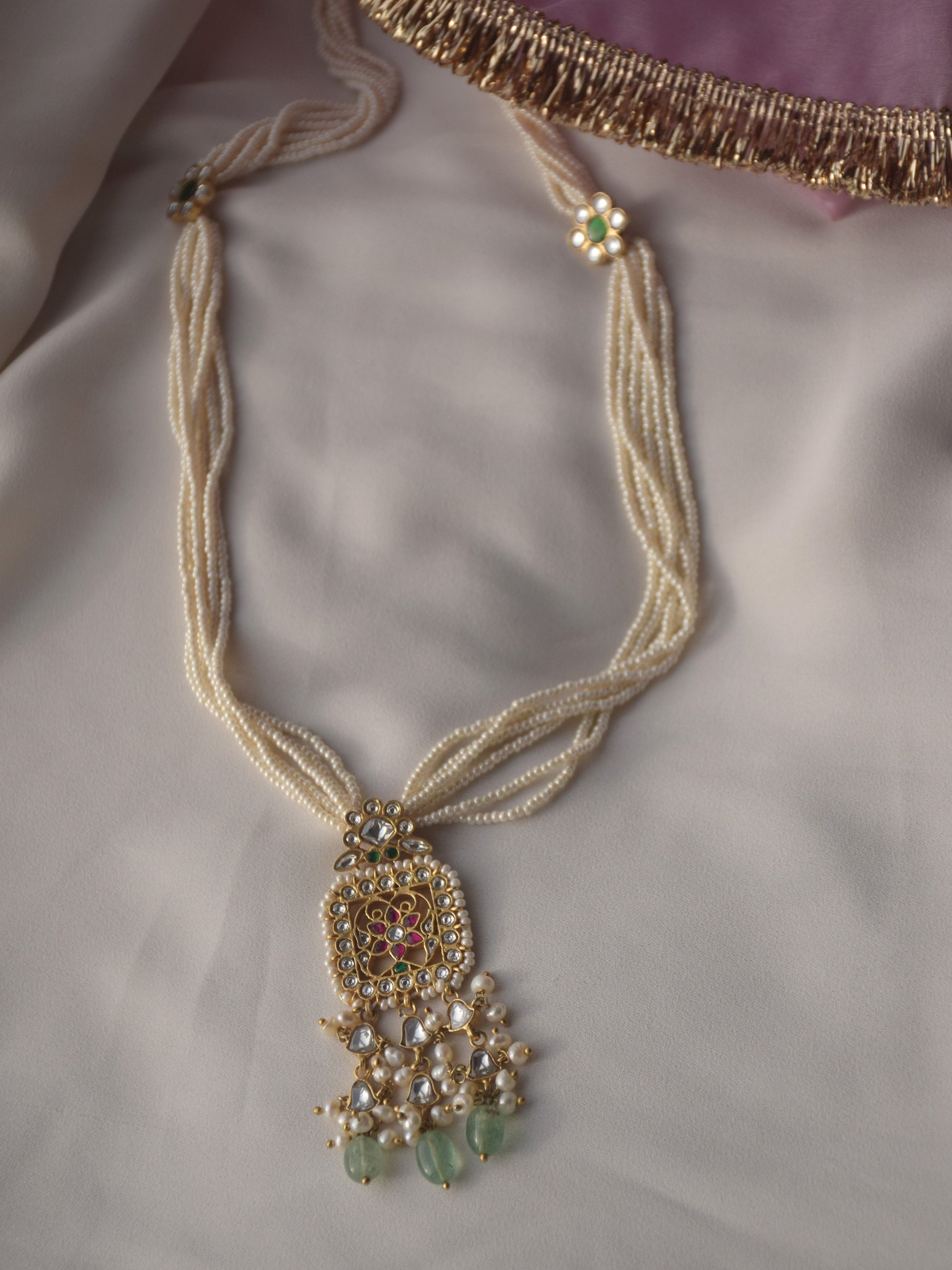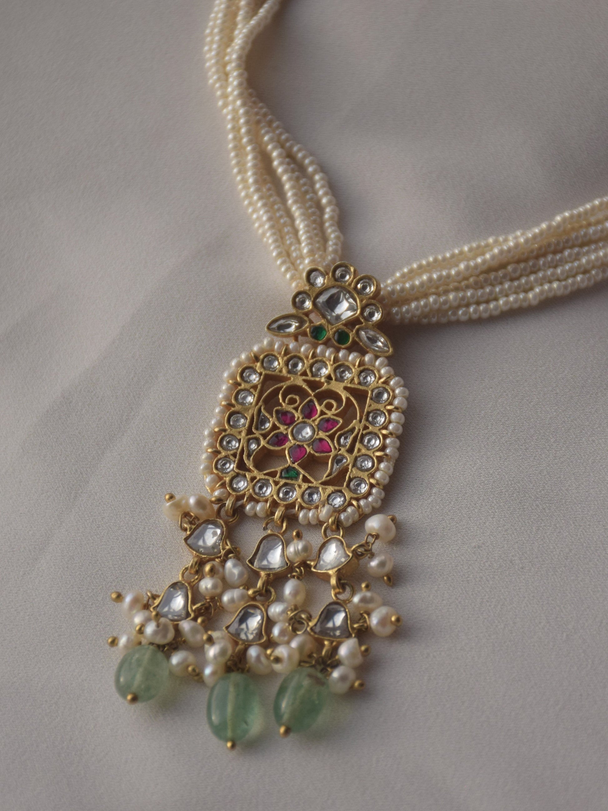Indulge in regal elegance with our Rani Jadau Pendant, meticulously crafted in 925 silver with gold polish. This long pendant adorns a pearl mala, while its intricately detailed jadau stones, embellished with pearls and green strawberry quartz drops, pay homage to the rich heritage of royal Rajasthan.