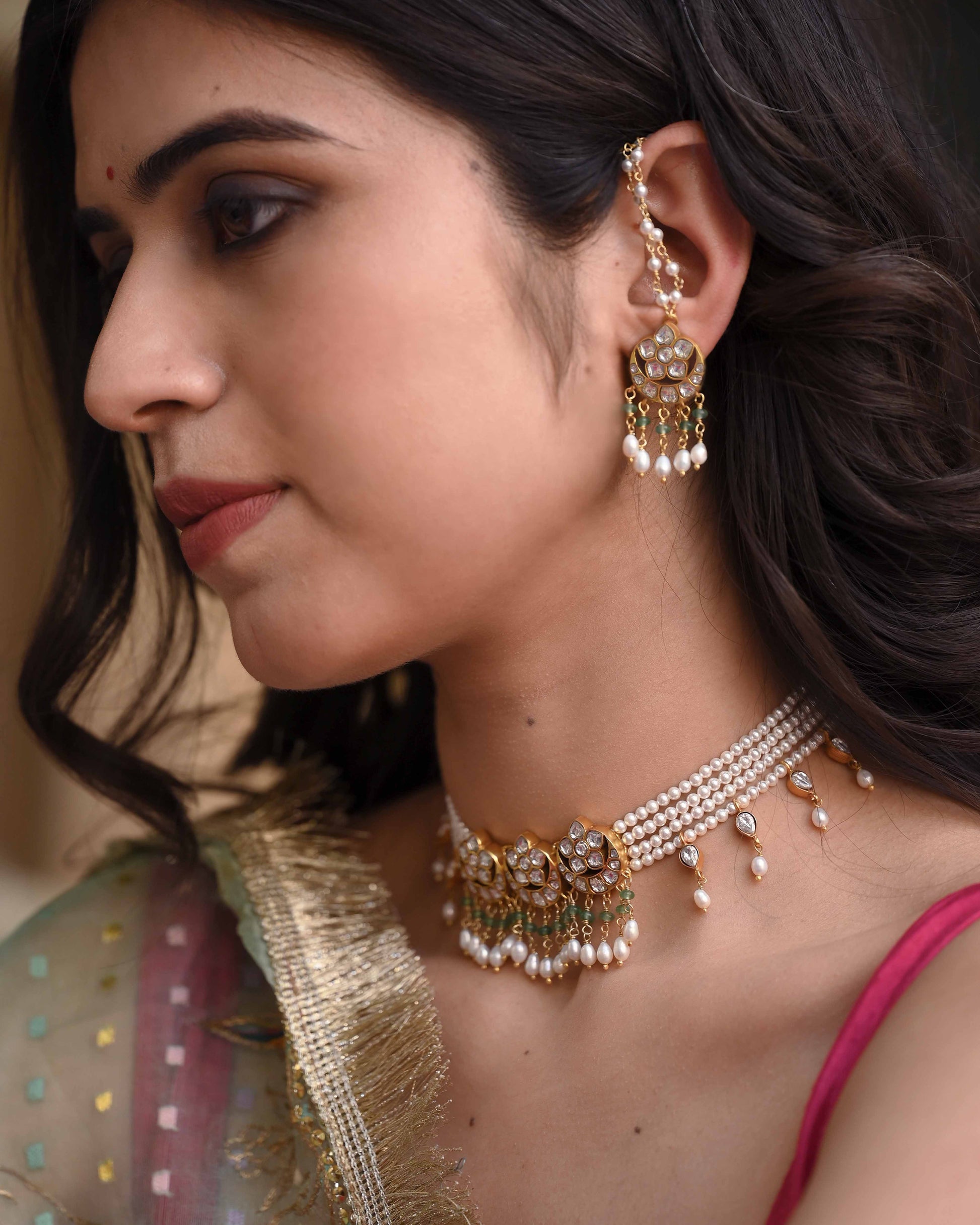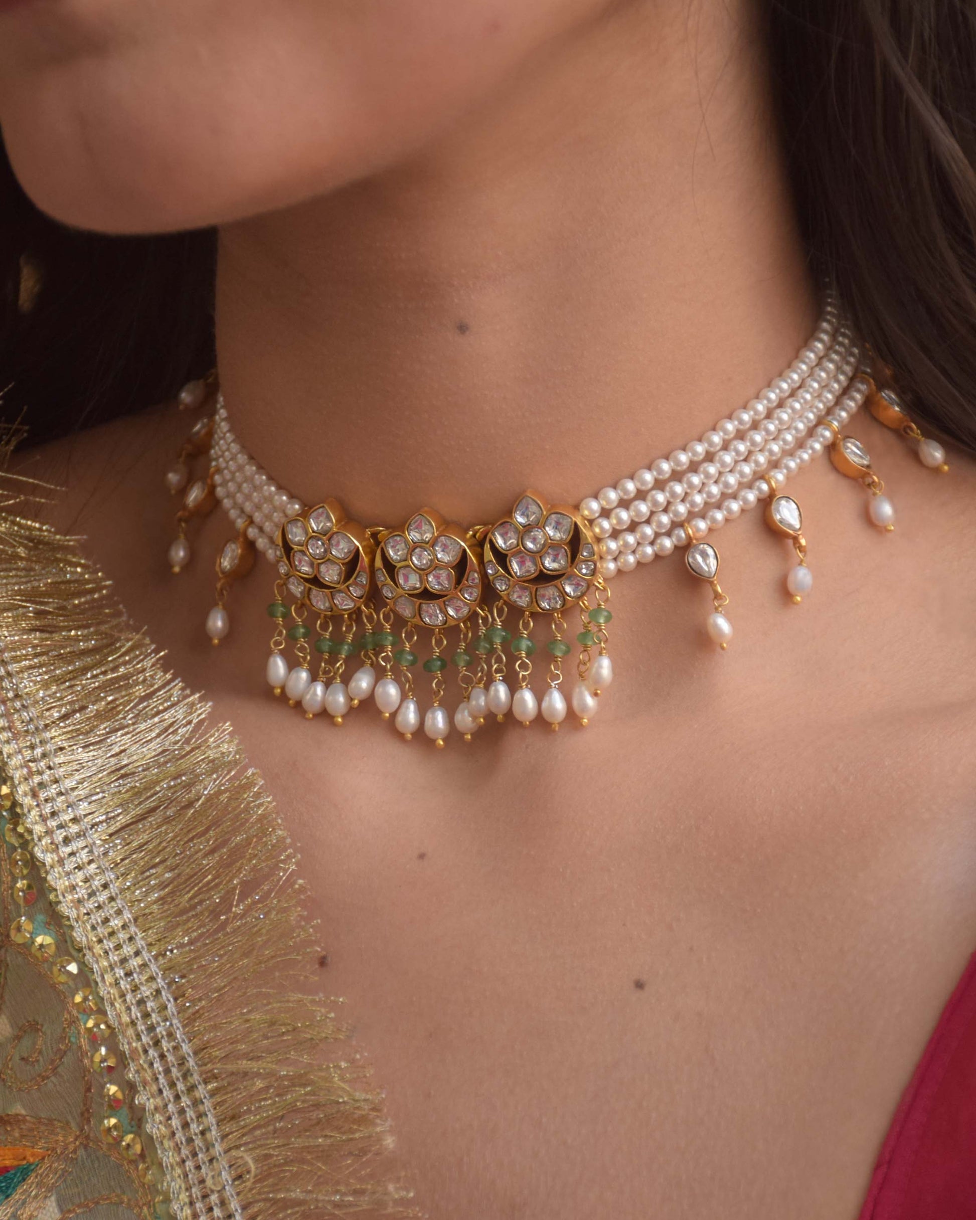 Our Indian pearl choker necklace showcases three classic chaand-phool motifs, each adorned with hanging rice pearls and green aventurine beads. Enhanced by four lines of shell pearls, the Roop choker features drop-shaped units embellished with pearls. Meticulously crafted in 925 silver, it exudes sophistication and charm.