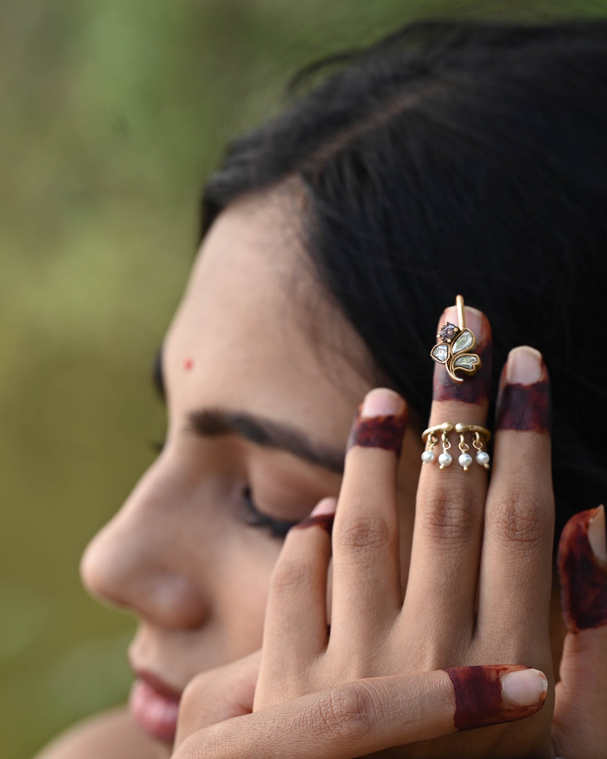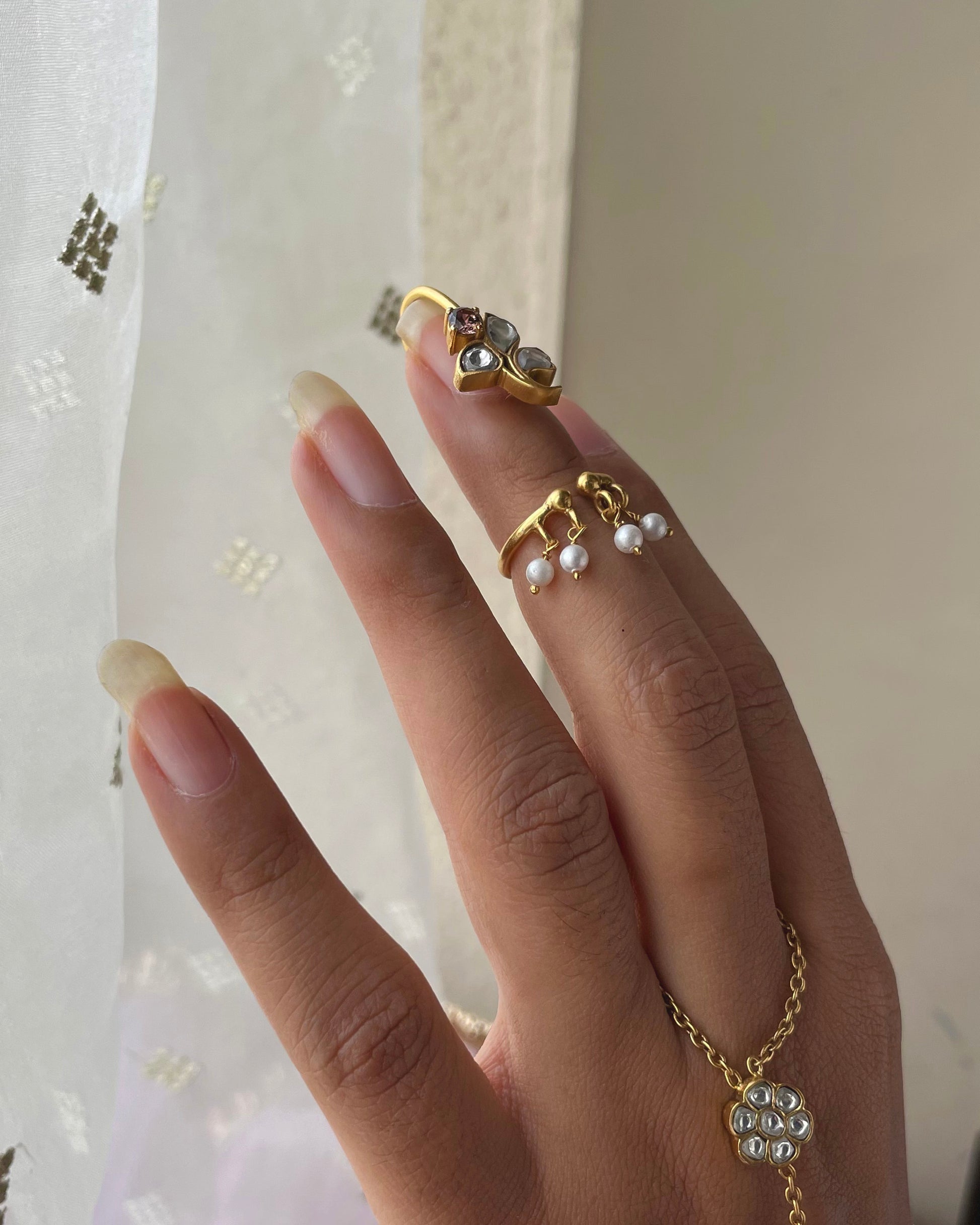 A striking and one-of-a-kind statement piece, this nail ring is the perfect blend of boldness and elegance. Inspired by the beauty of flowers, the design features a stunning floral motif studded with radiant jadau stones, with delicate freshwater pearls hanging gracefully at the base. The pearls gently caress your fingertips. With its adjustable design, this piece offers a perfect fit, ensuring comfort while adding a touch of sophistication to your style.