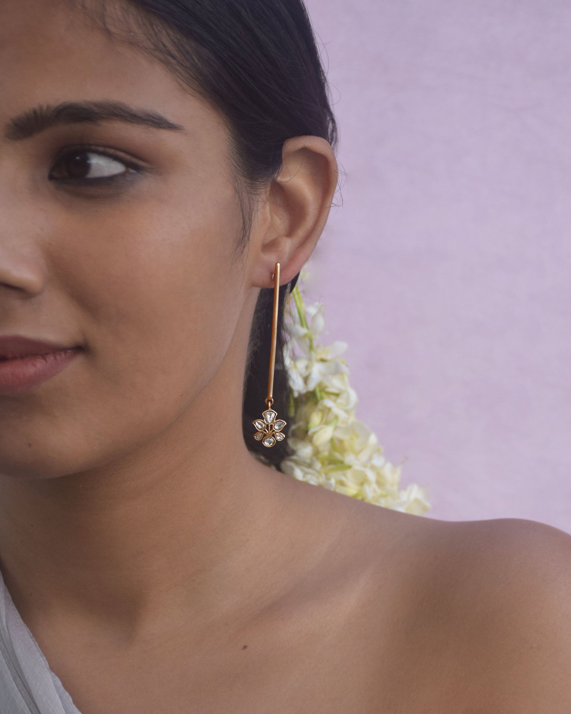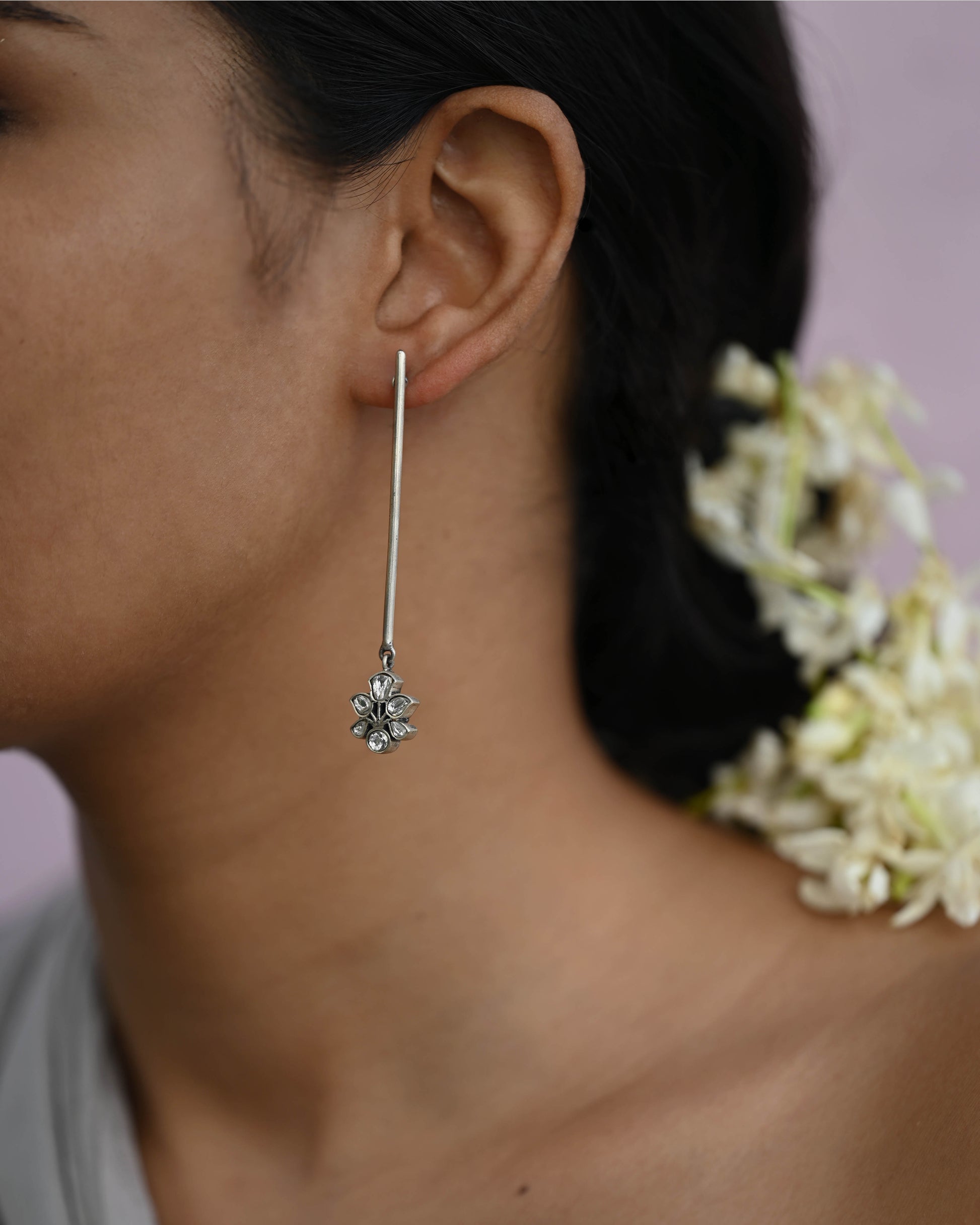 These stunning Latkan earrings are a celebration of simplicity and elegance. Featuring a sleek linear design, the earrings showcase a delicate long pipe adorned with a beautiful floral motif at the end, intricately studded with radiant jadau white stones. Crafted in 92.5 sterling silver, their minimalistic form adds a timeless charm, making them the perfect statement piece for any occasion.