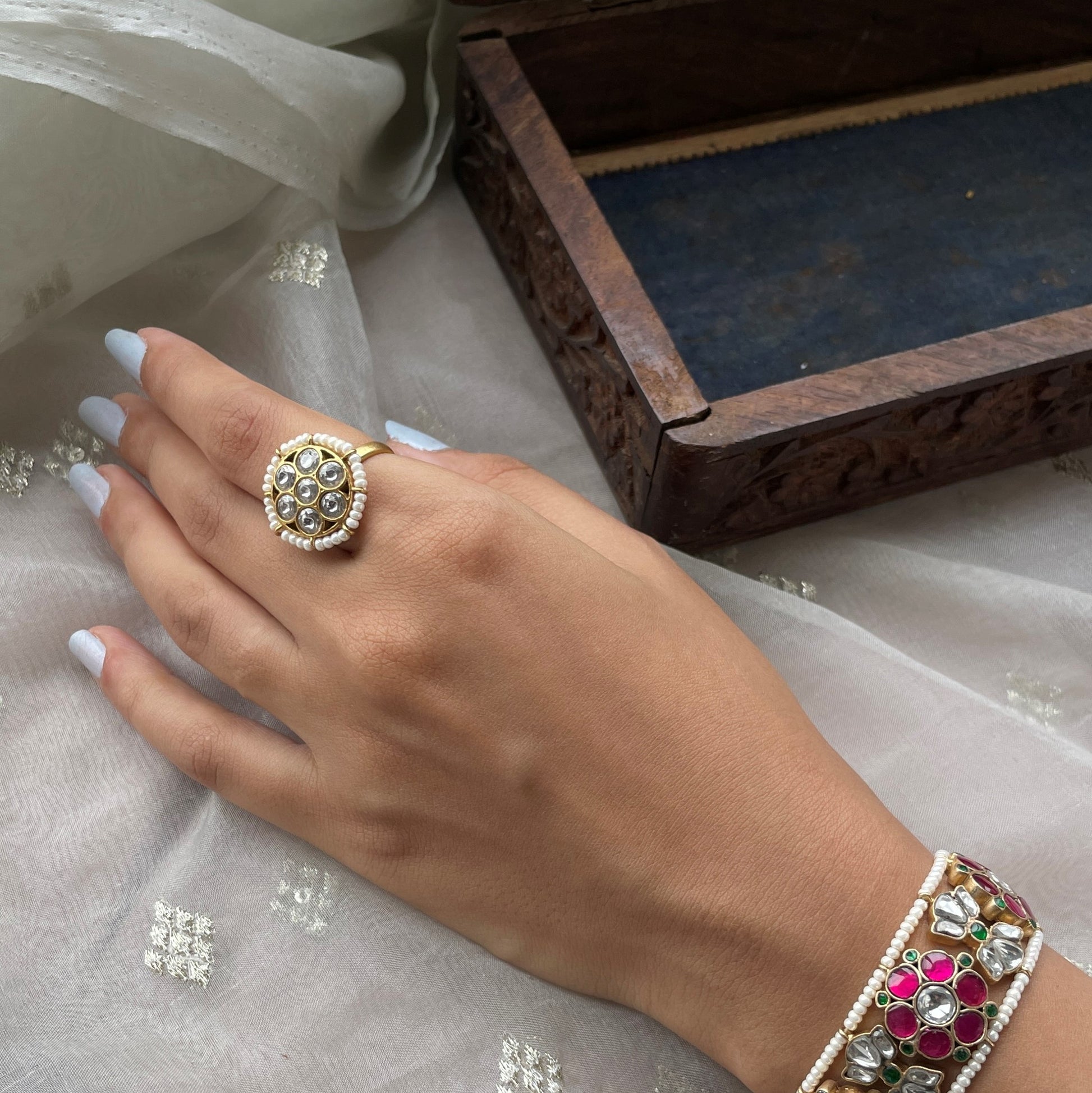 Embrace heritage with a touch of today. With white jadau stones gracefully accented by a delicate line of luminous pearls, the Mogra Ring is your statement of classic charm in the modern world.