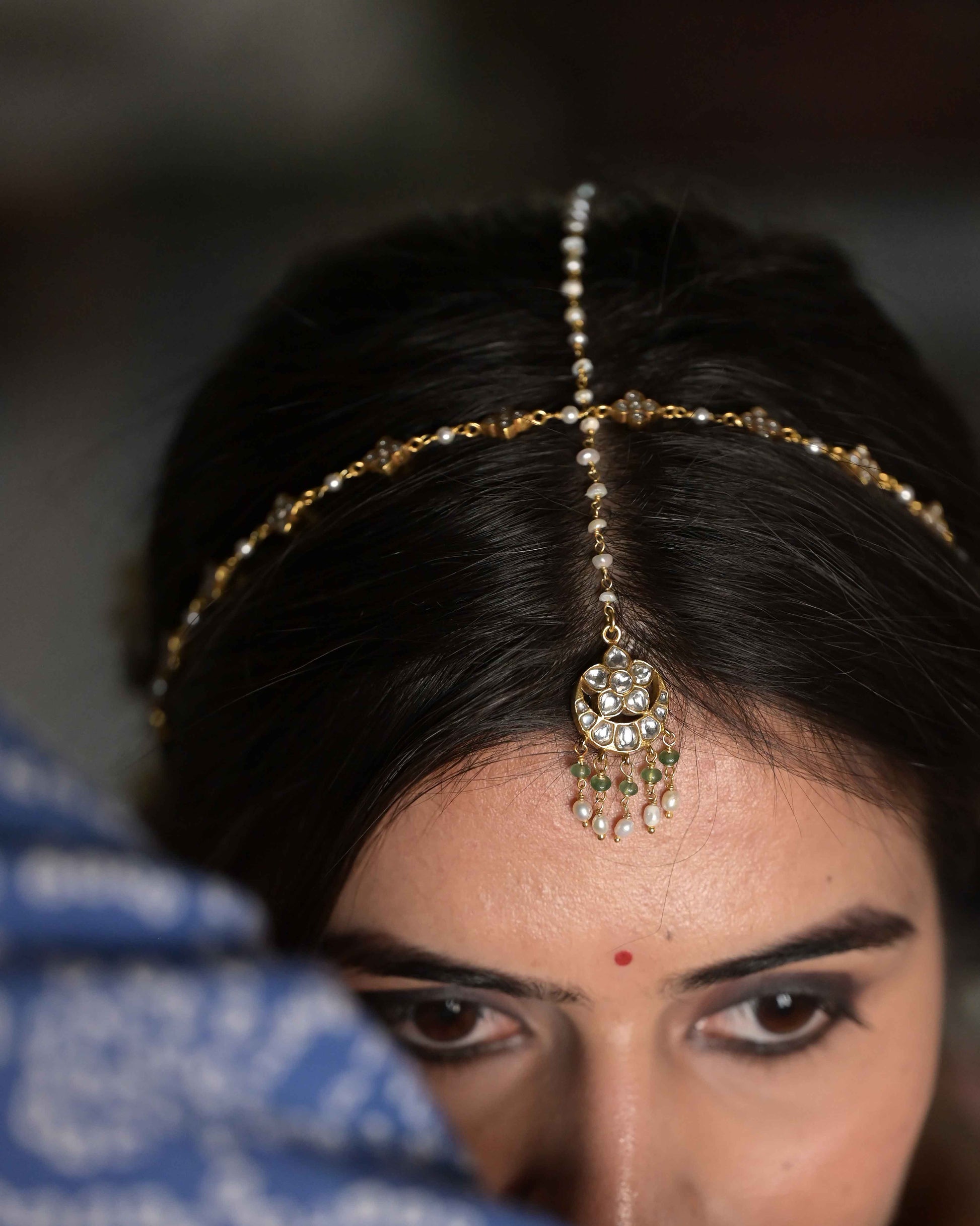 The Suratiya Maangtika crafted in 925 silver is your ultimate head ornament for every festive occasion. Versatile and timeless, this tika features a stunning chaand motif design adorned with delicate rice pearls and green aventurine beads, ensuring it complements any ensemble effortlessly.