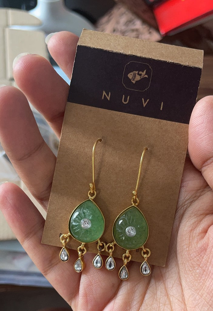 Discover the fusion of contemporary style with a touch of Indian flair in our Taranngi Hoop Earrings. These earrings feature a pear-shaped carved aventurine stone complemented by drop-shaped jadau units, achieving a timeless and chic look suitable for both casual and Indian attire.