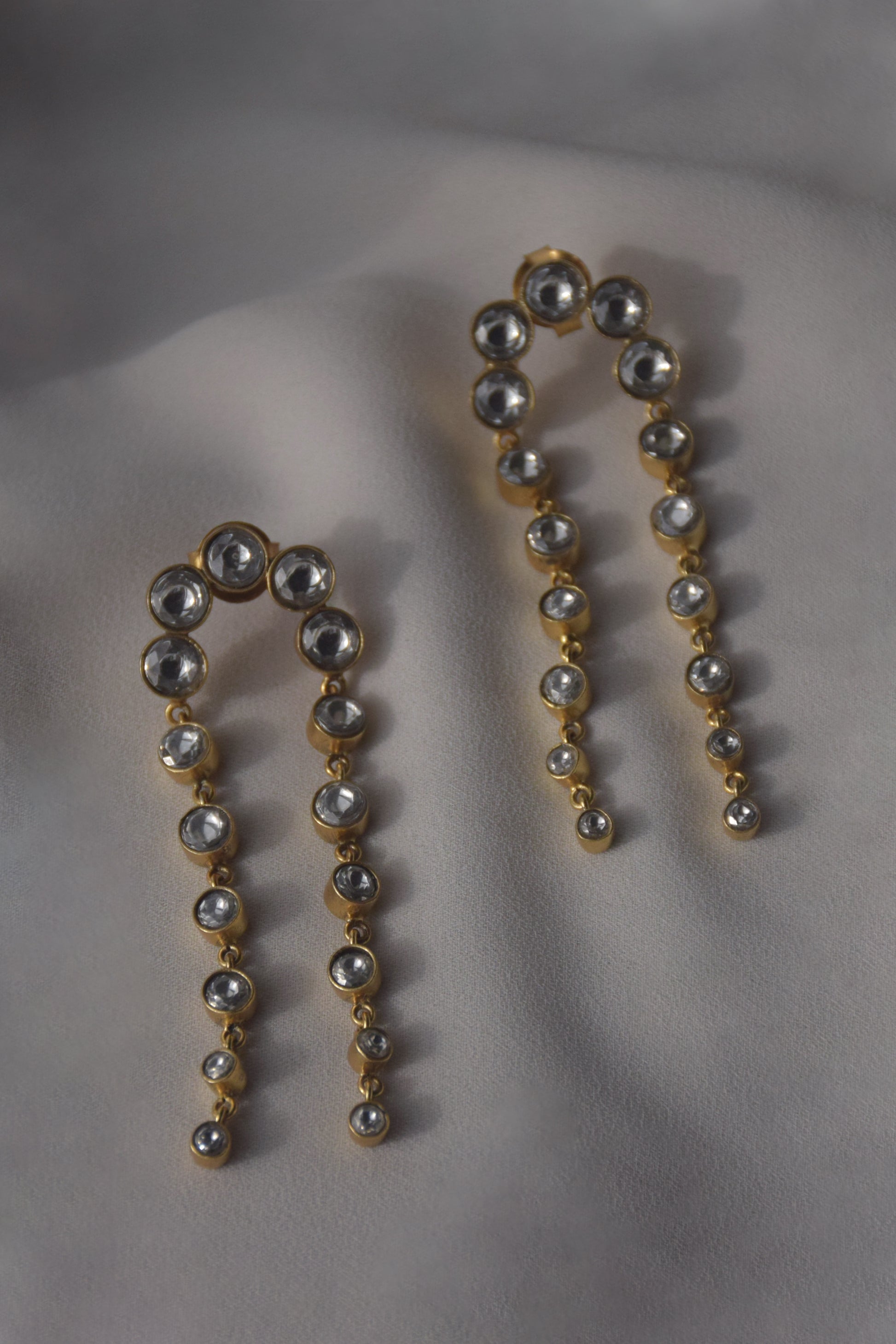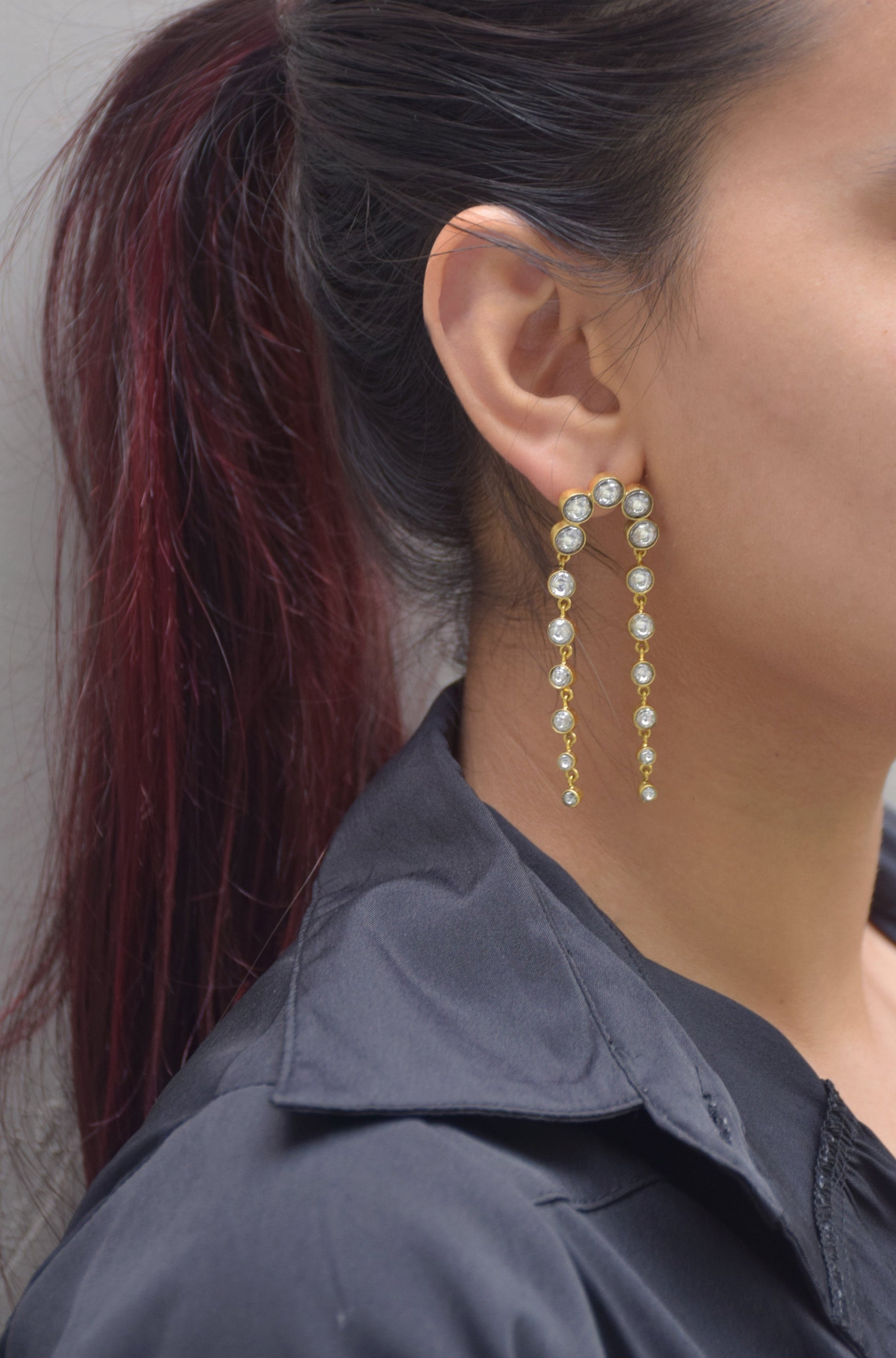 Step into the night with grace in the Tarangini Earrings, meticulously crafted in 925 silver. These captivating earrings sway with each step, featuring a continuous chain of Jadau stone collets for effortless movement. They are the perfect statement piece to complement your classy gown at a night soiree.