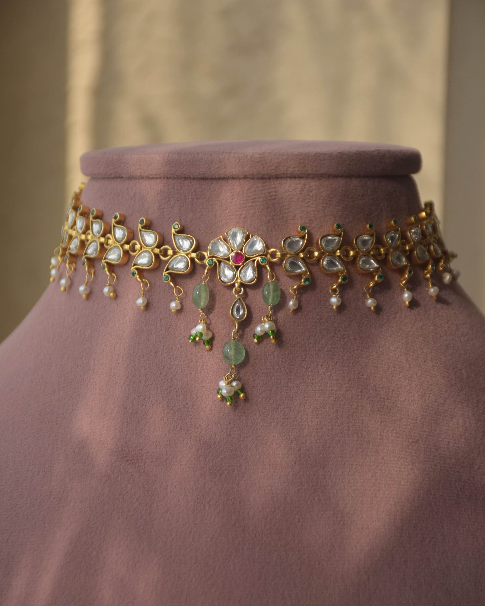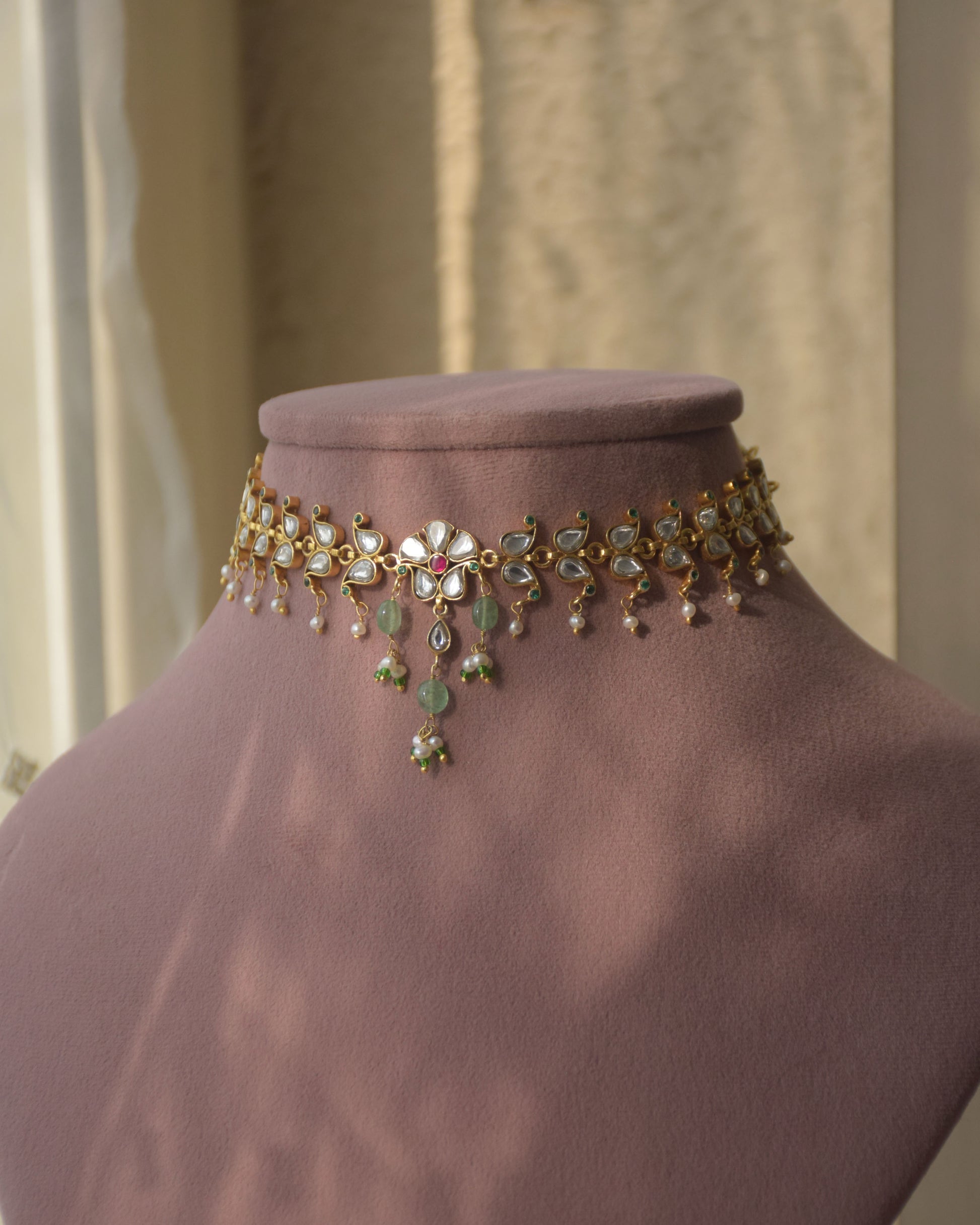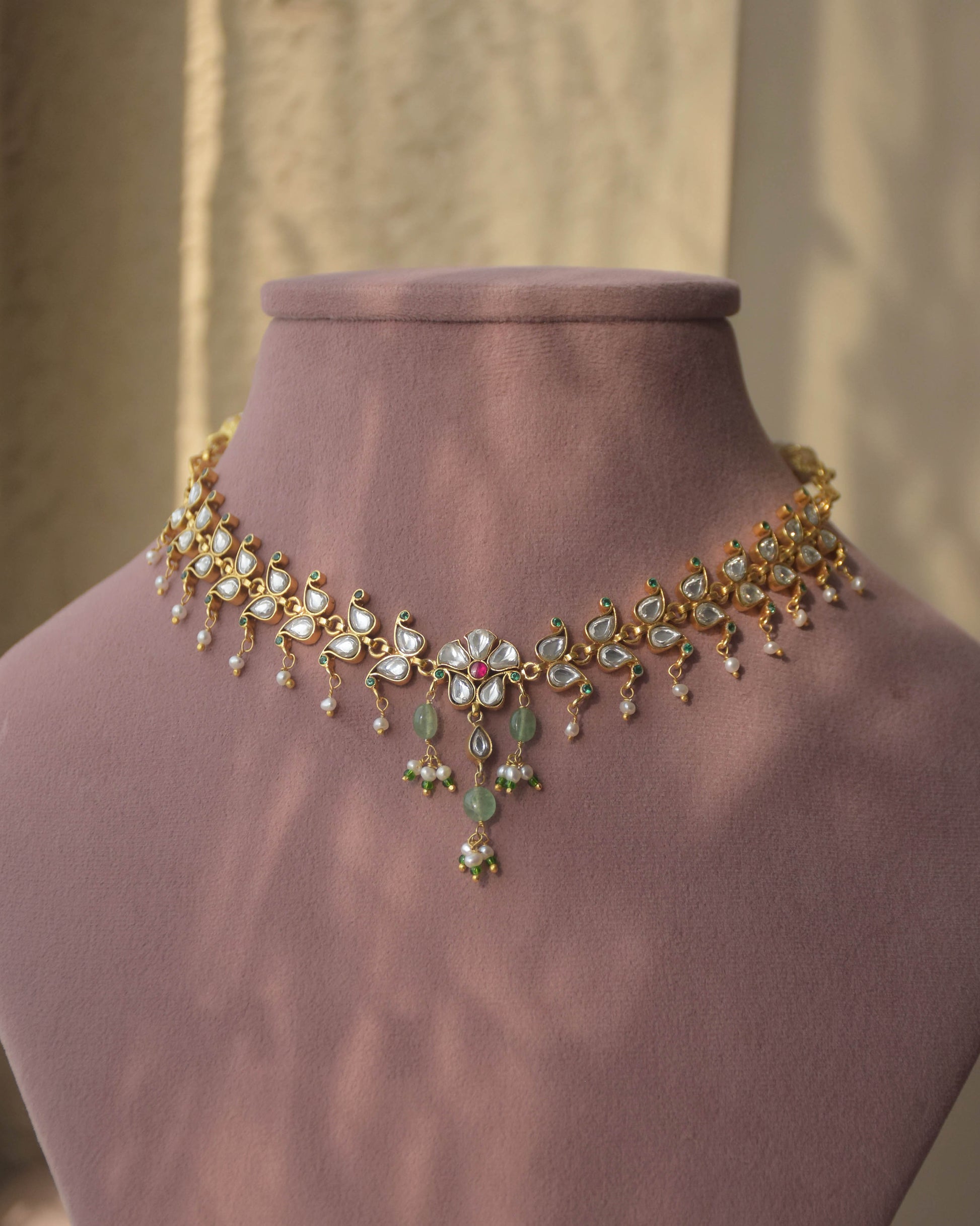 The Vanya Necklace is a true testament to artistry, handcrafted in 92.5 silver and adorned with exquisite jadau work. It flows seamlessly with line of paisleys and gracefully finished with pearl drops.